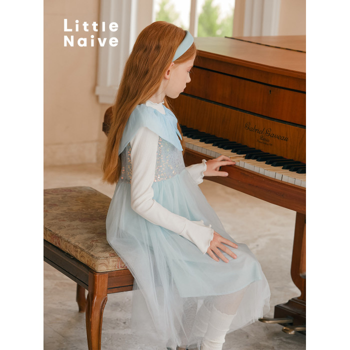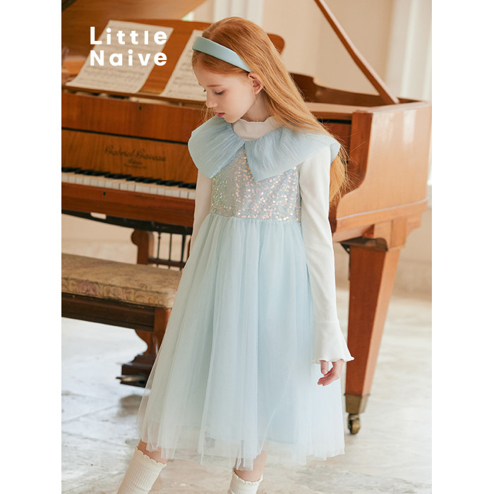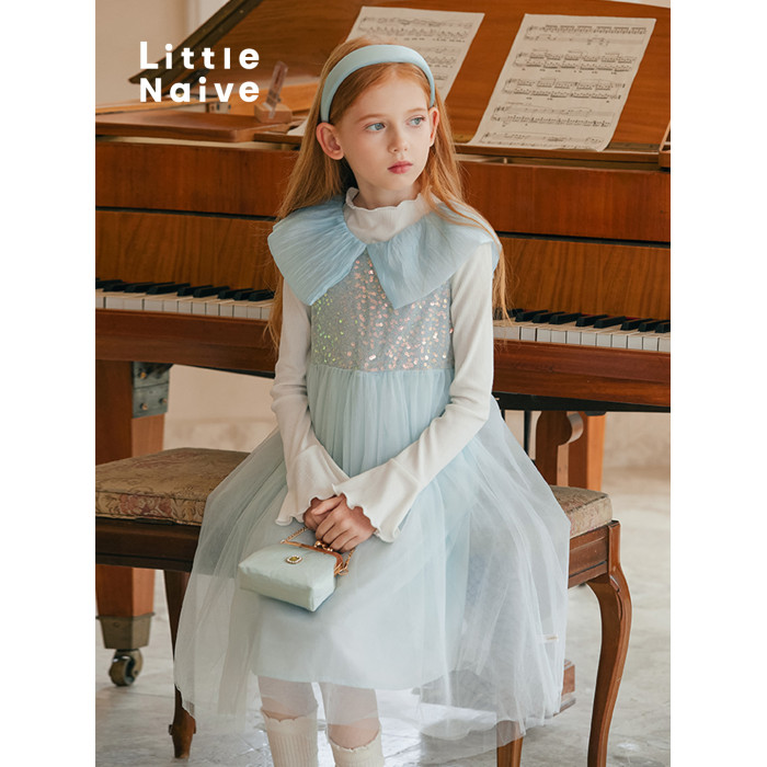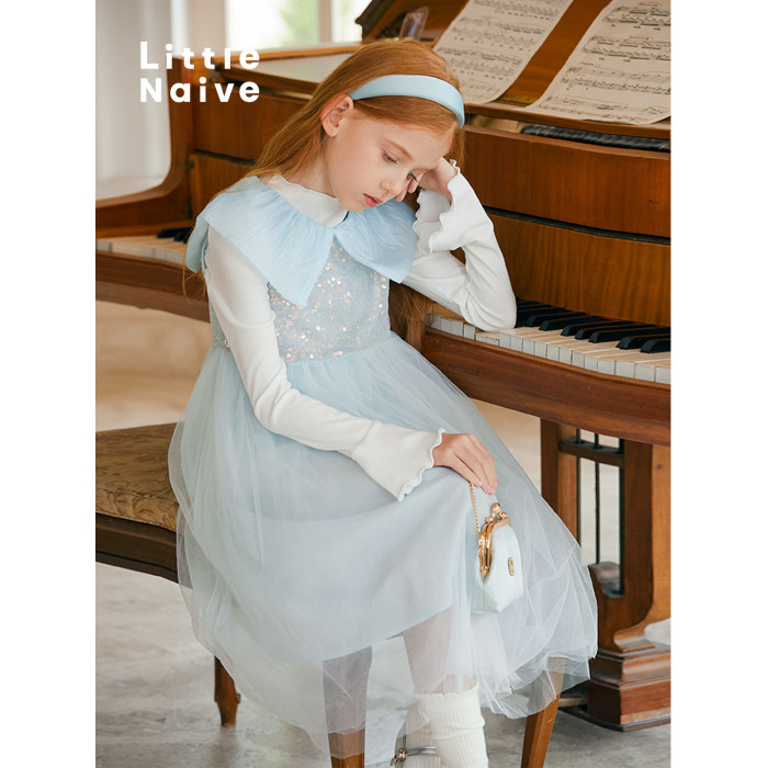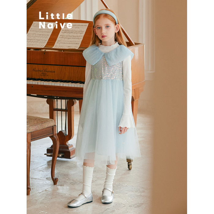 LittleNaive女童連衣裙夏季公主裙新款花瓣領兒童珠片蓬蓬網紗裙