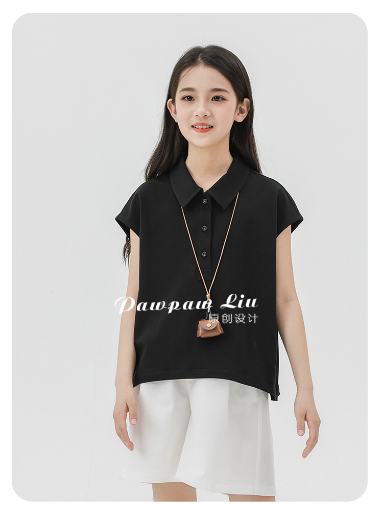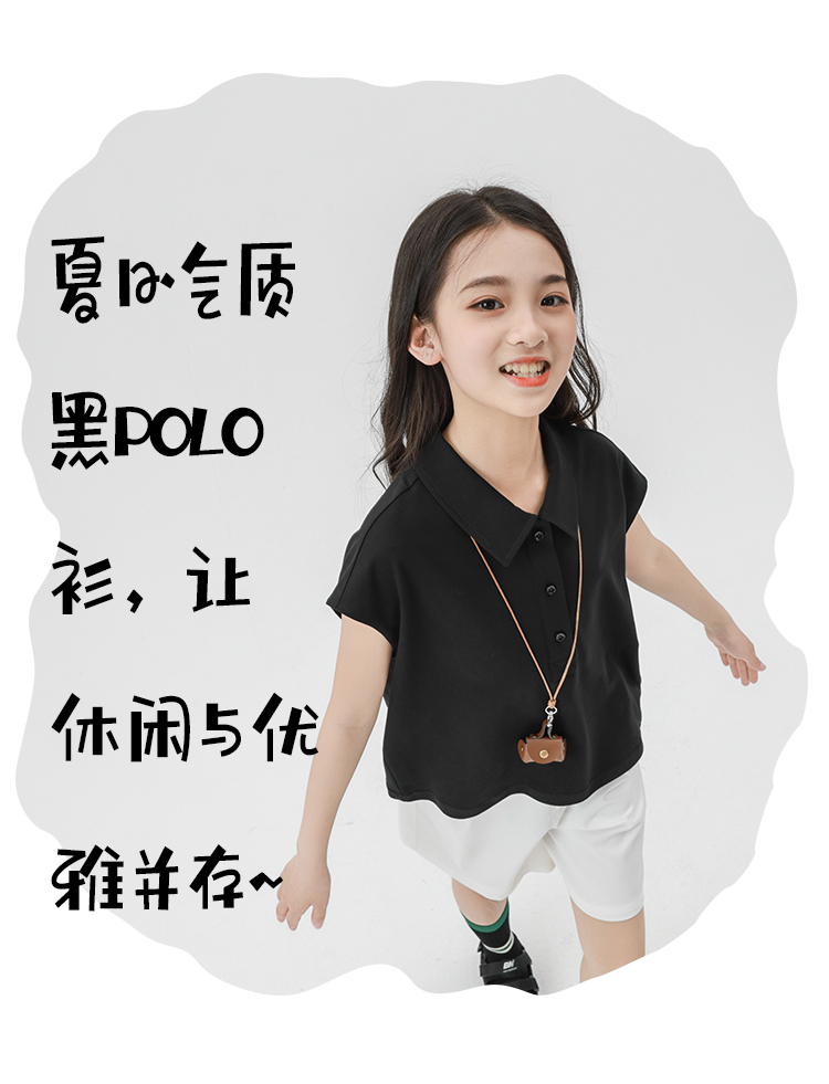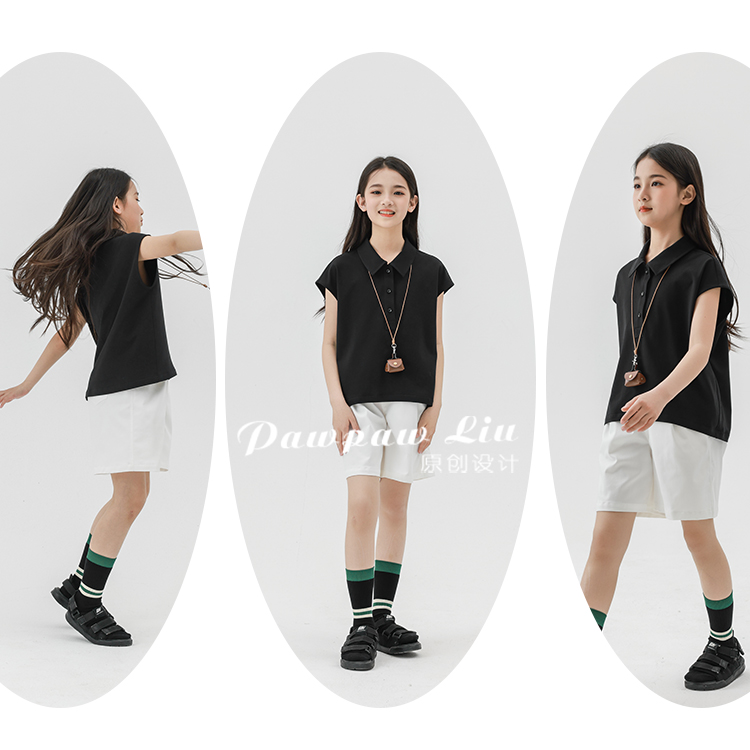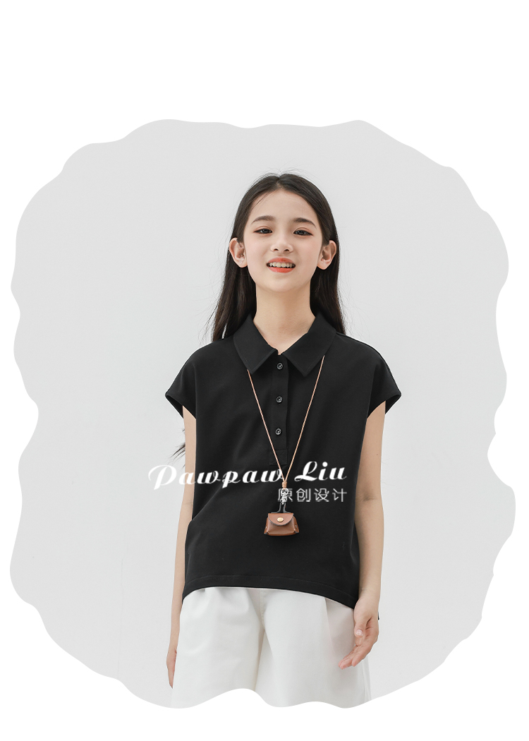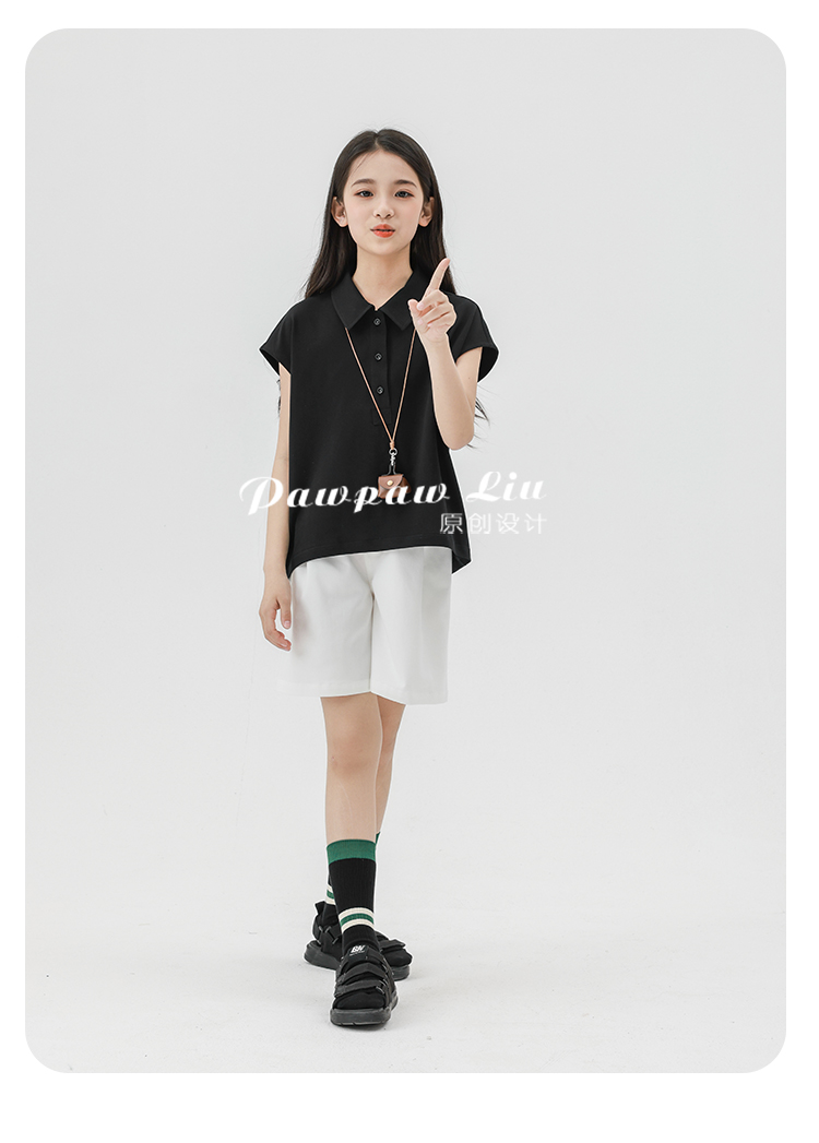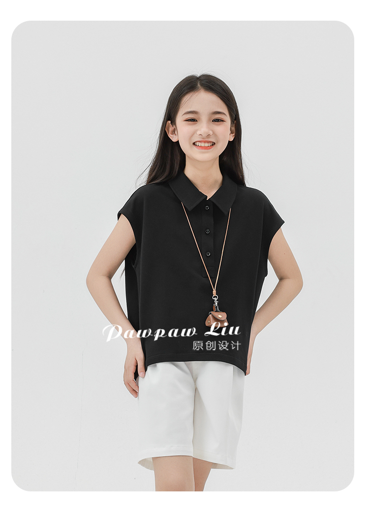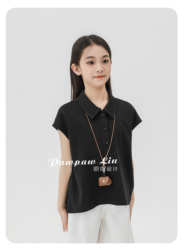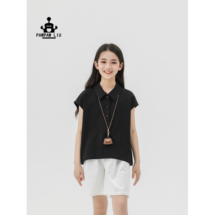 Pawpaw liu原創設計女童短袖t恤2025夏季新款兒童氣質黑色polo衫