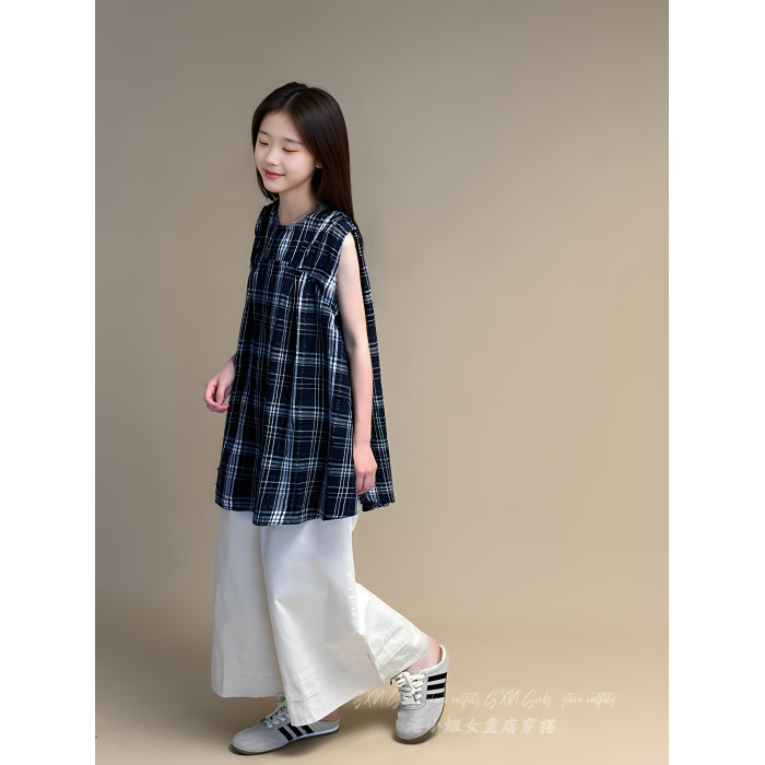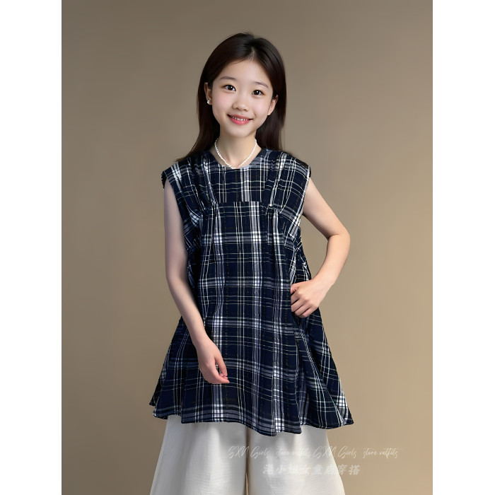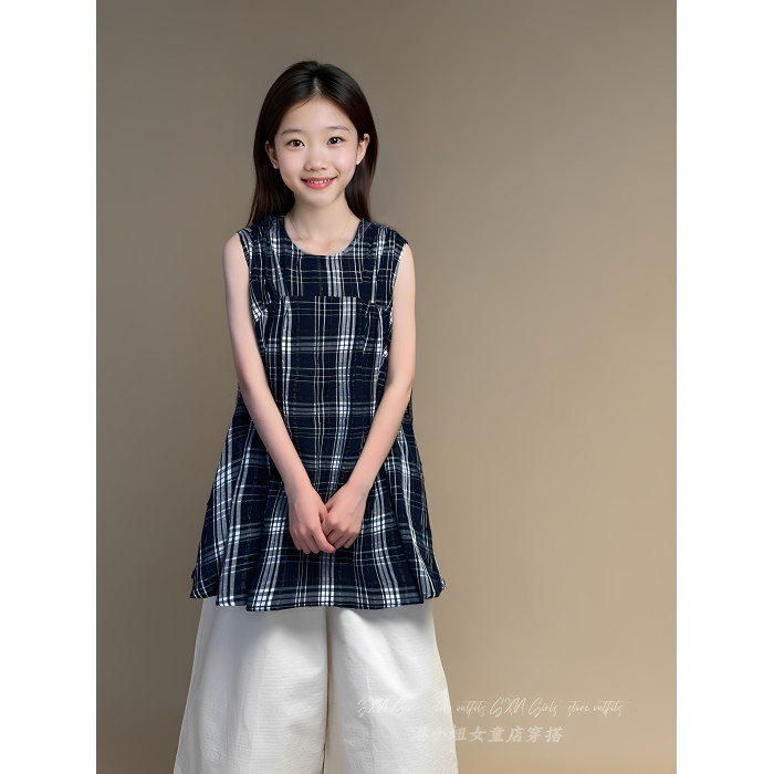 GXN女童氣質大擺圍飄逸上衣2025夏日新中大童森系格子無袖娃娃衫