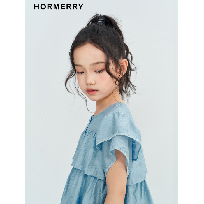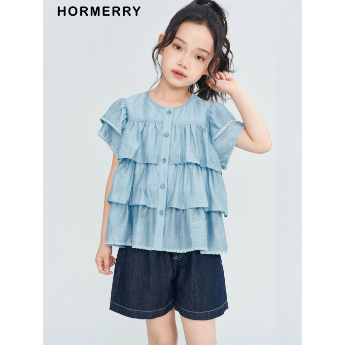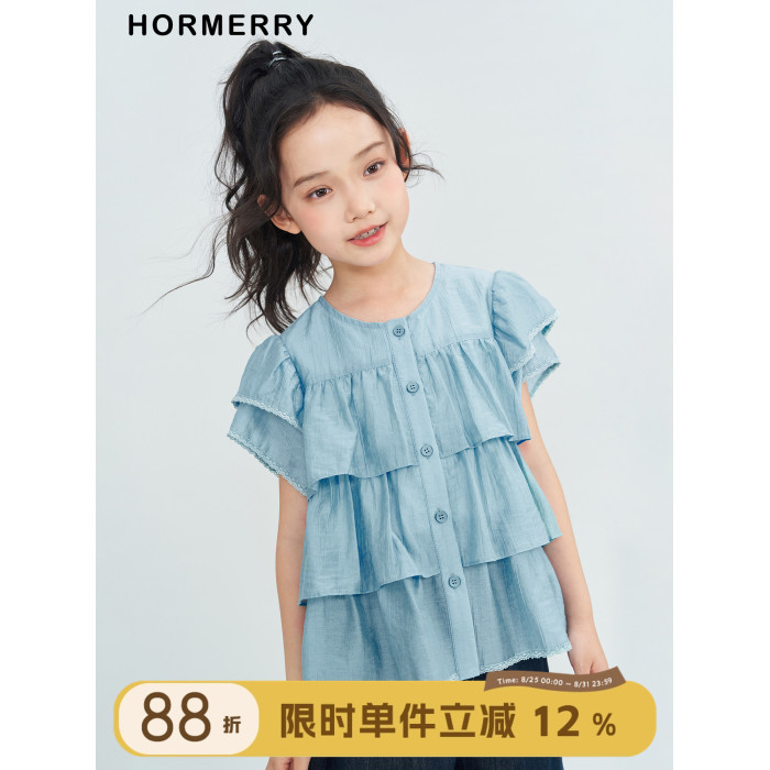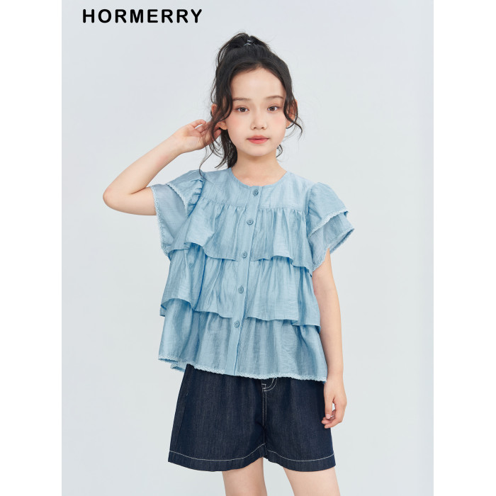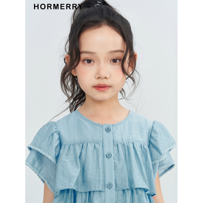 赫米童裝2025夏季新款花邊蛋糕小飛袖娃娃衫女童短袖襯衫森系開衫