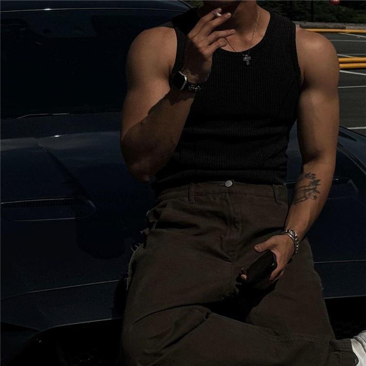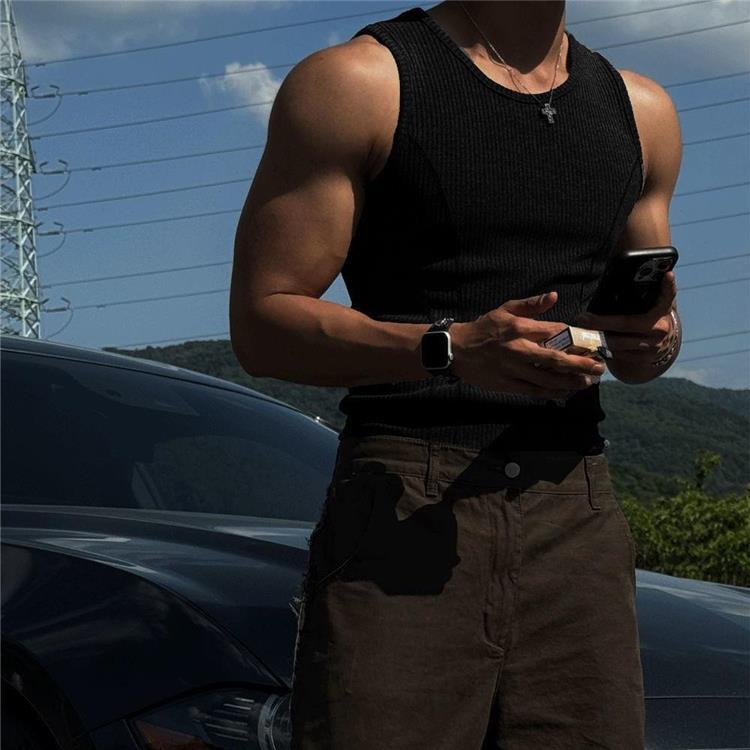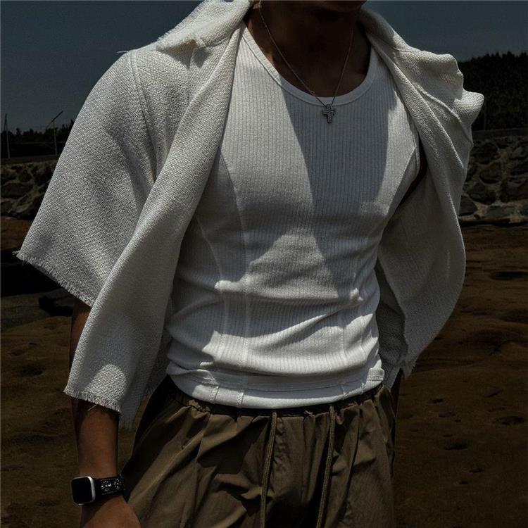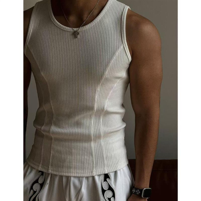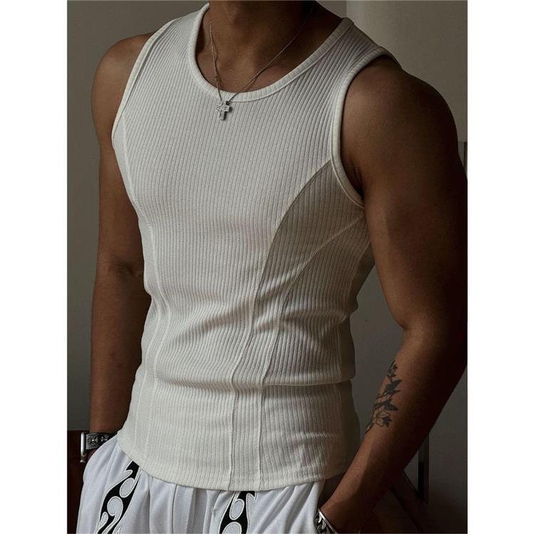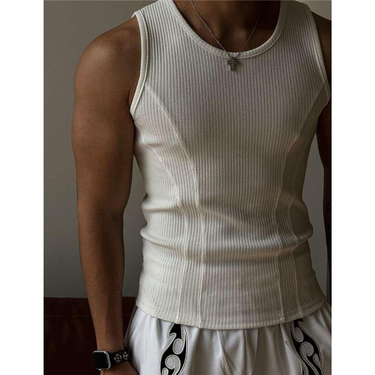 美式背心男士夏季螺紋竪條紋修身彈力健身衣拼接緊身打底無袖坎肩