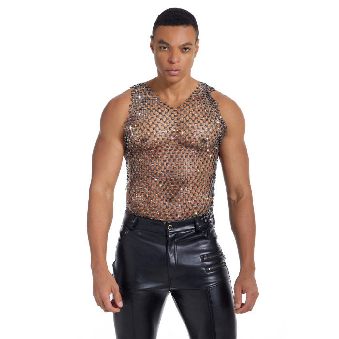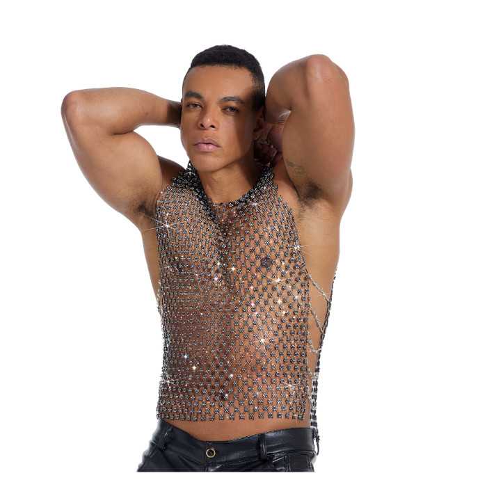 男士網紗金屬鏈拼接形體健身衣緊身高彈力閃亮透明性感男背心GOGO