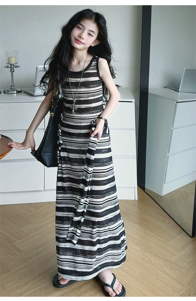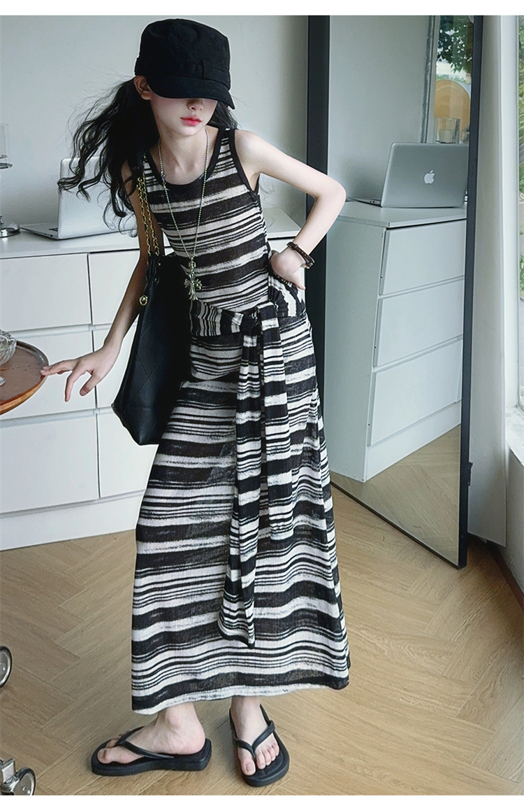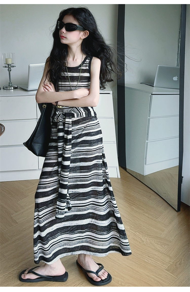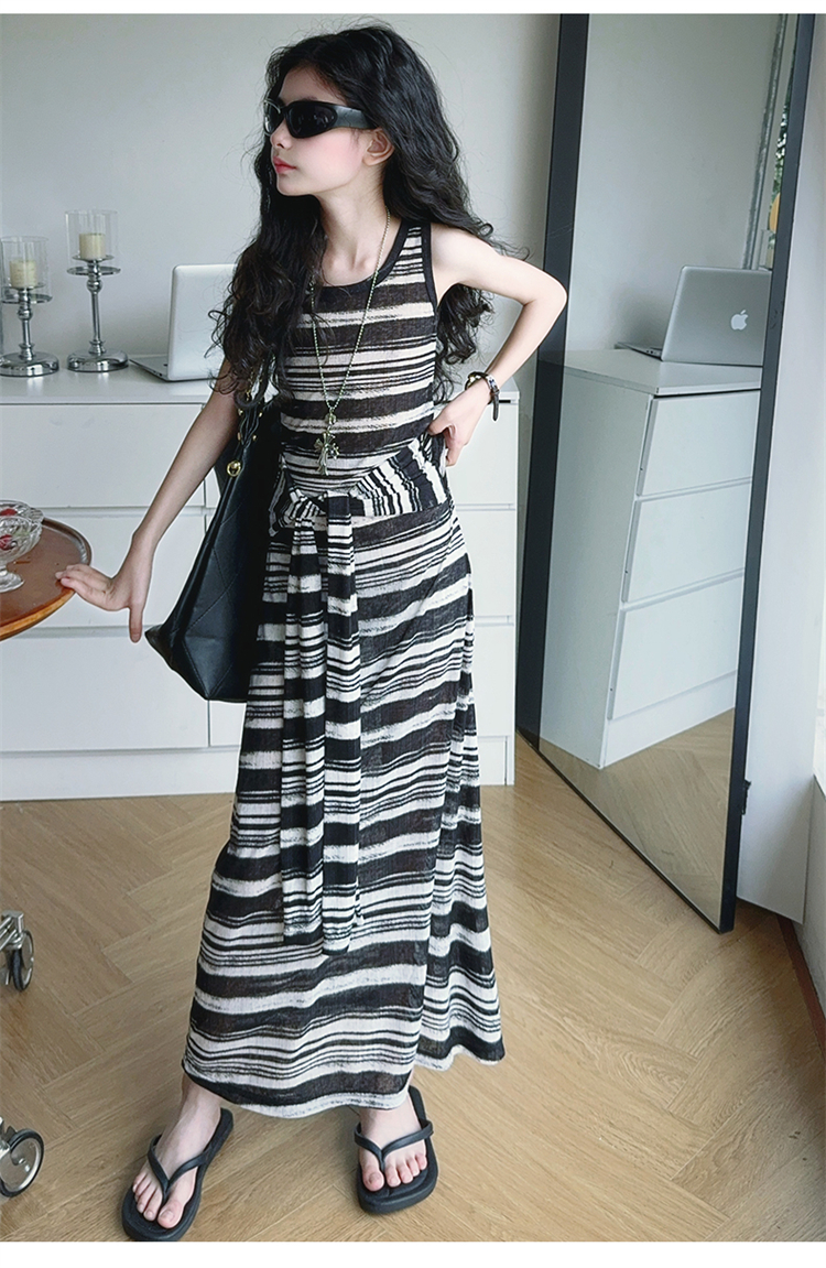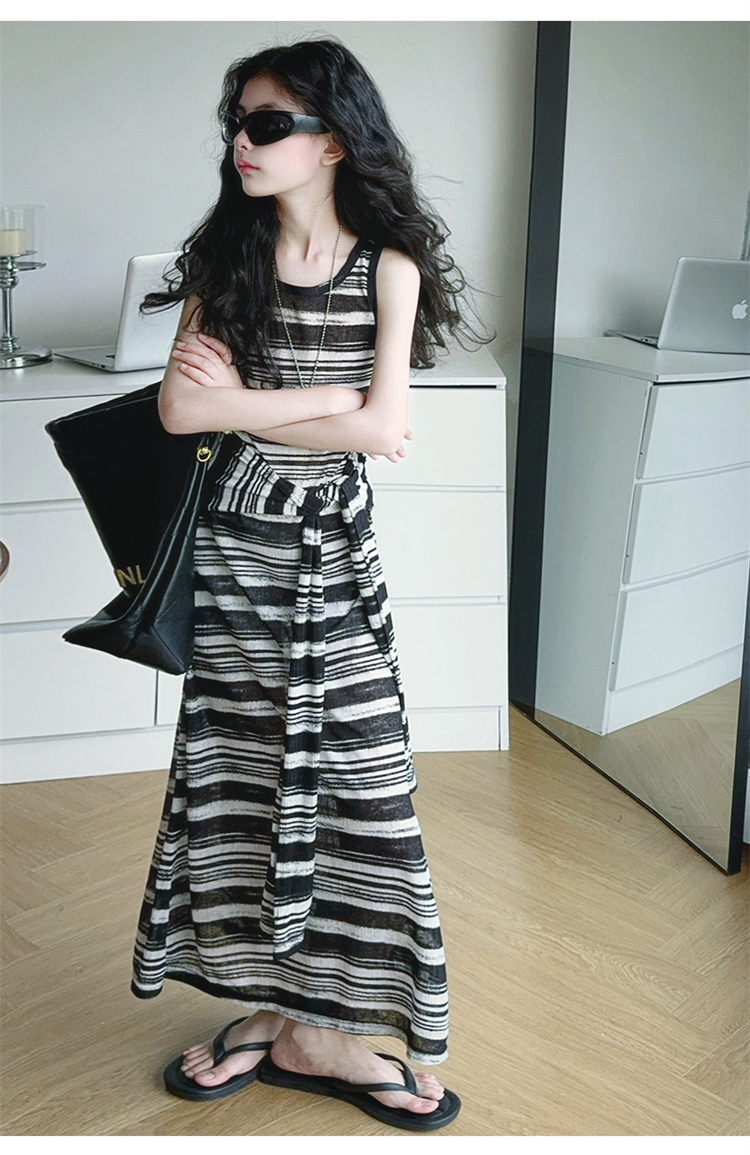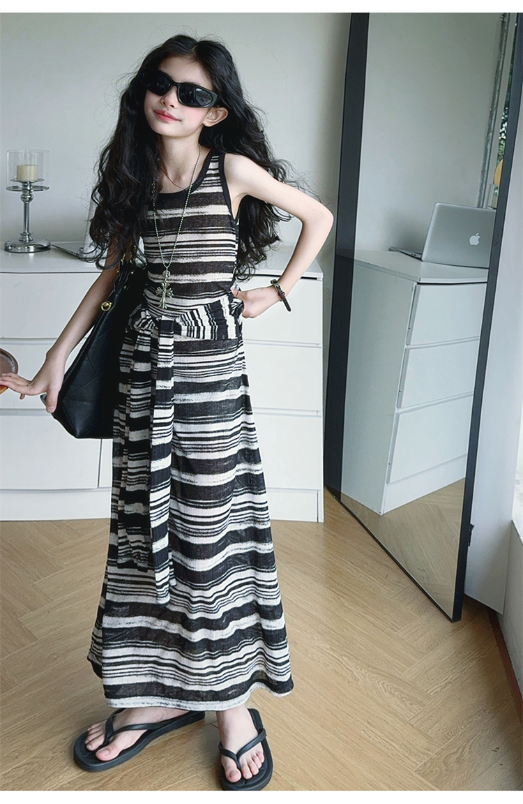 女童連衣裙兒童條紋背心裙2025年新款中大童無袖假兩件夏裝休閒裙