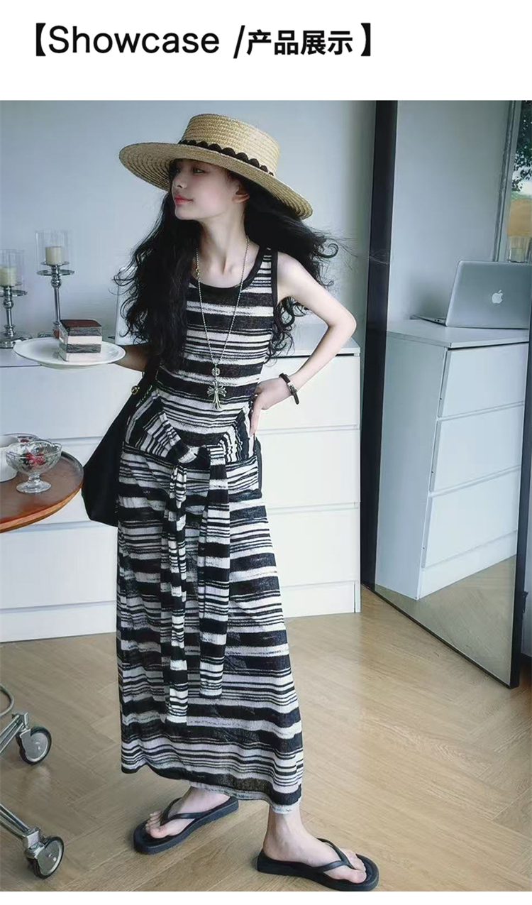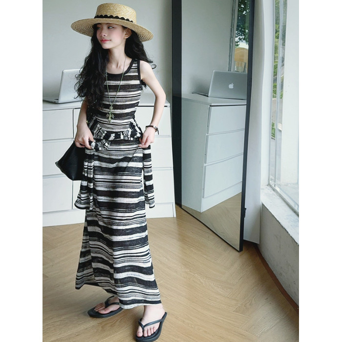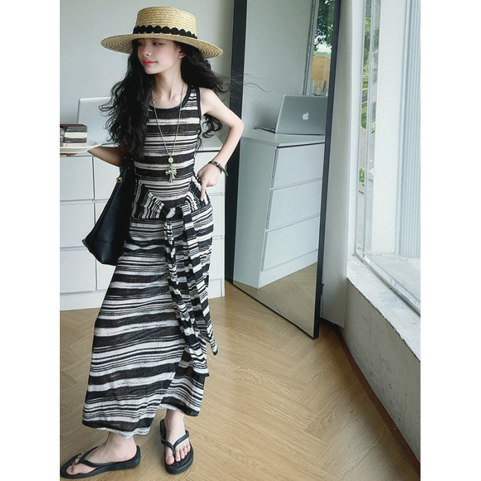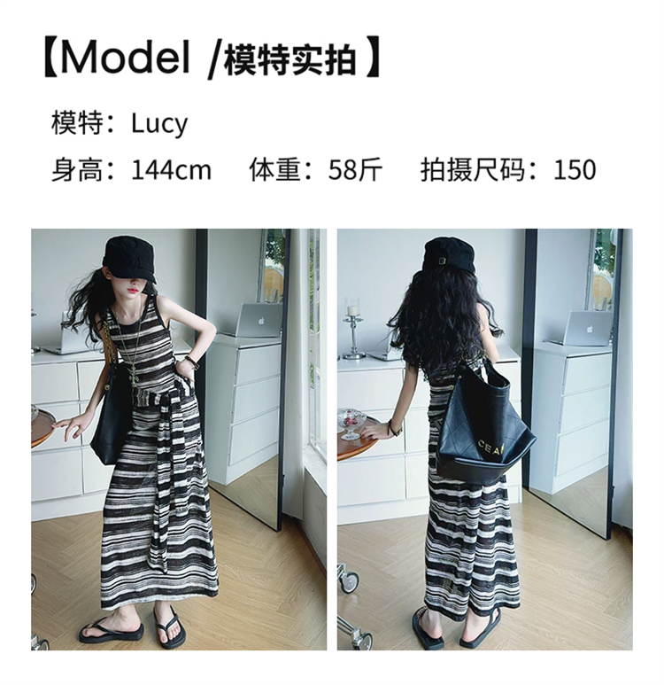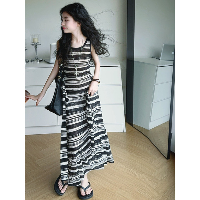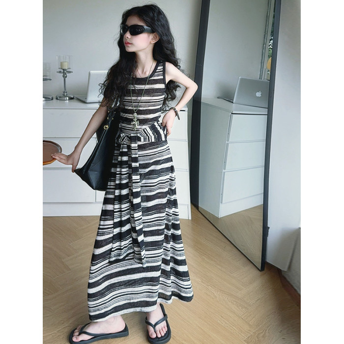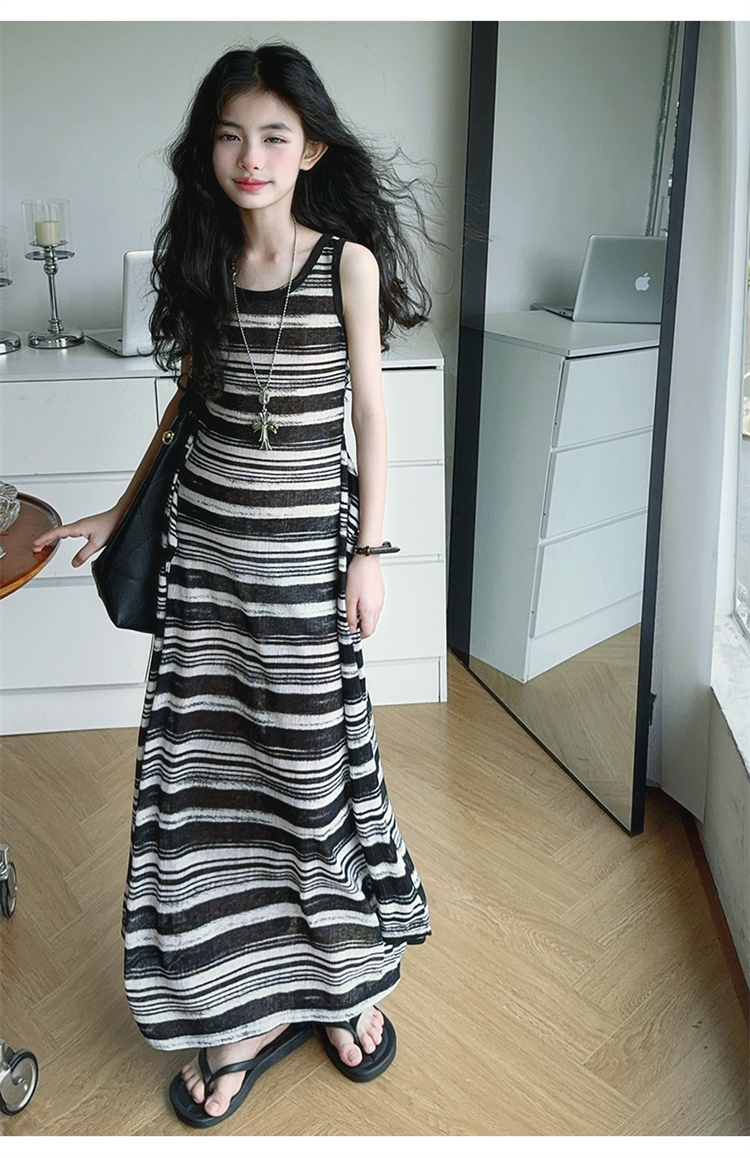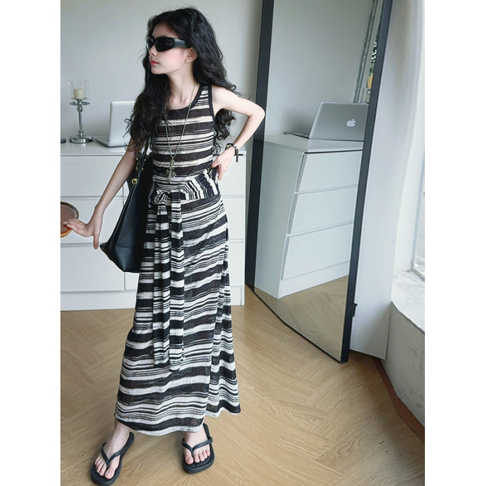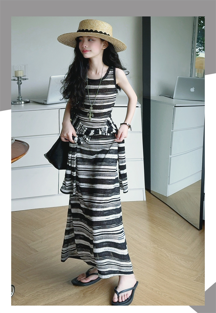 女童連衣裙兒童條紋背心裙2025年新款中大童無袖假兩件夏裝休閒裙