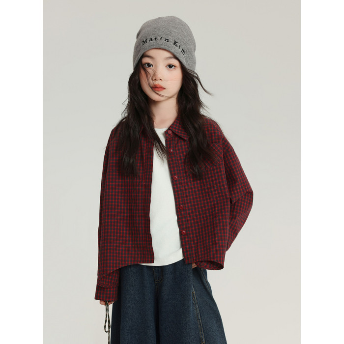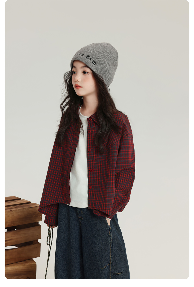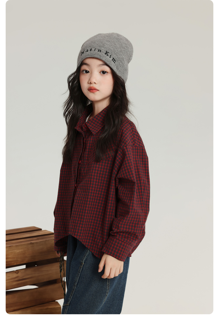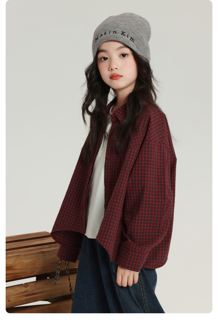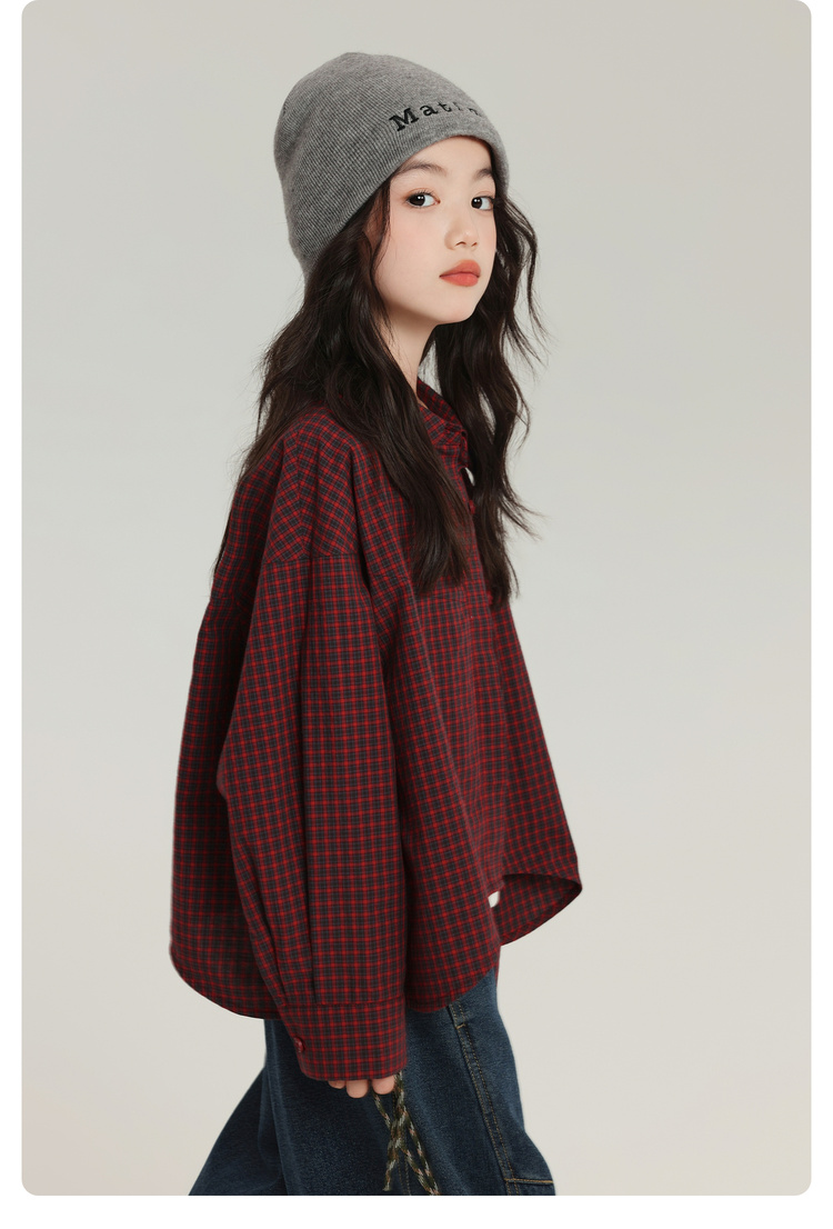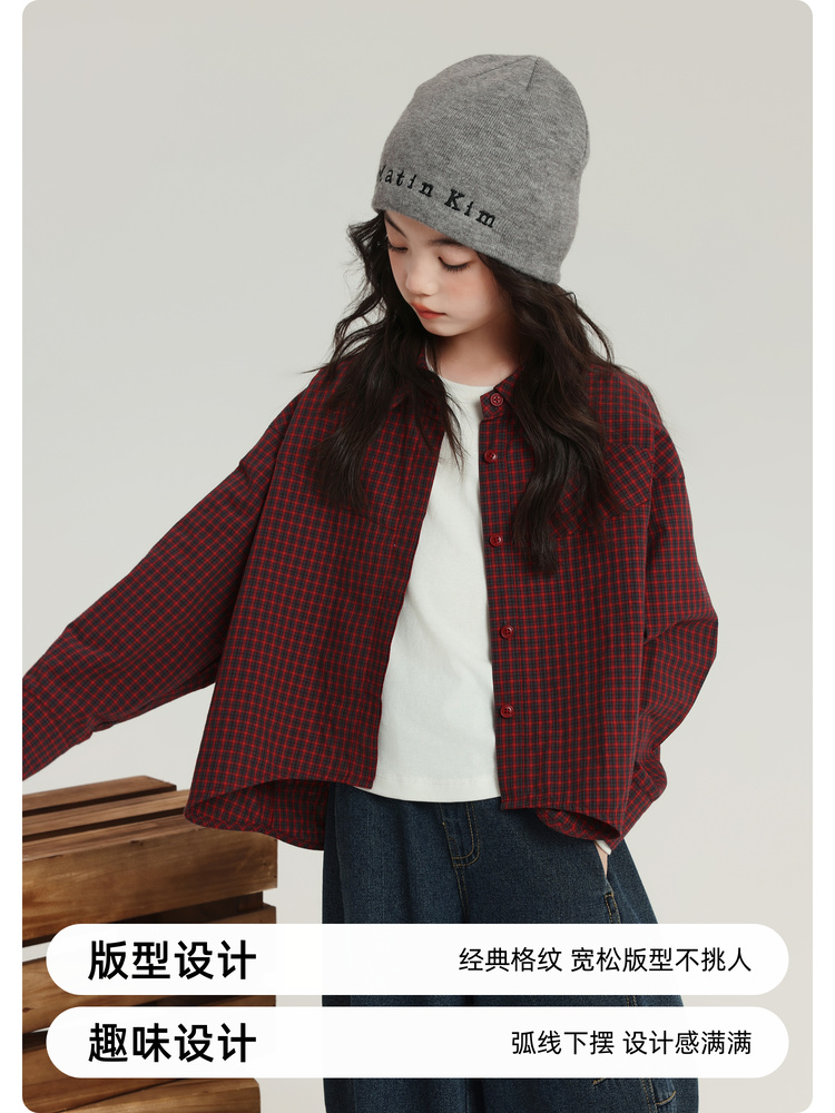 布丁哈魯春秋女童韓系外套2025秋裝新款兒童洋氣紅色格紋襯衫