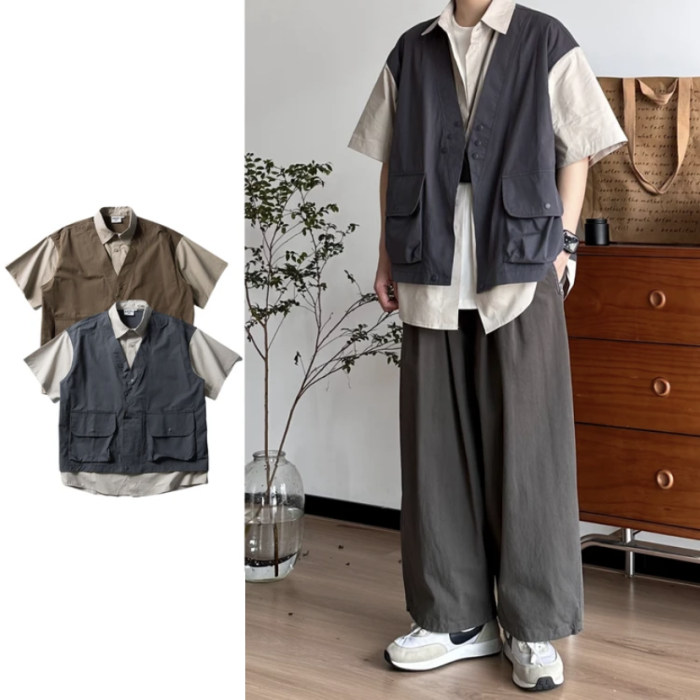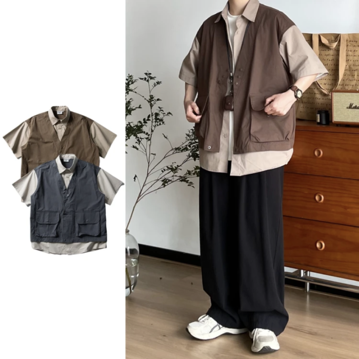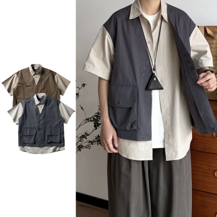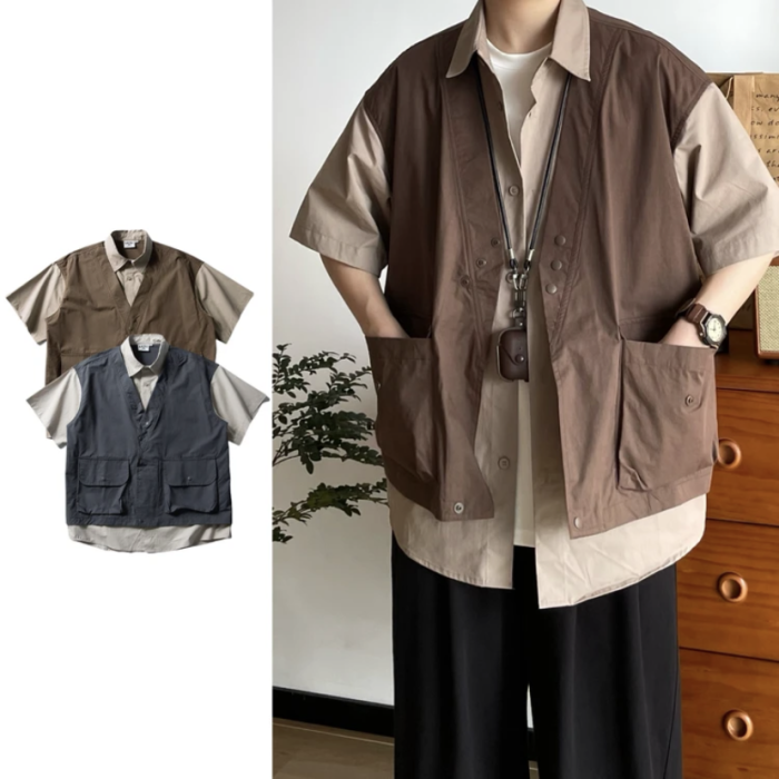 兩件裝/單件日系復古工裝短袖襯衫男寬松休閒假兩件馬甲襯衣外套