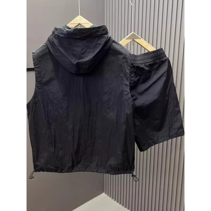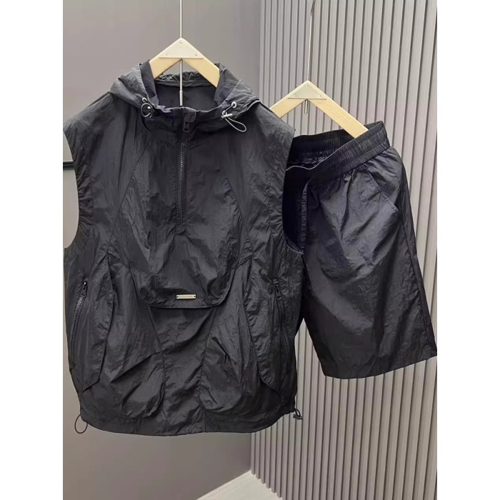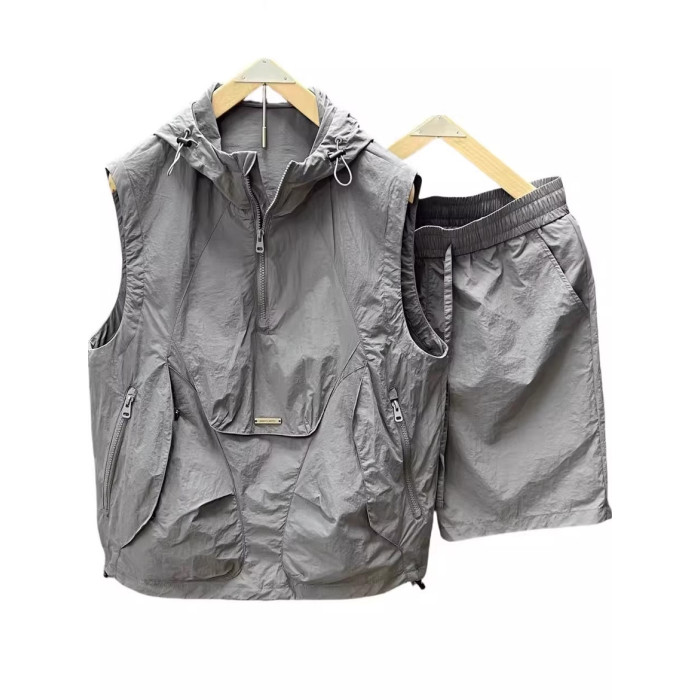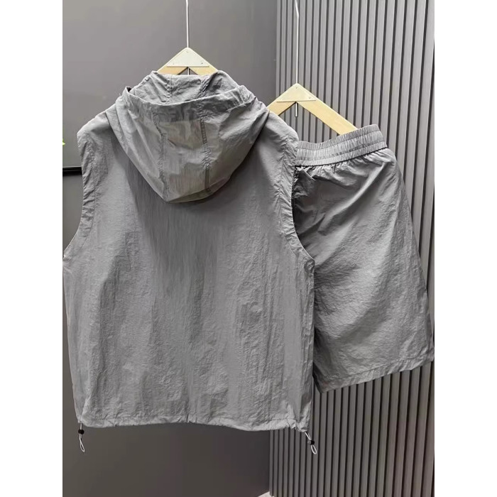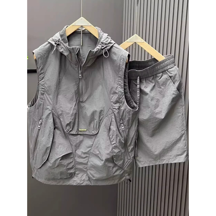 特大碼300斤連帽馬甲短褲套裝男夏季工裝薄款寬松無袖坎肩兩件套2