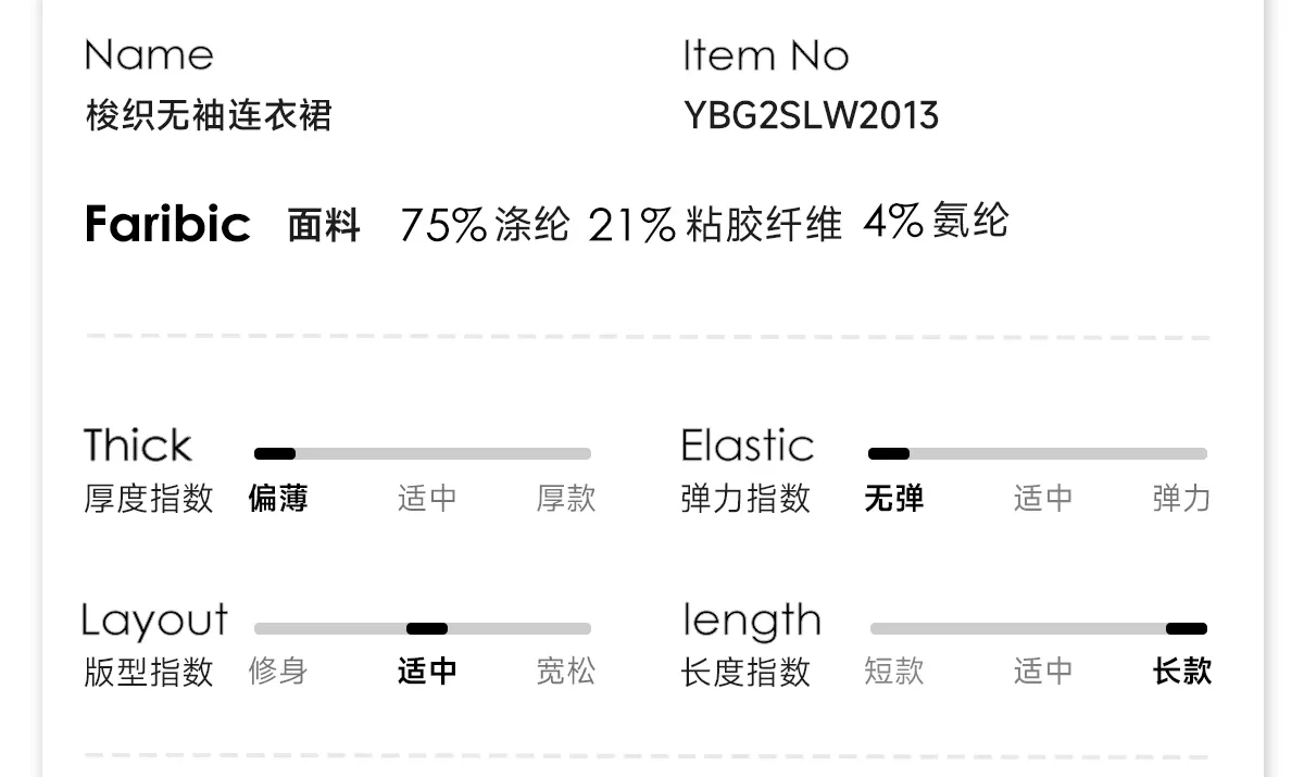 材質成分 | 聚對苯二甲酸乙二酯(滌綸)75% 粘膠纖維(粘纖)21% 聚氨酯彈性纖維(氨綸)4% |