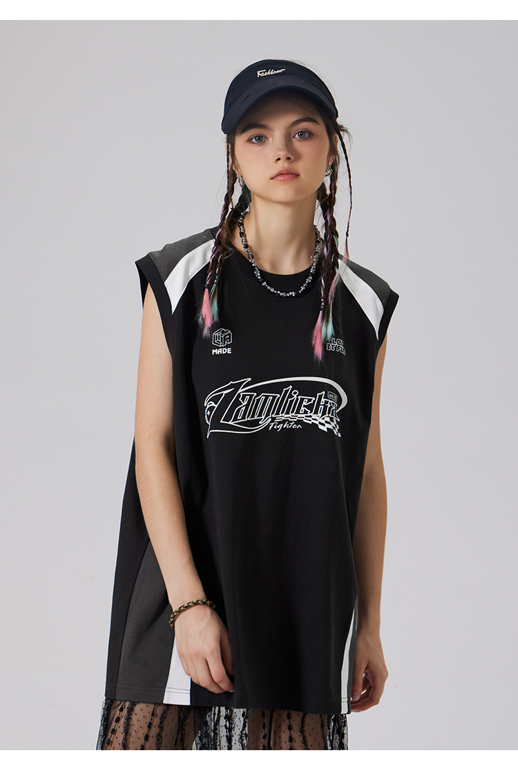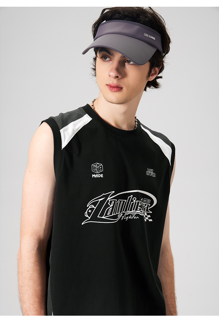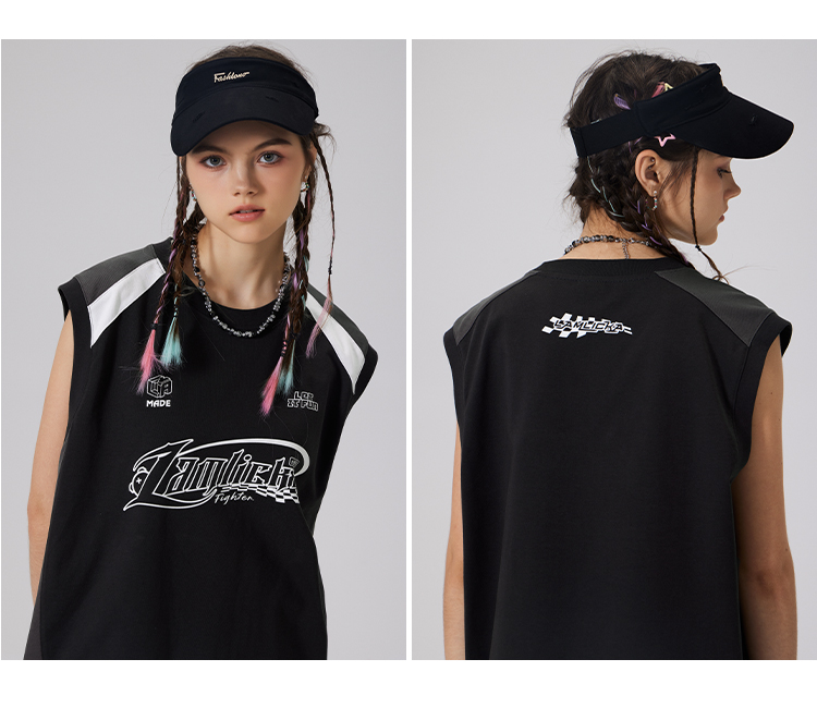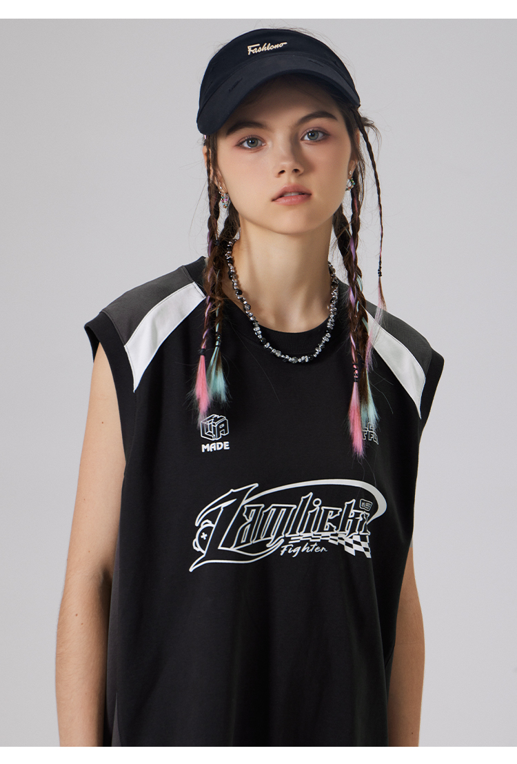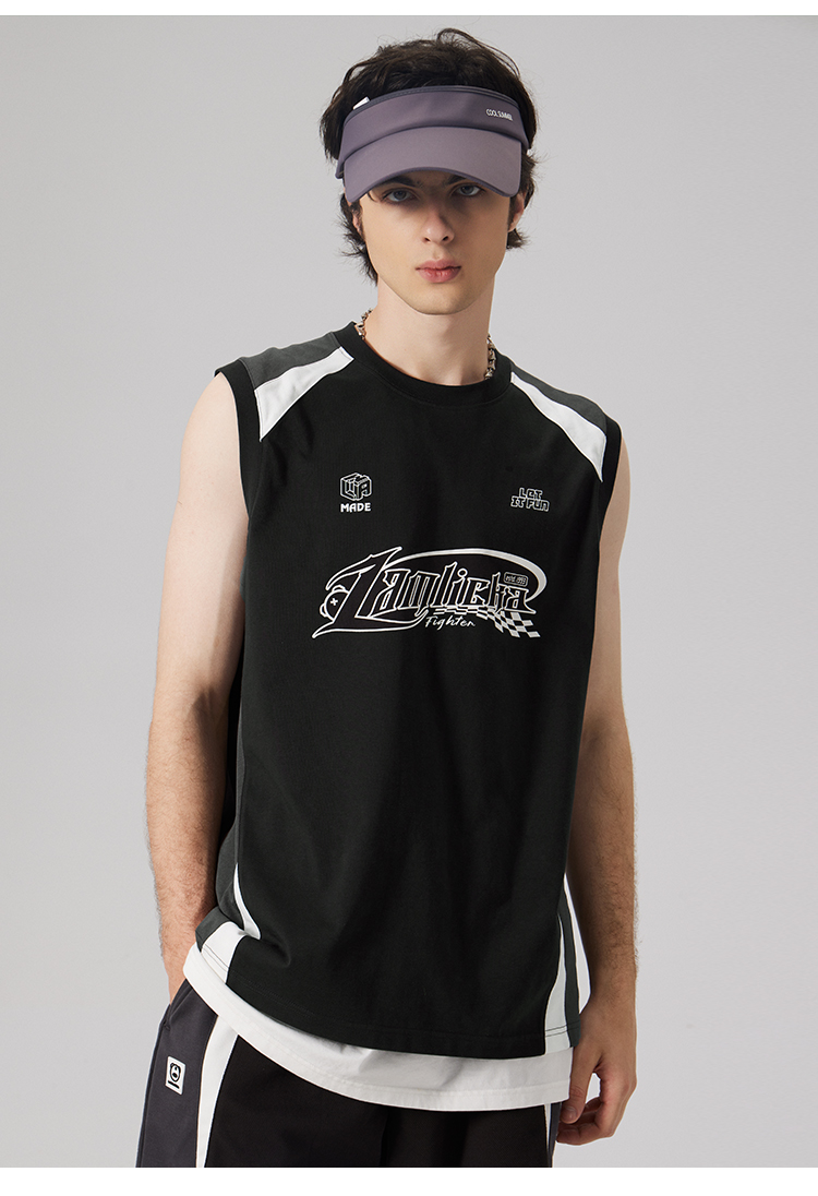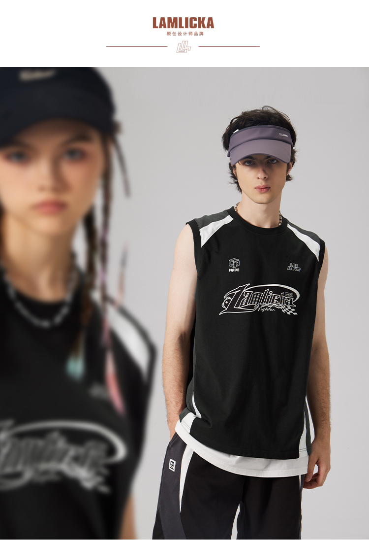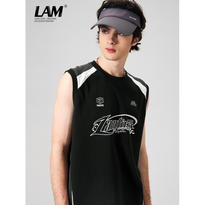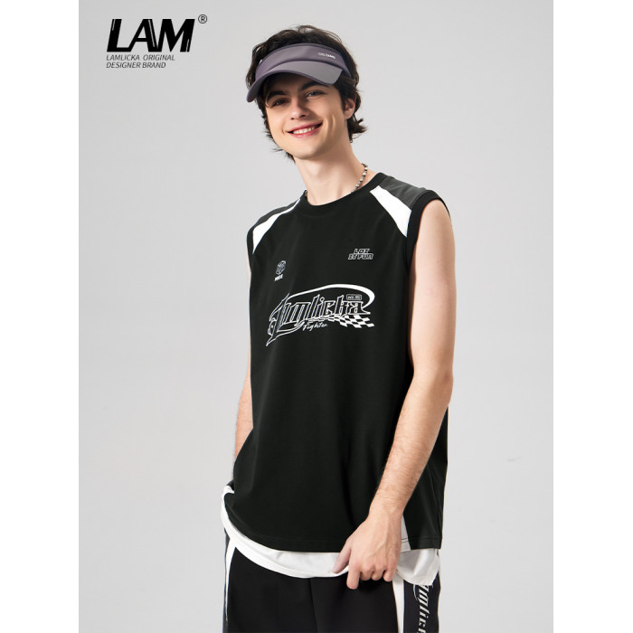 LAMLICKA美式復古字母運動背心男夏季新款拼接情侶裝無袖T恤寬松