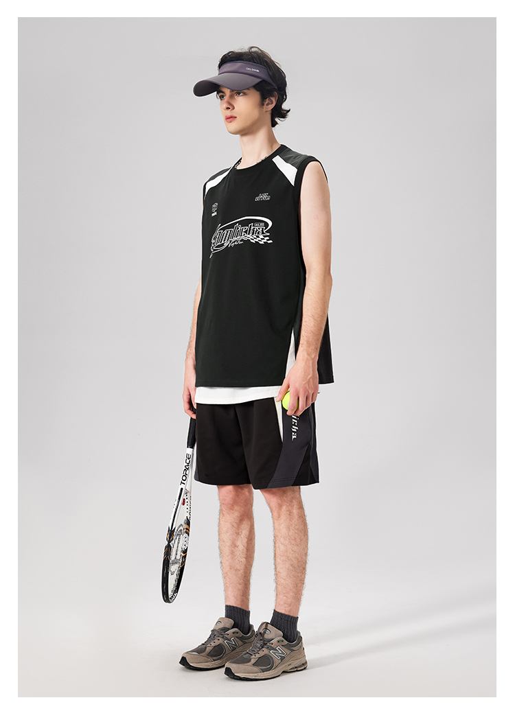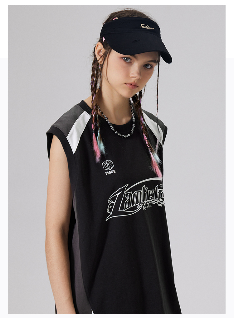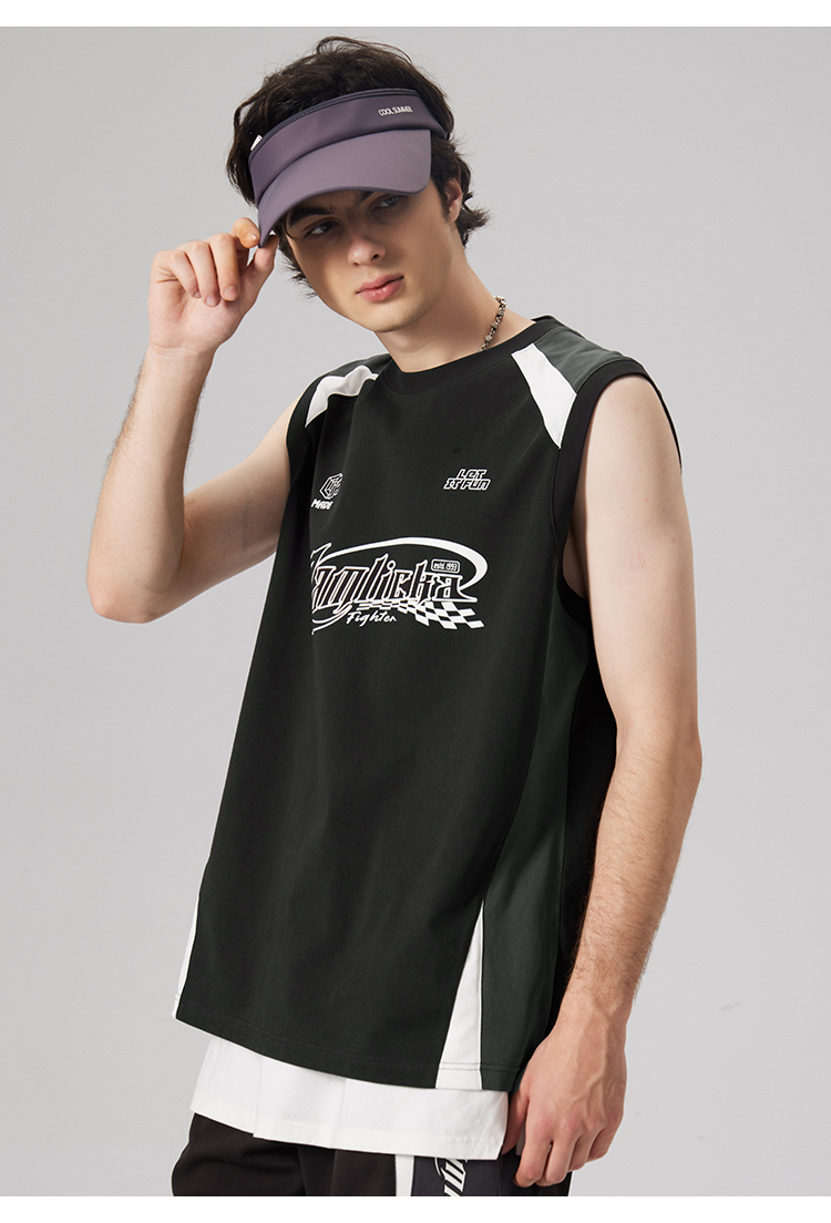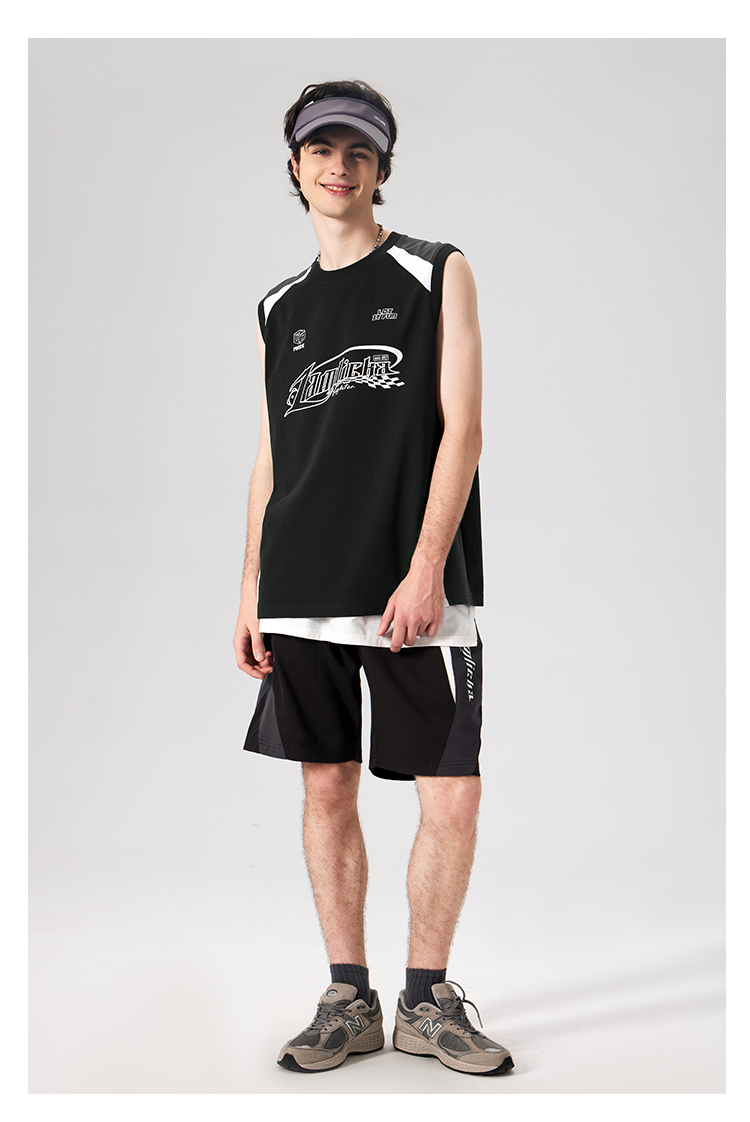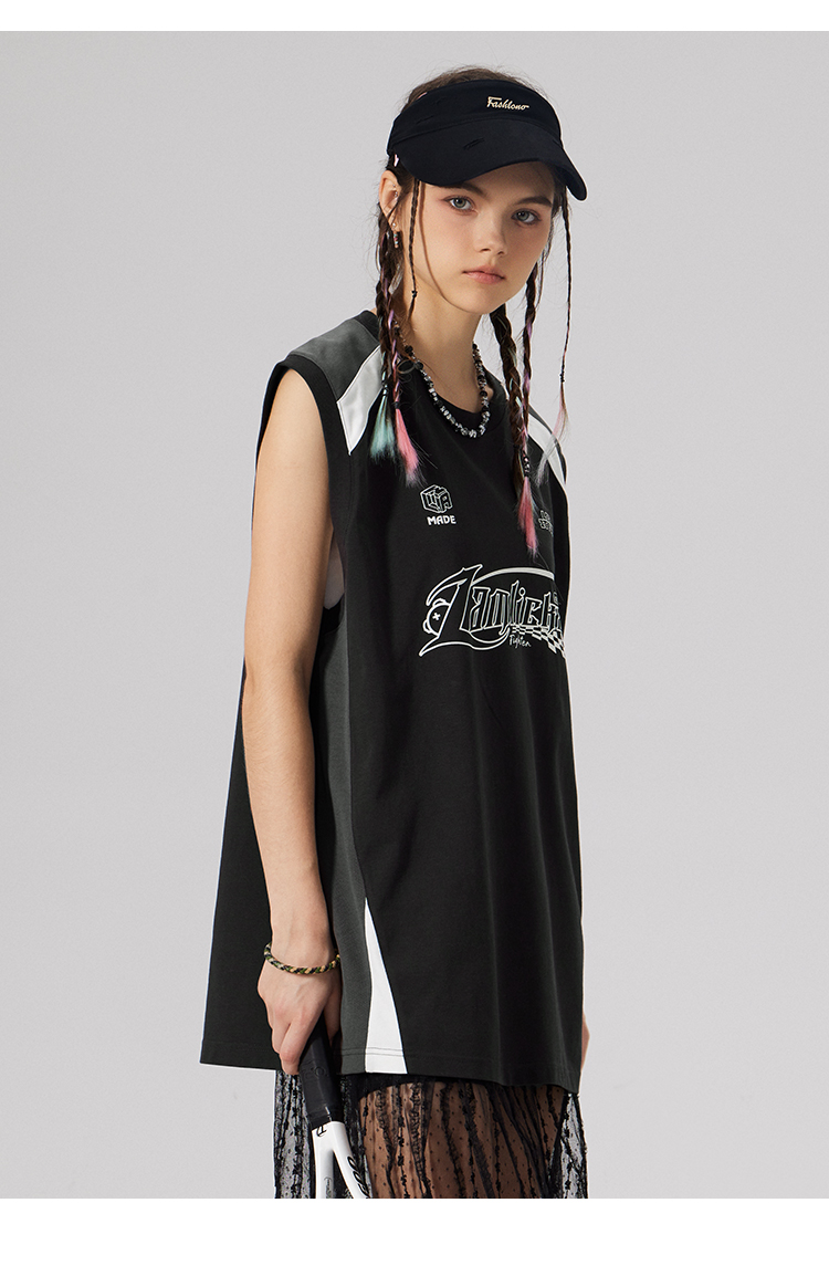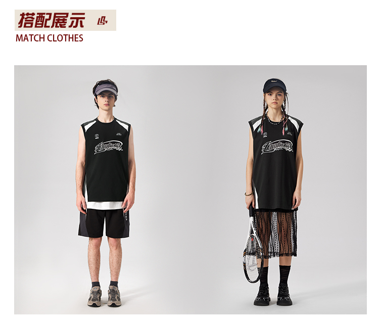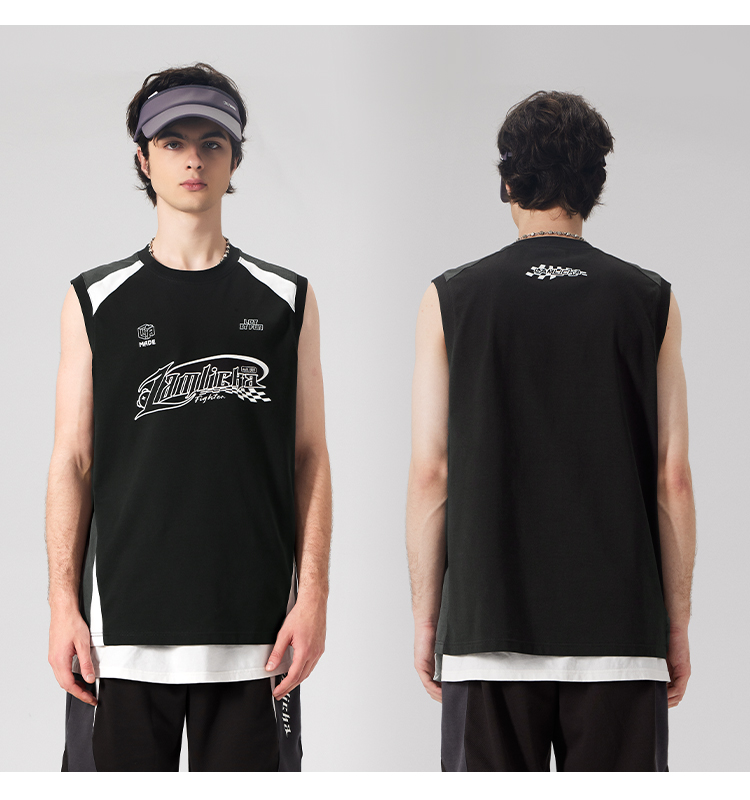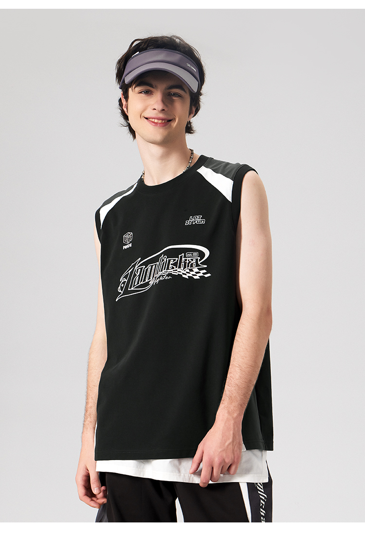 LAMLICKA美式復古字母運動背心男夏季新款拼接情侶裝無袖T恤寬松