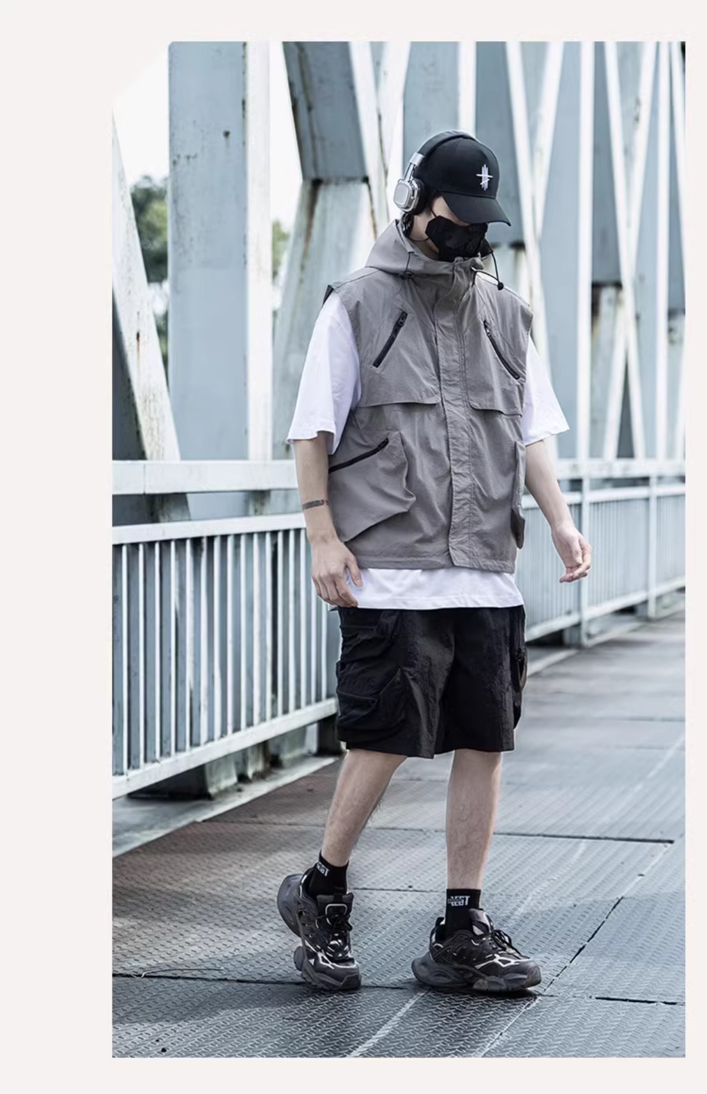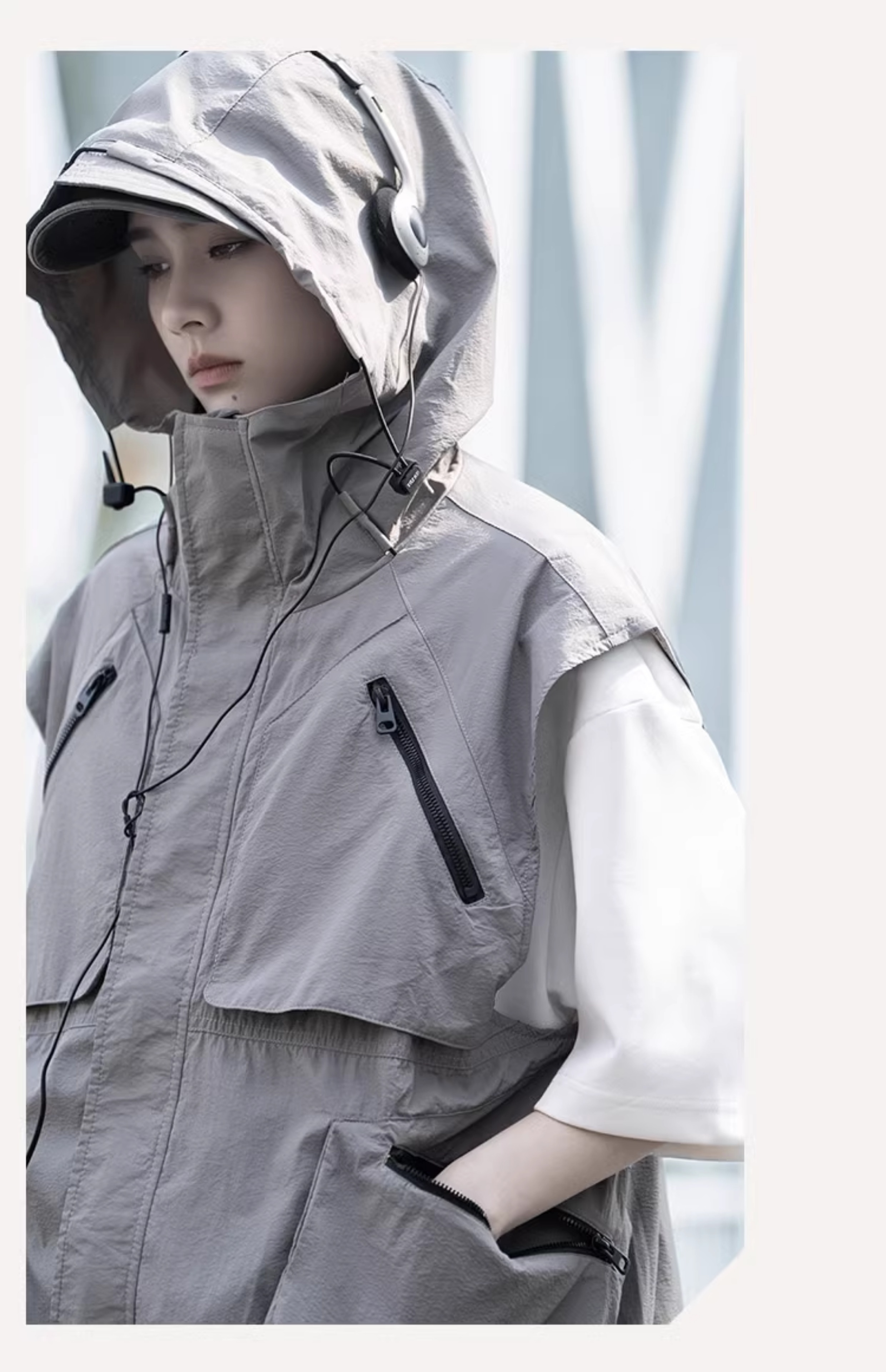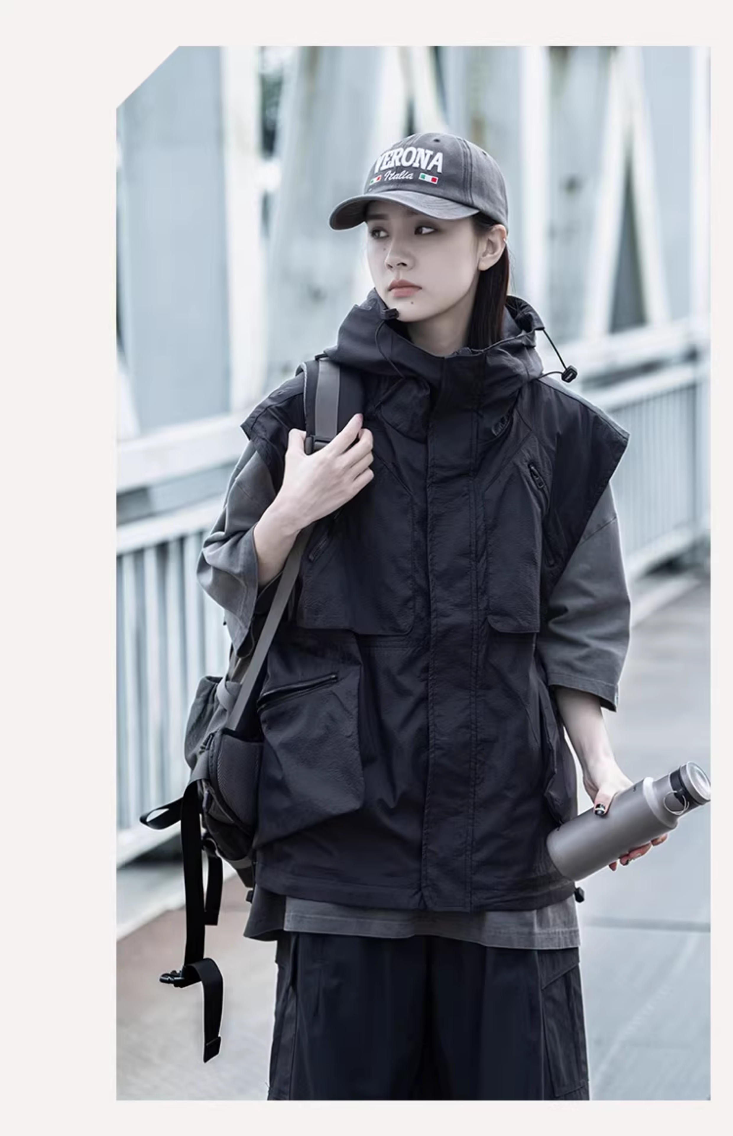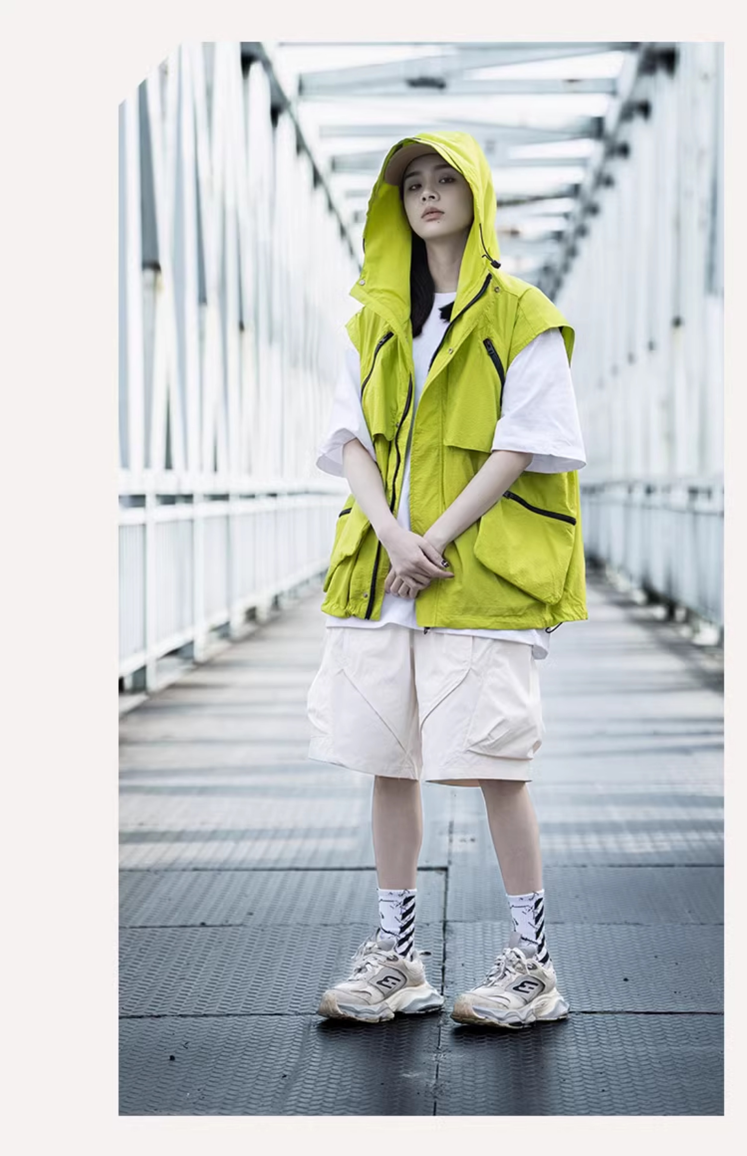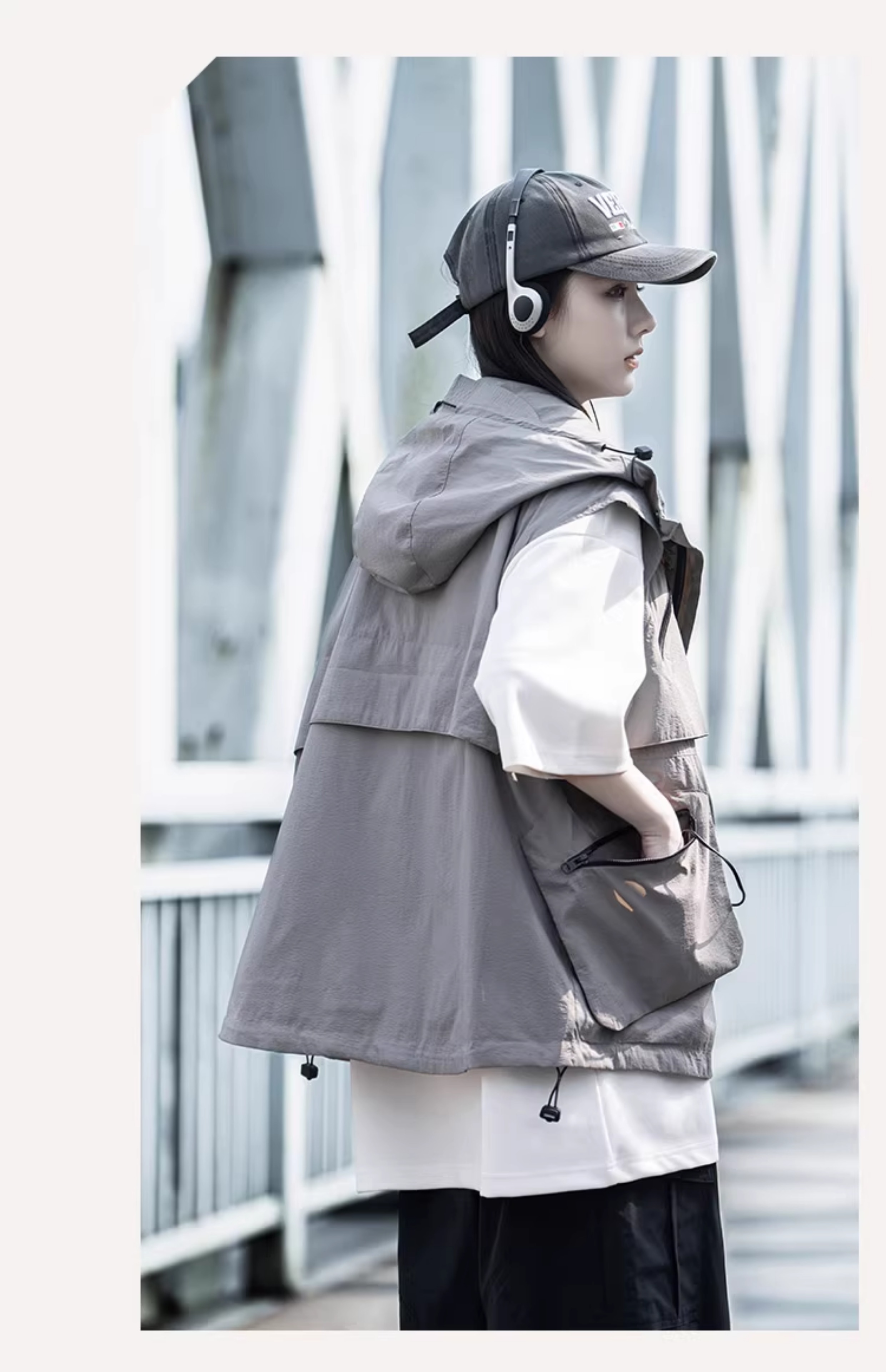 AOGZ戶外潮牌機能風連帽馬甲男女夏季新款多口袋工裝無袖坎肩外套