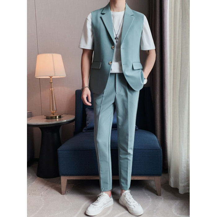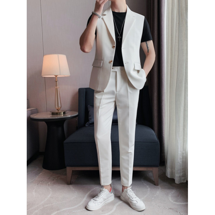 無袖西裝馬甲套裝男夏薄款痞帥潮流修身西服外套髮型師潮牌兩件套