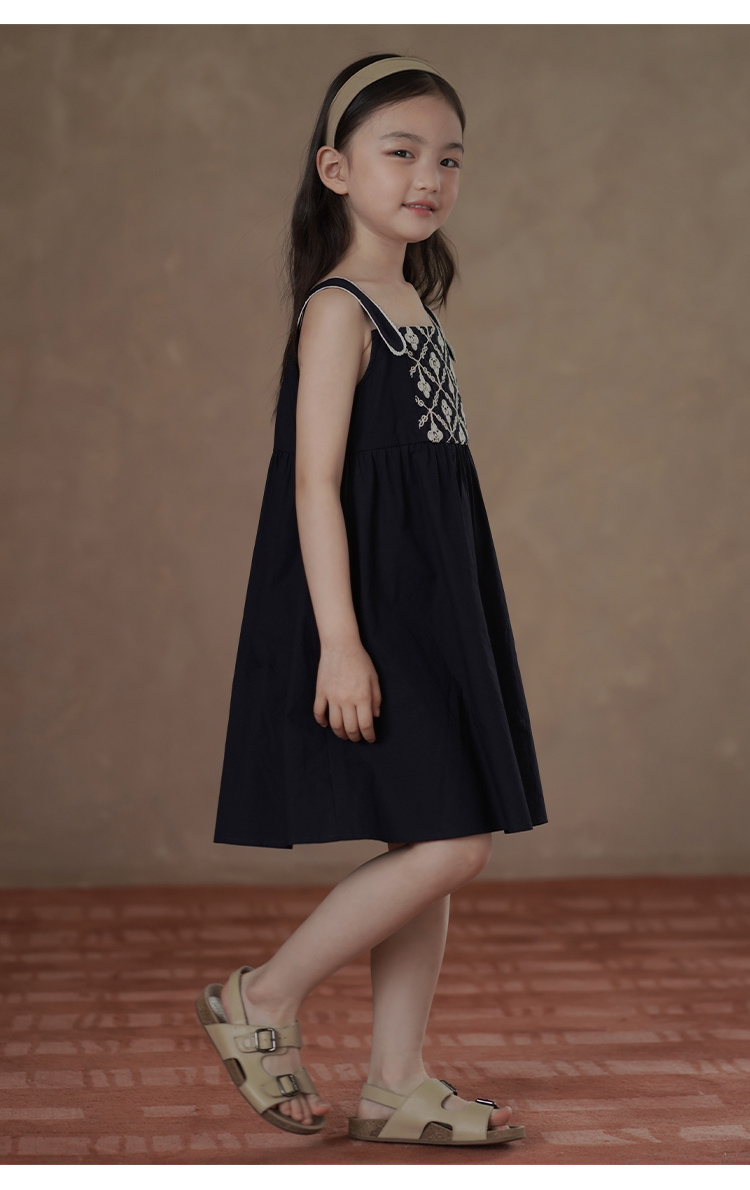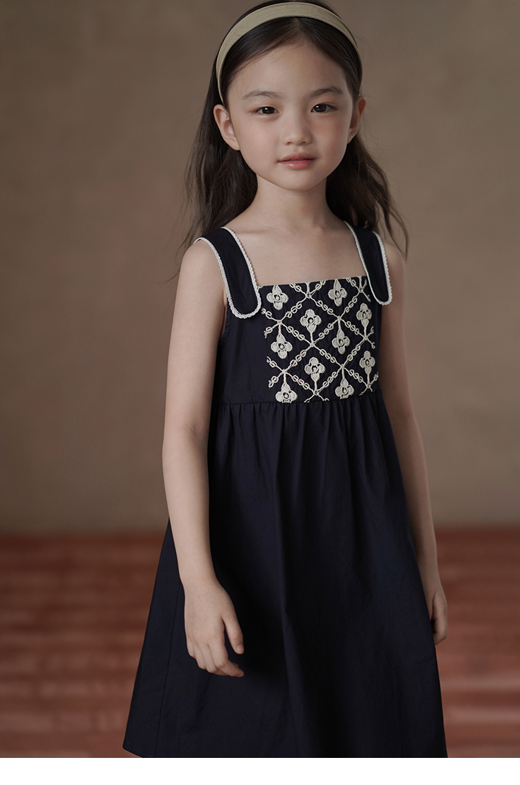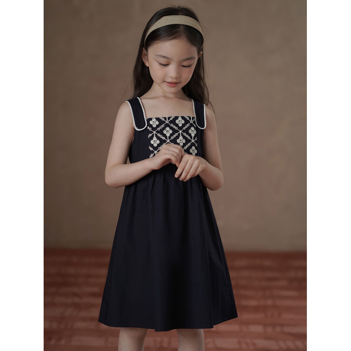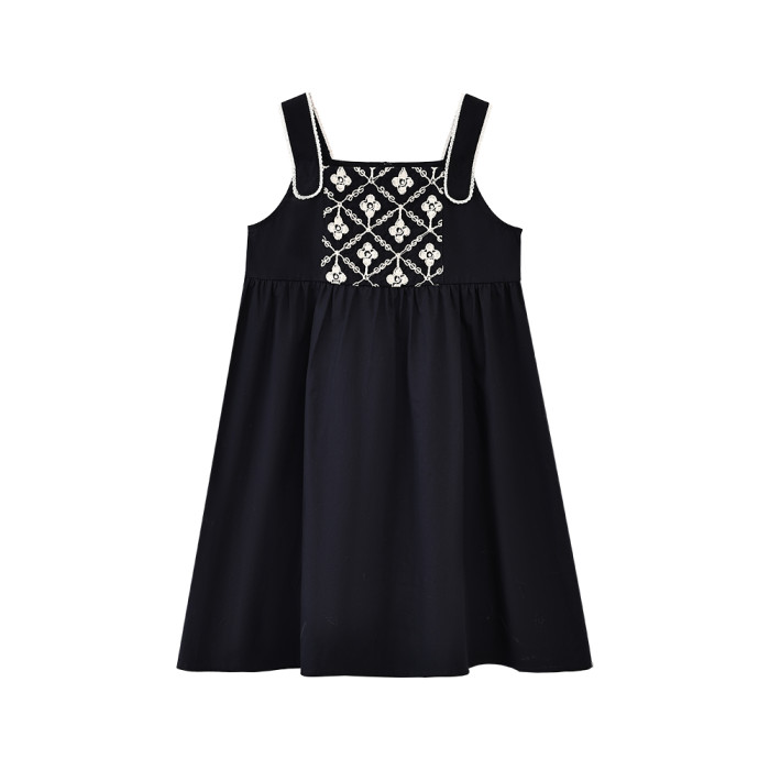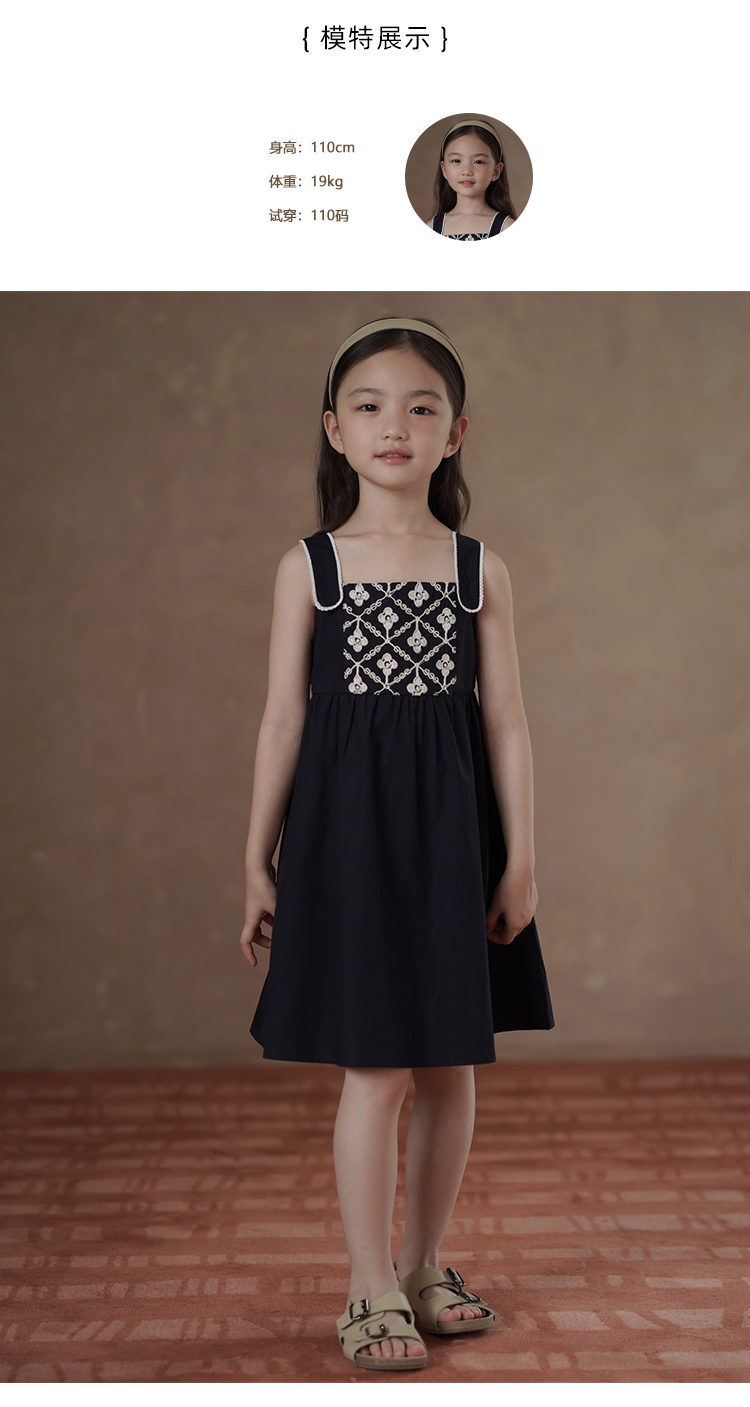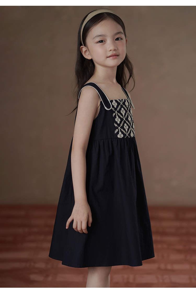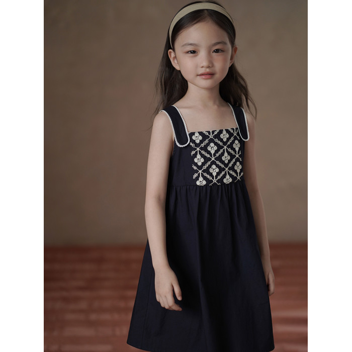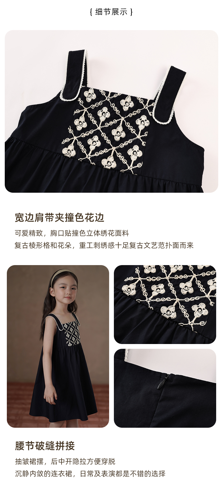 哈齒童裝兒童吊帶裙夏季新款重工中長裙女童藏青連衣裙親膚全棉