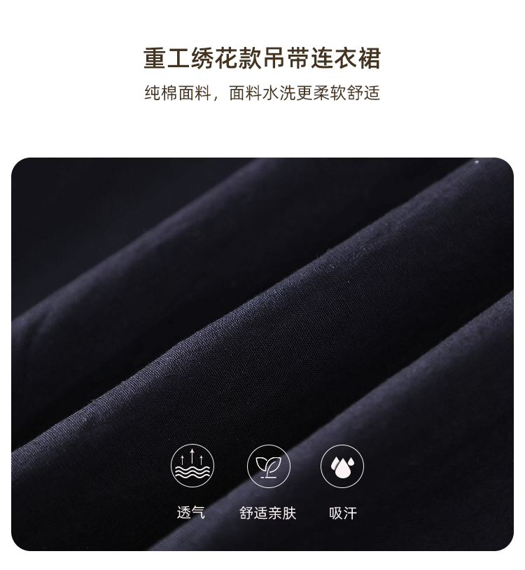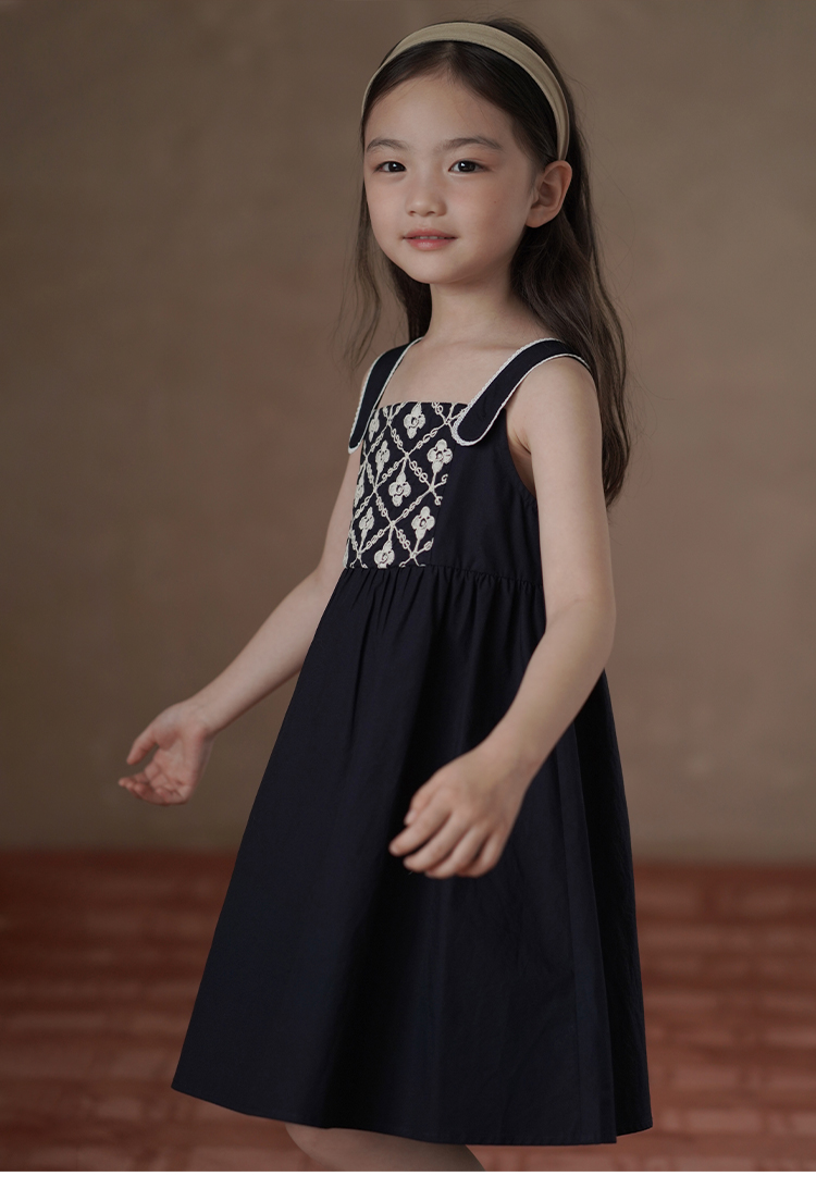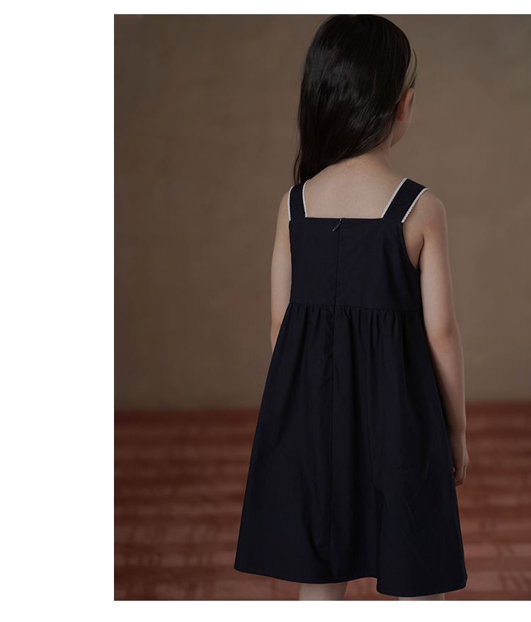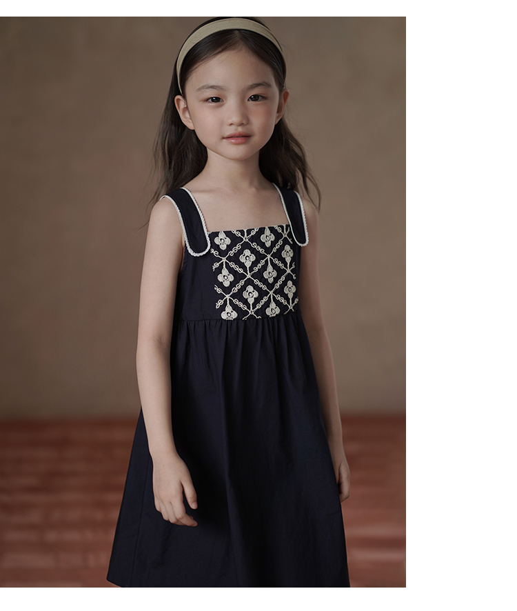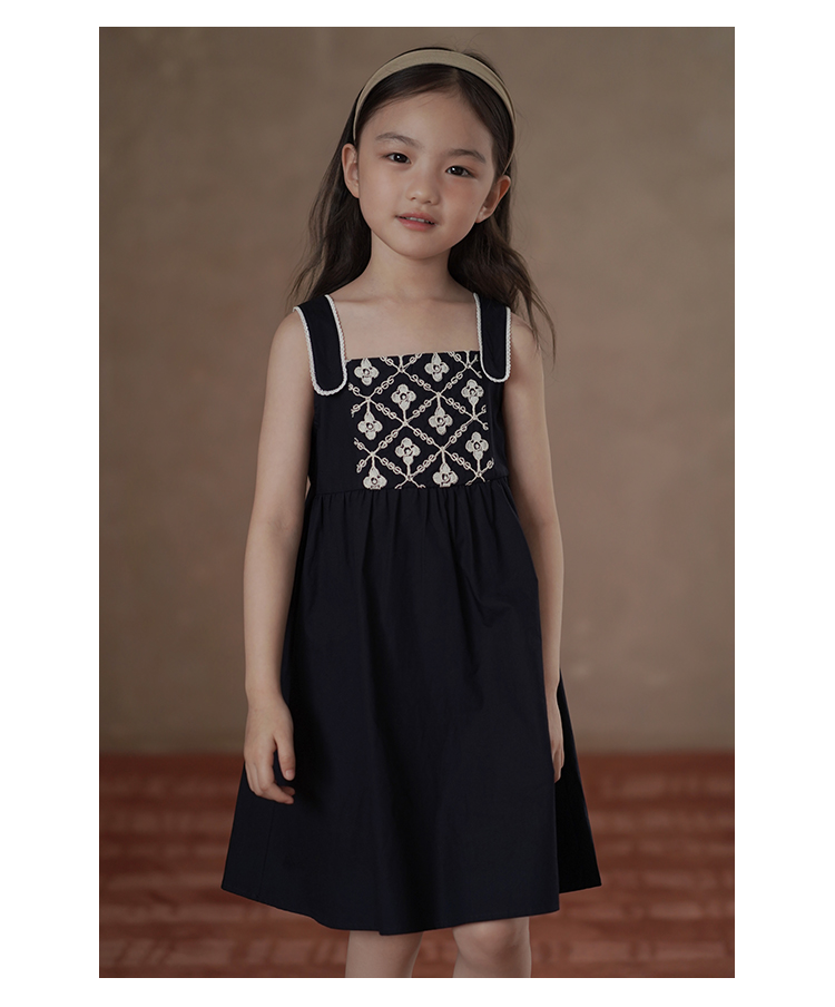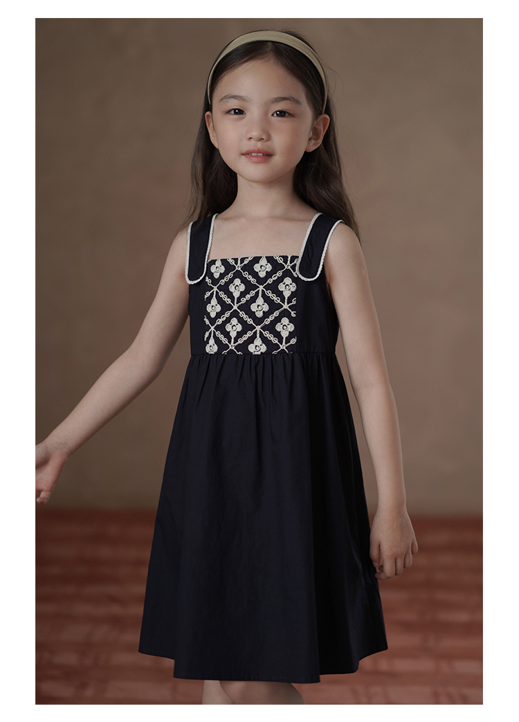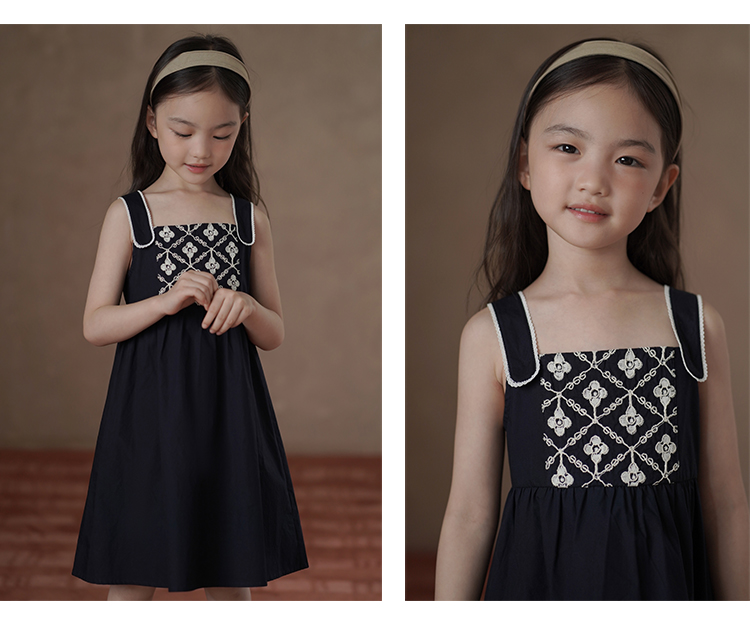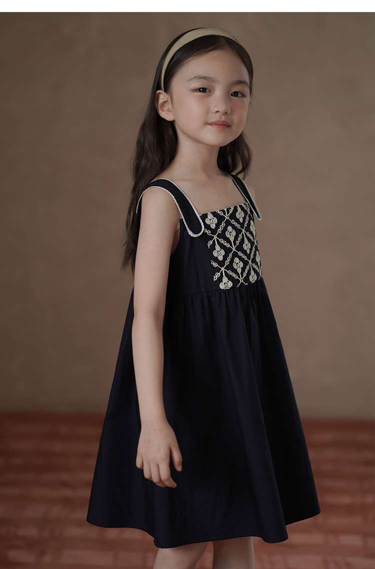 哈齒童裝兒童吊帶裙夏季新款重工中長裙女童藏青連衣裙親膚全棉