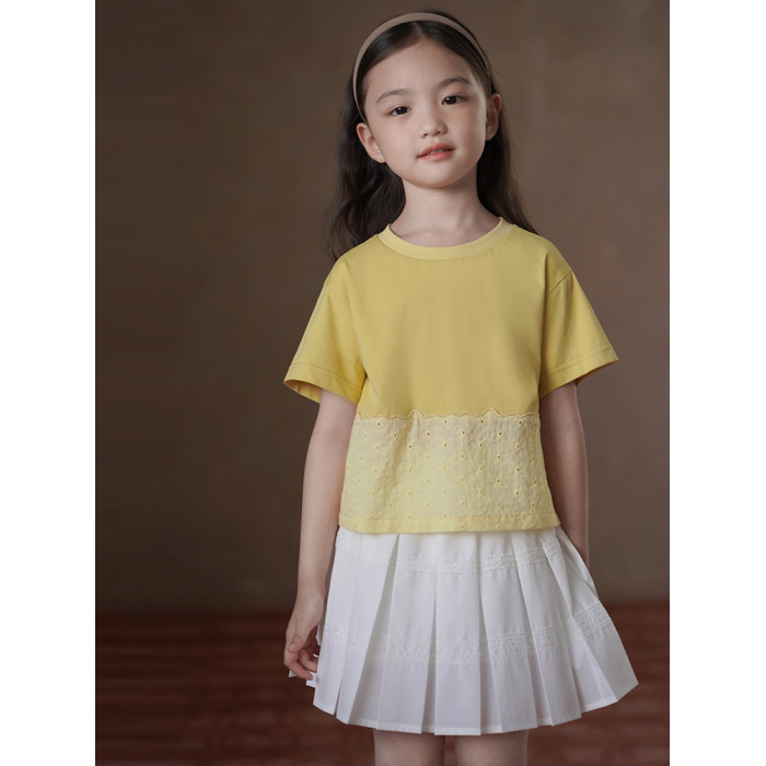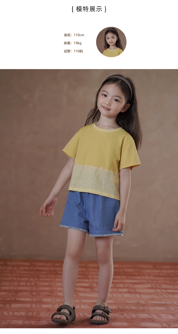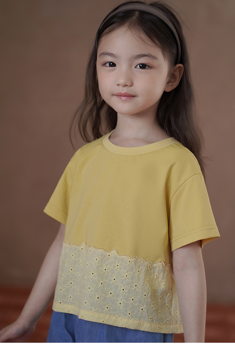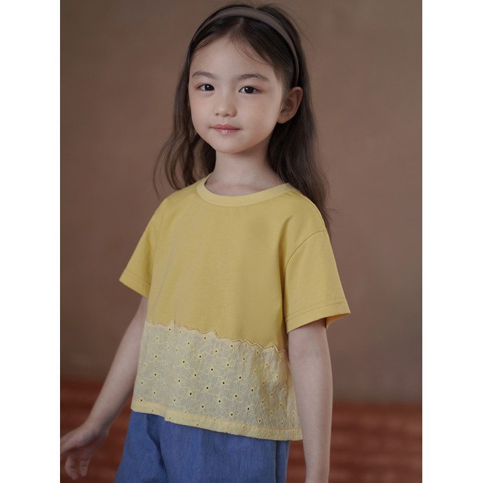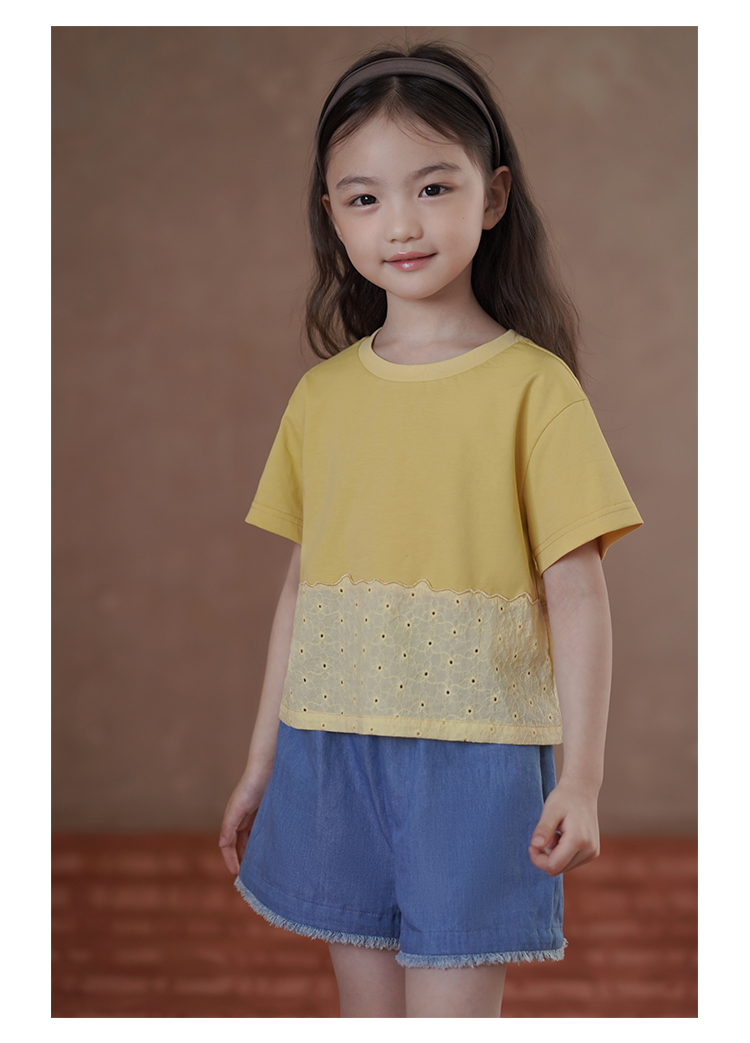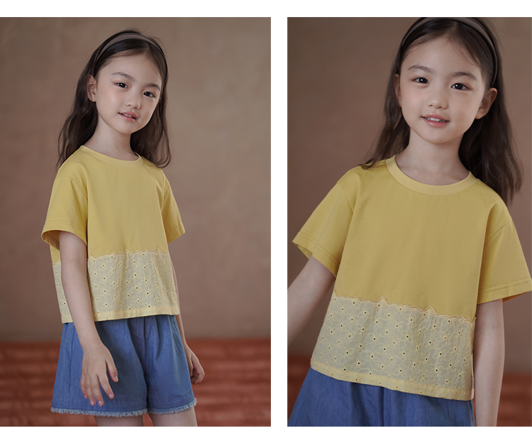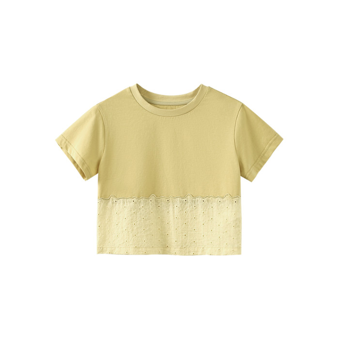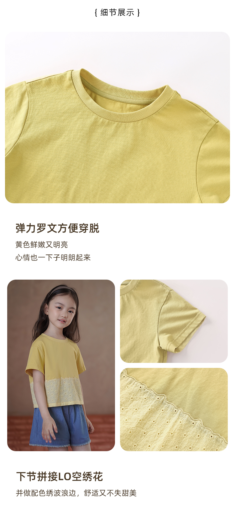 哈齒童裝兒童夏裝綉花拼接黃色上衣女童短袖T恤洋氣百搭針織衫薄