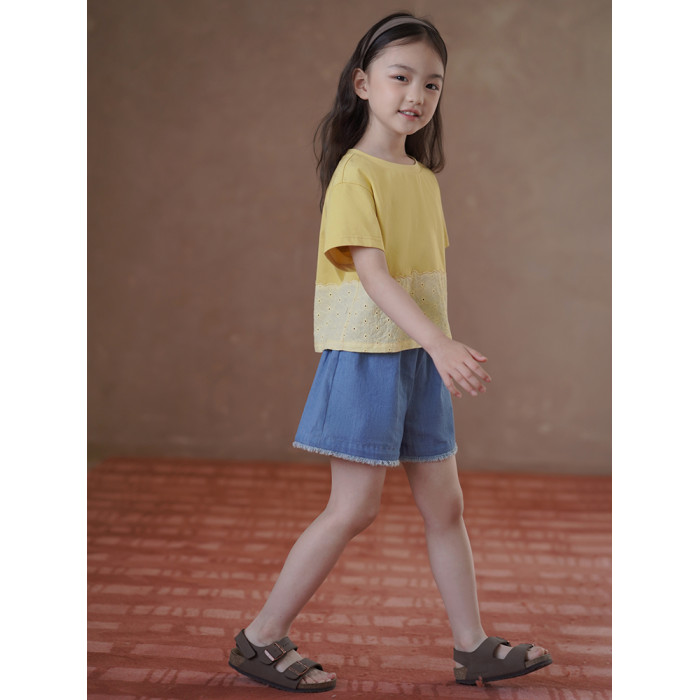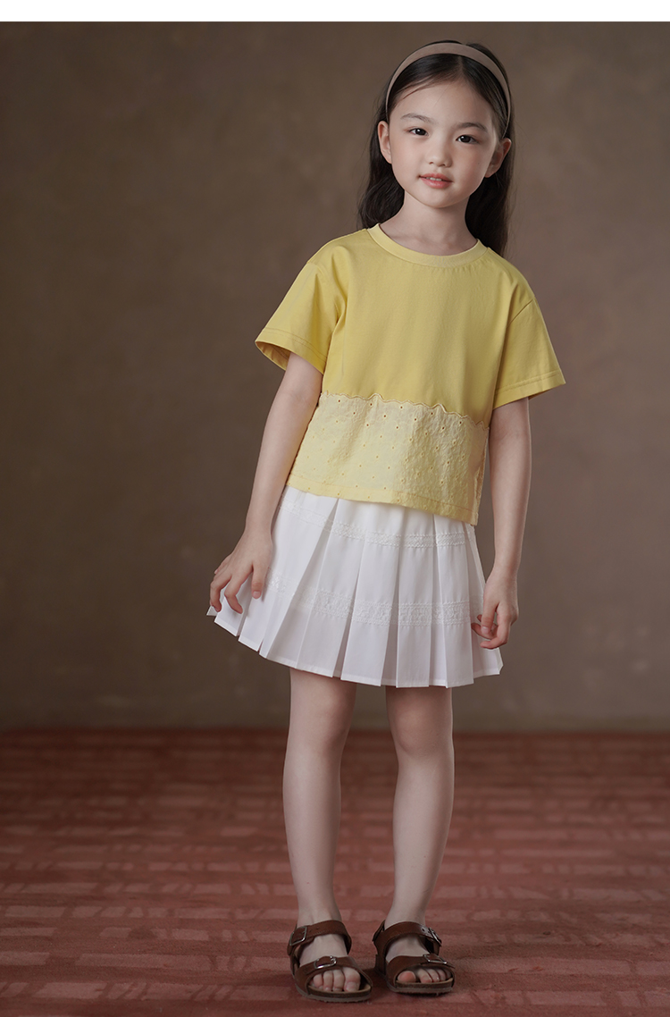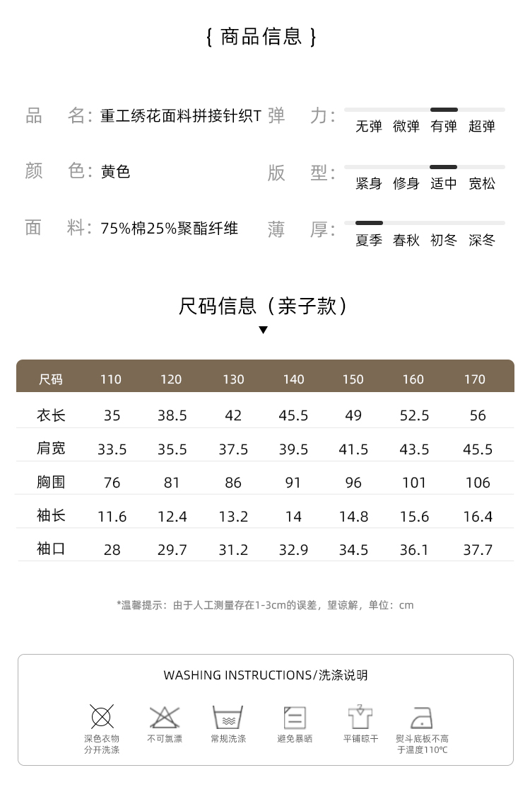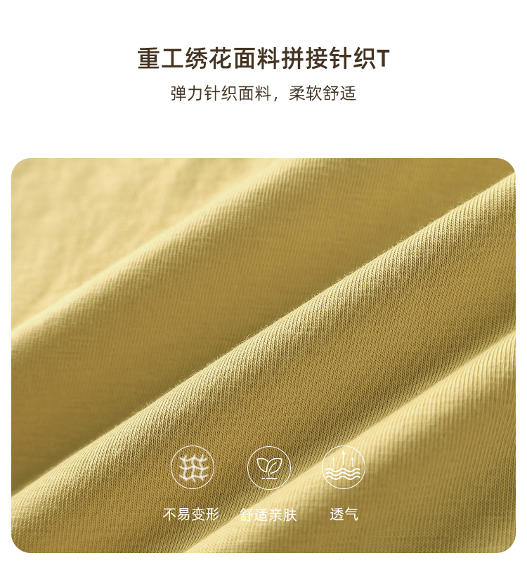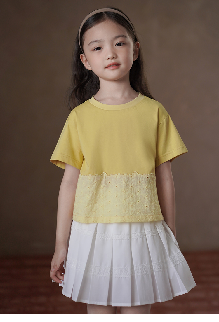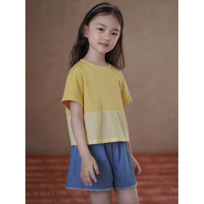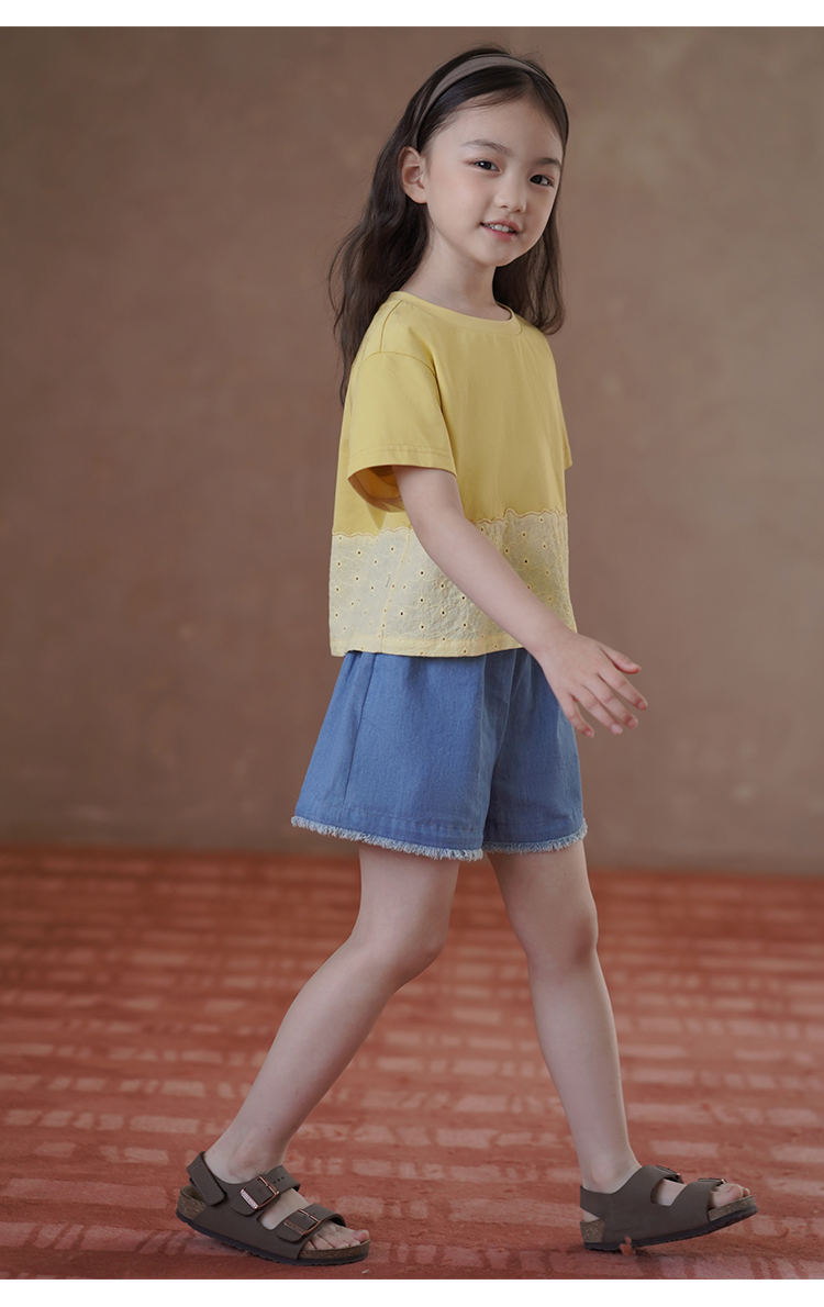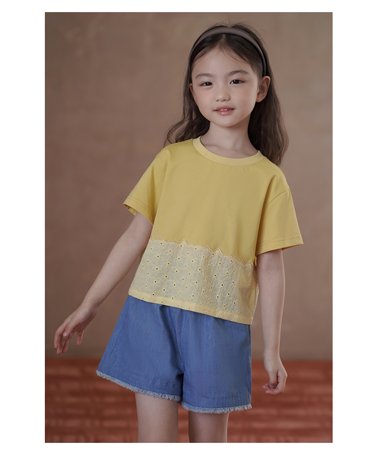 哈齒童裝兒童夏裝綉花拼接黃色上衣女童短袖T恤洋氣百搭針織衫薄