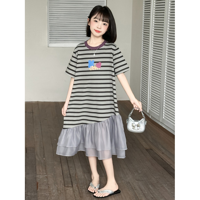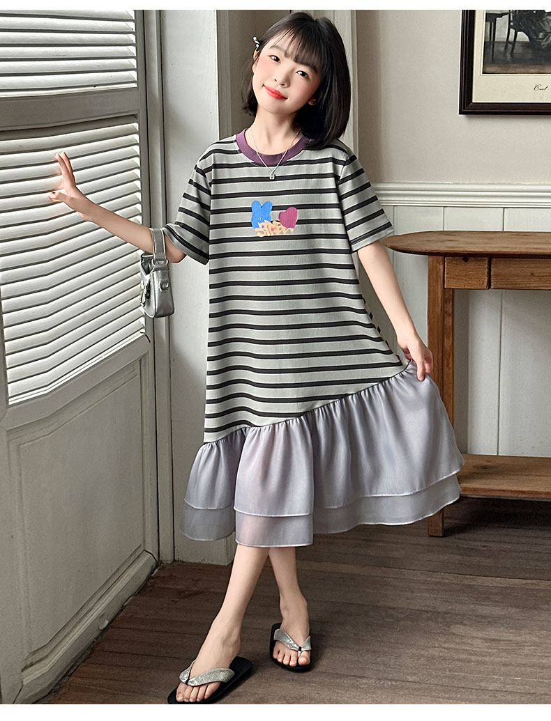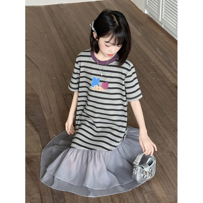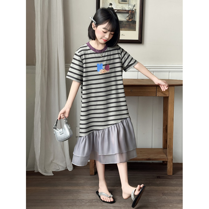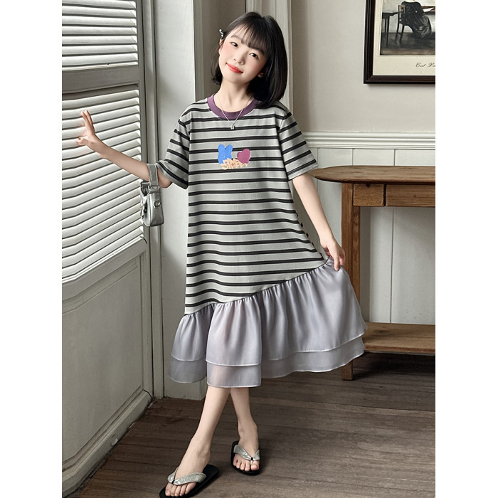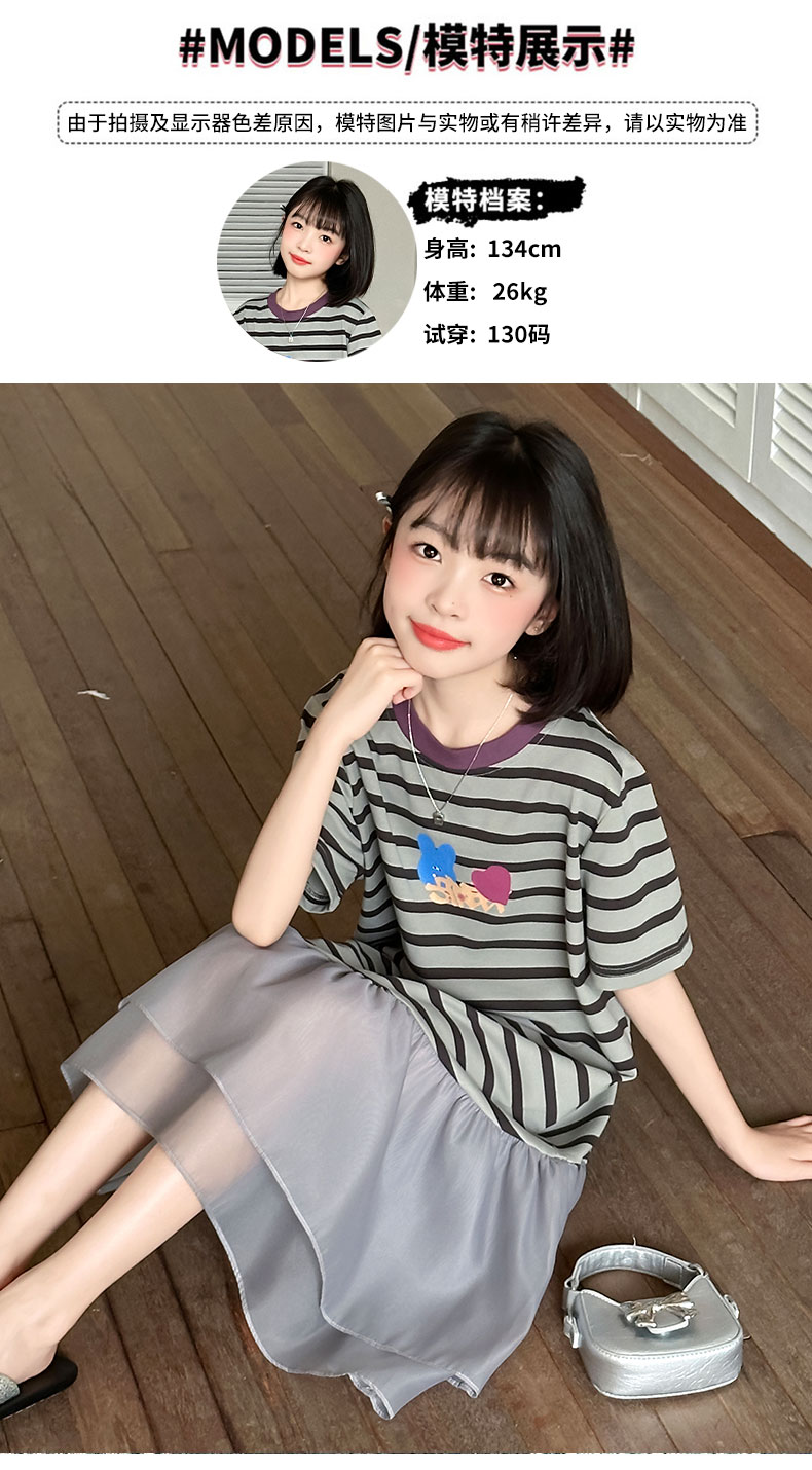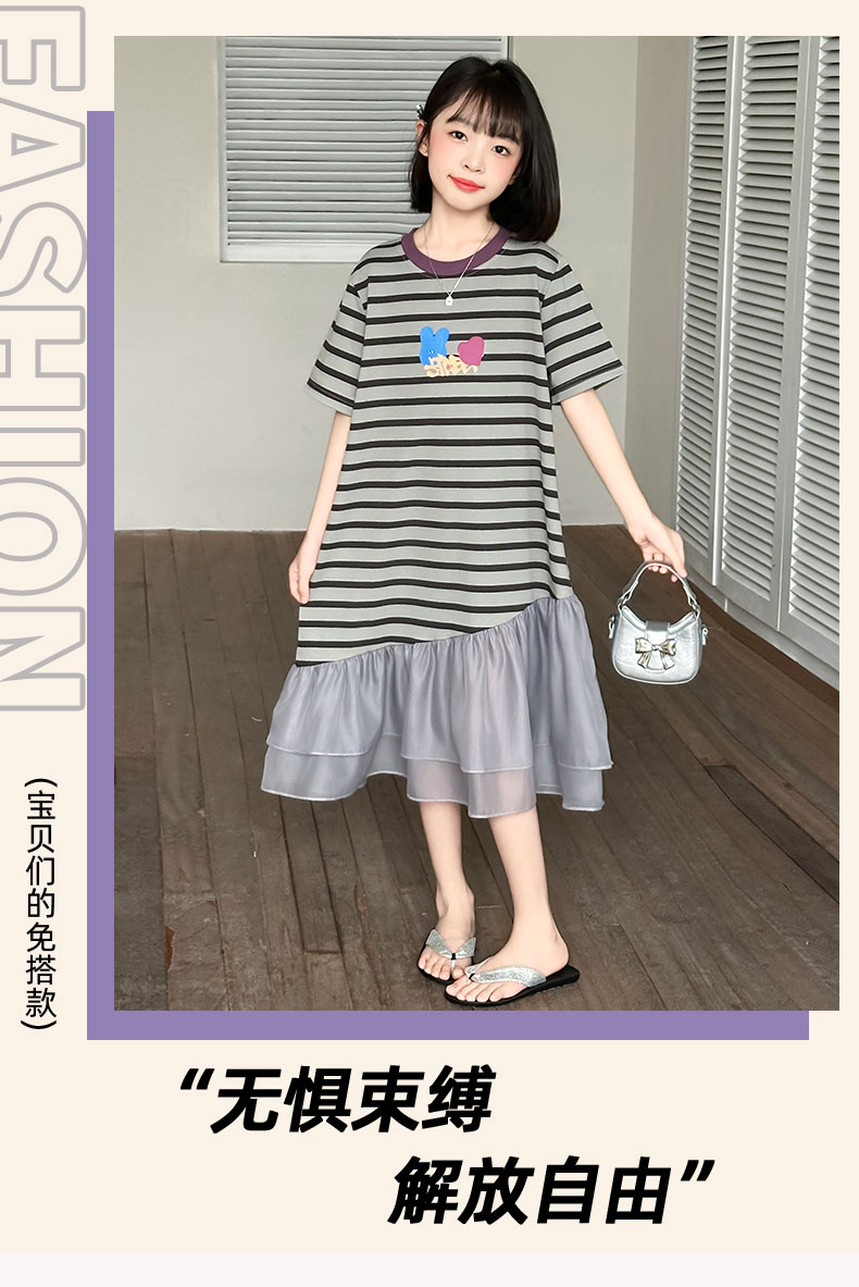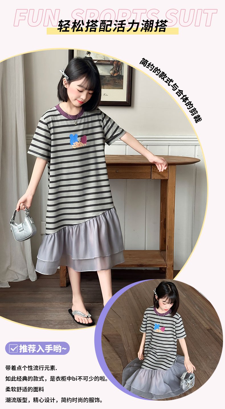 女童連衣裙夏季2025新款兒童洋氣薄款拼接短袖夏裝中大童條紋裙子