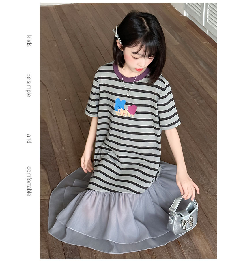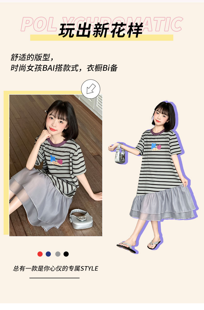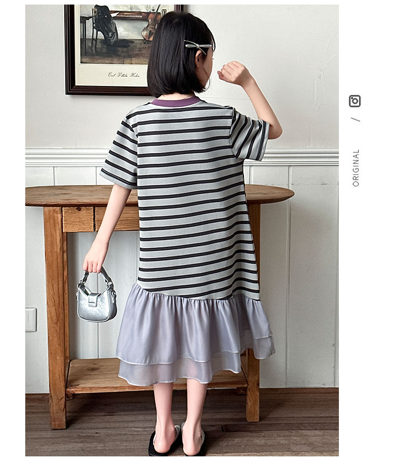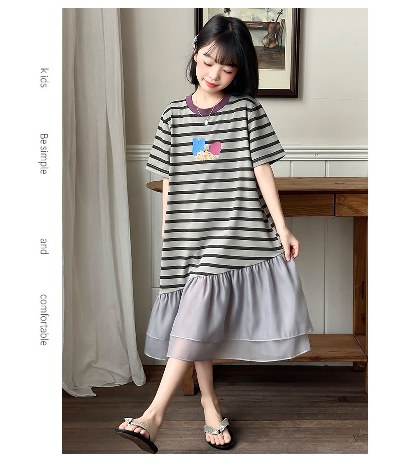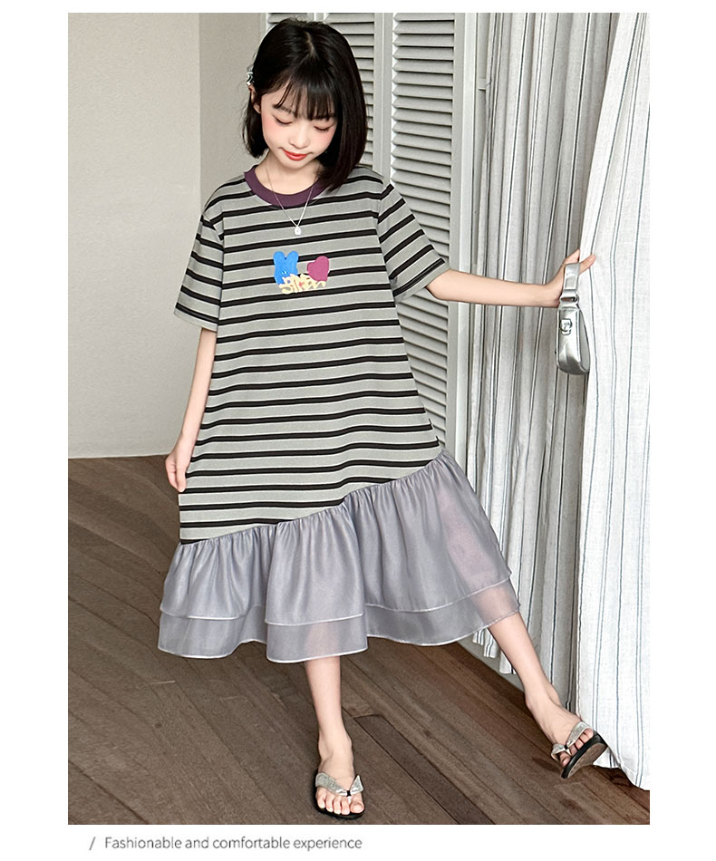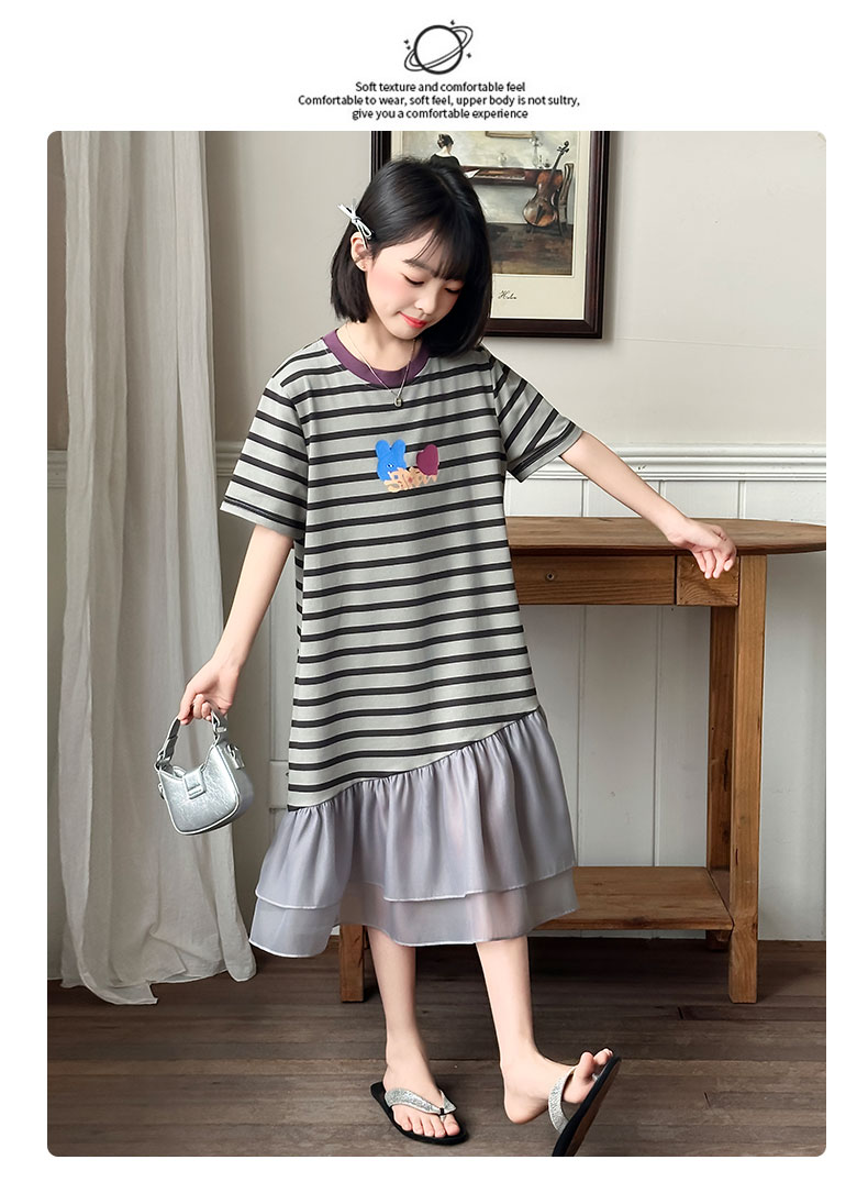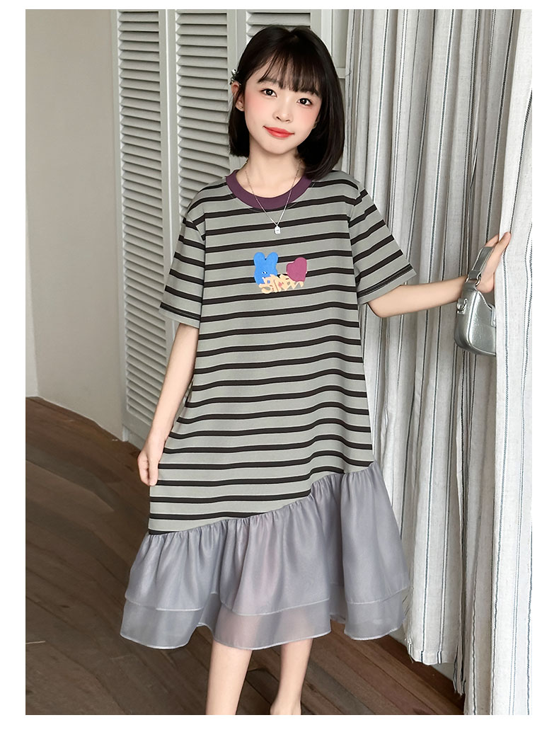女童連衣裙夏季2025新款兒童洋氣薄款拼接短袖夏裝中大童條紋裙子