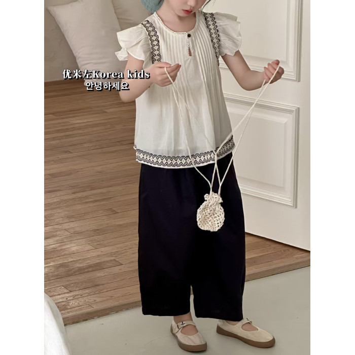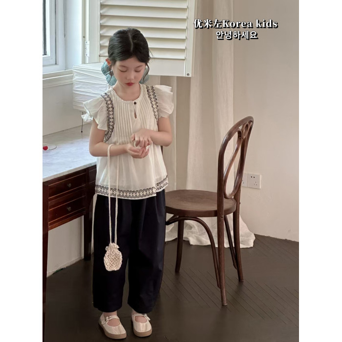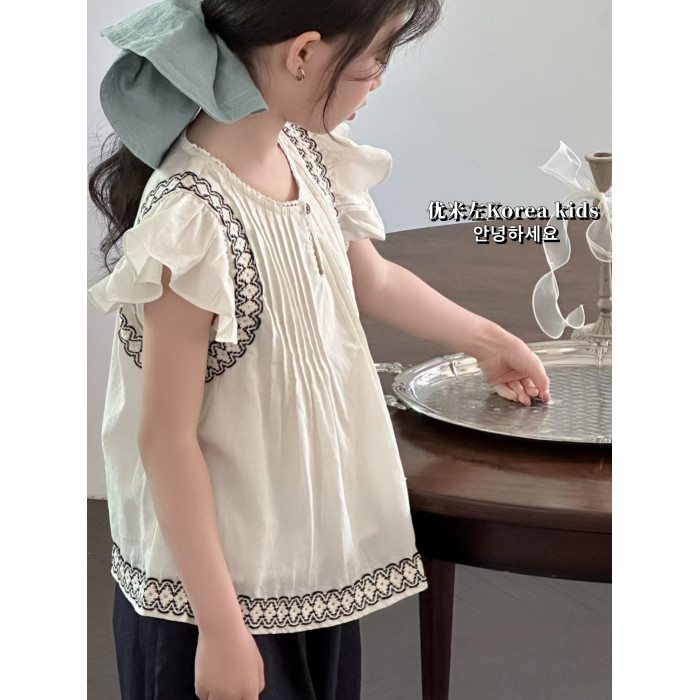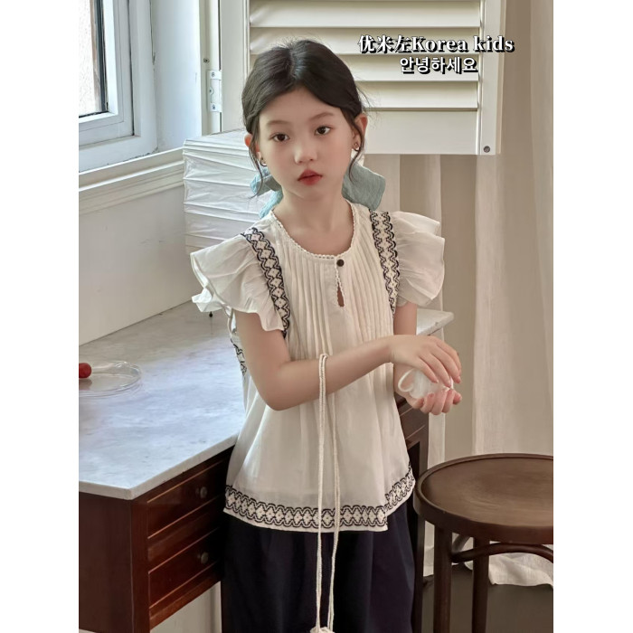 洋氣女孩小飛袖上衣2025新款洋氣女童夏裝甜美蕾絲花邊襯衫微袖