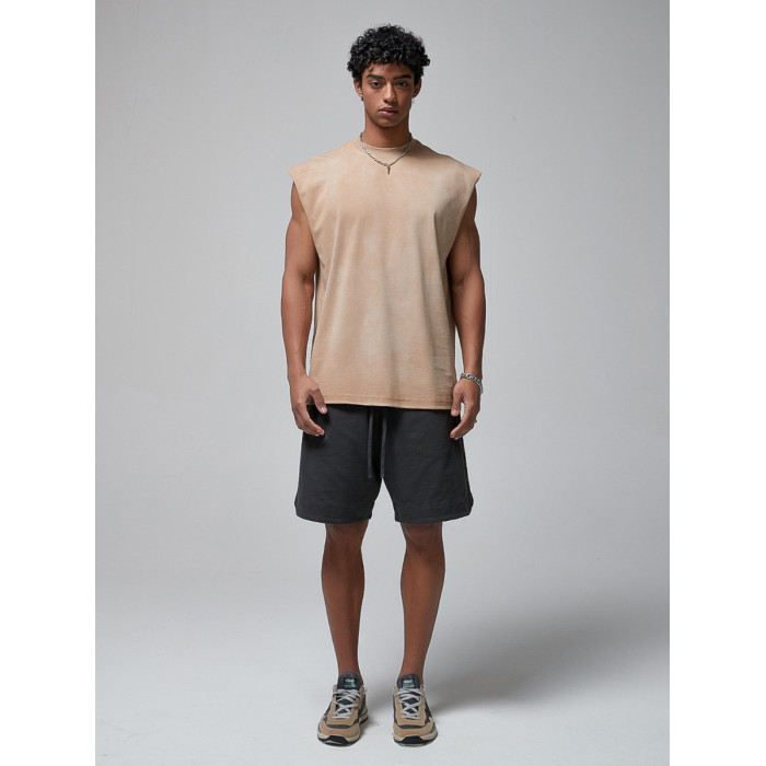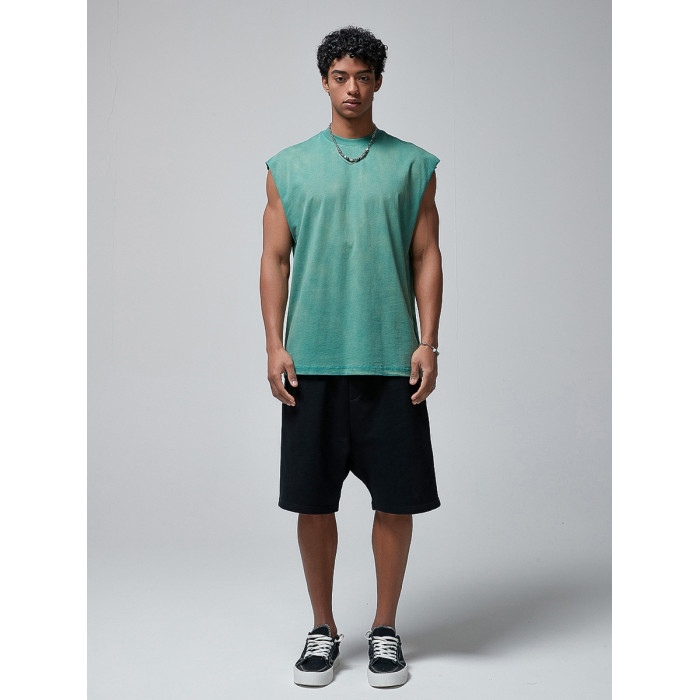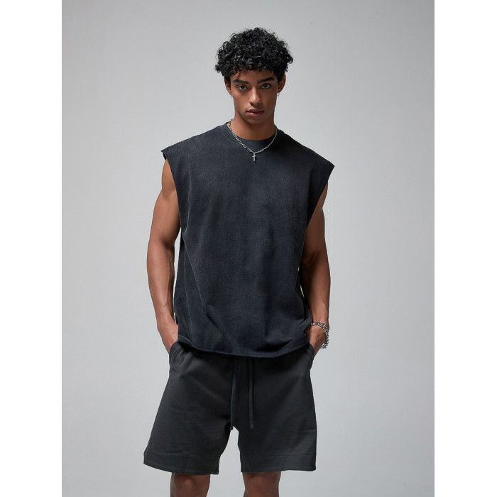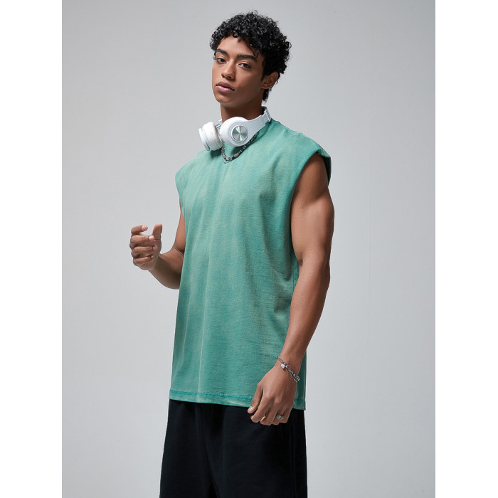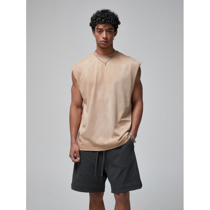 美式復古重磅做舊噴染健身無袖t恤男潮夏季寬松運動坎肩背心上衣