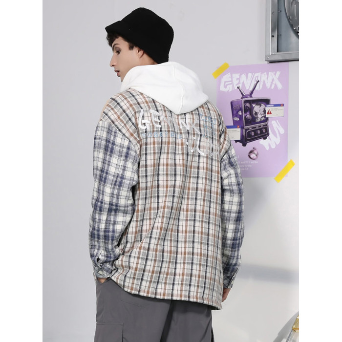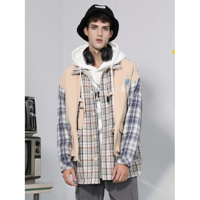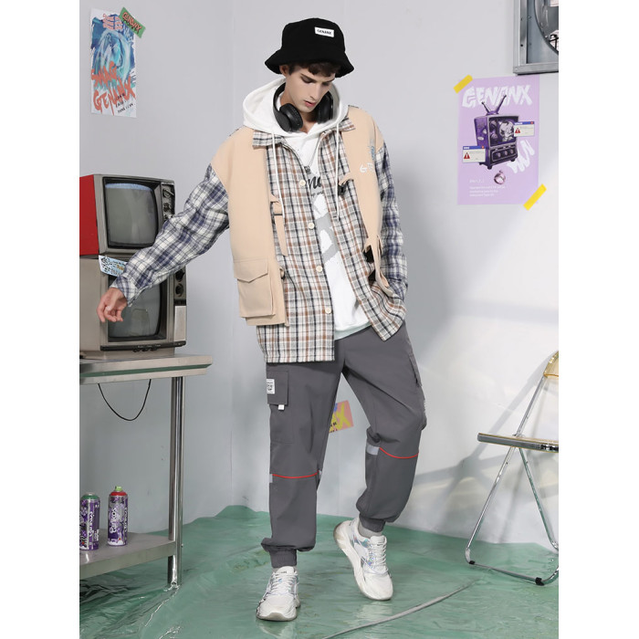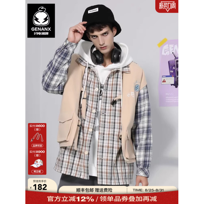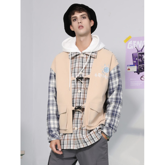 GENANX閃電潮牌格子外套男工裝風襯衫異料拼色插釦馬甲格紋襯衣
