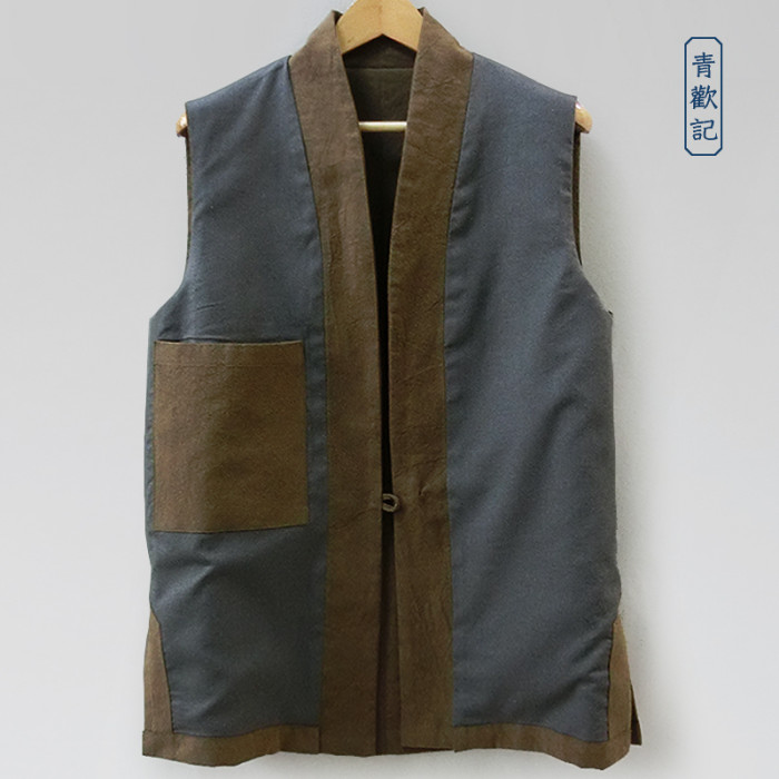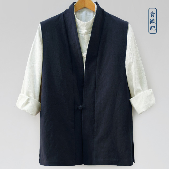 原創春秋季男士休閒亞麻寬松馬甲風盤釦大碼開衫坎肩禪修服男
