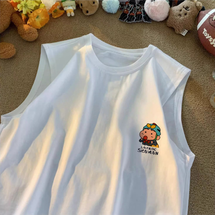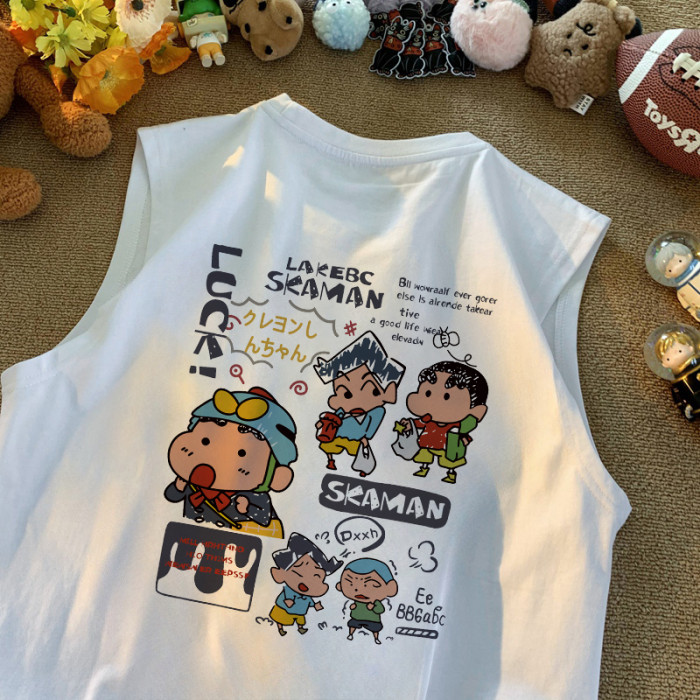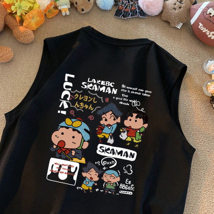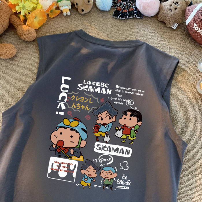 夏季ins潮流小新日系卡通純棉220g背心青少年寬松休閒無袖t恤男款