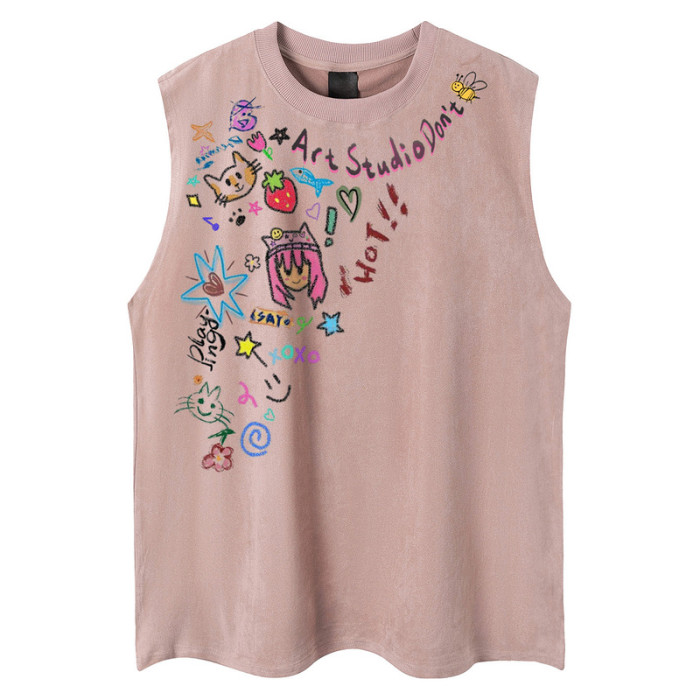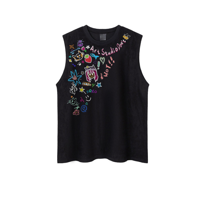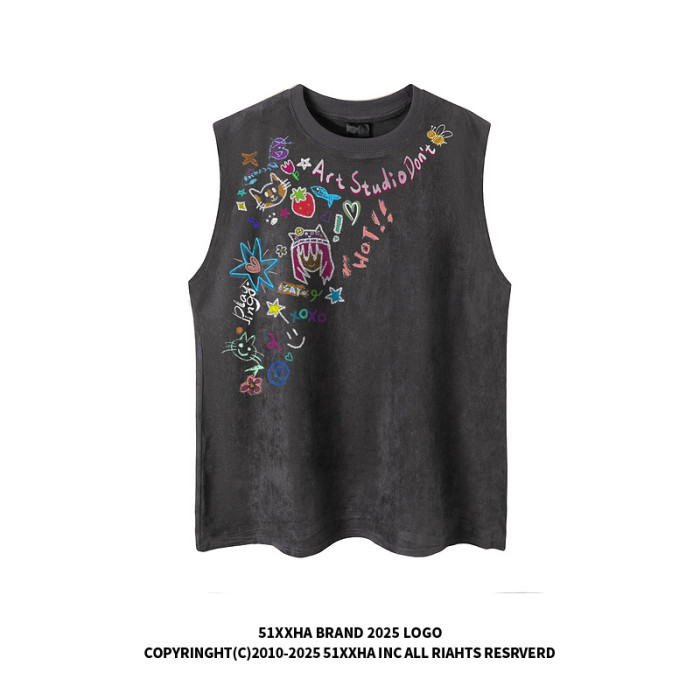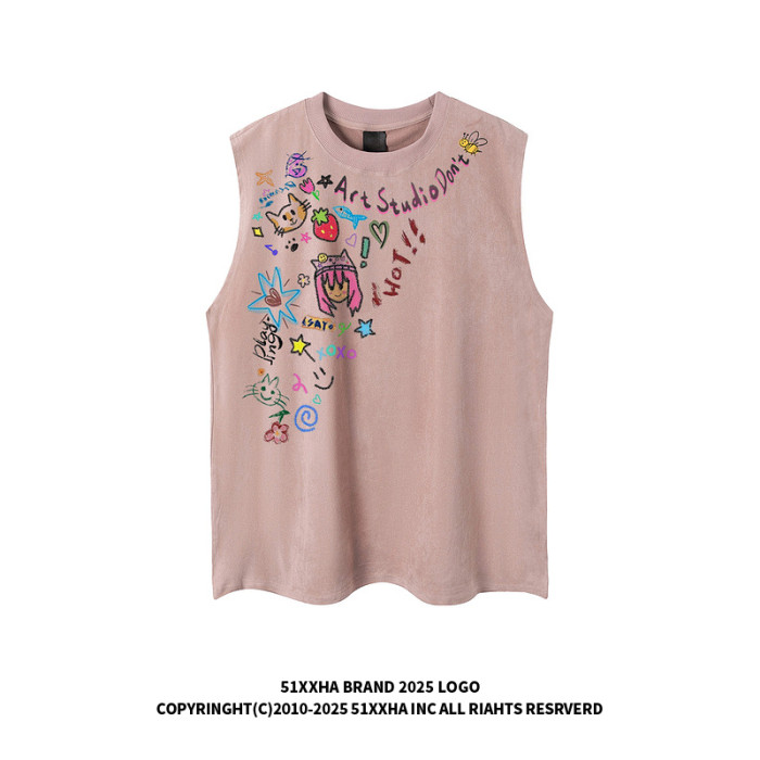 51嘻哈美式創意卡通貼紙印花無袖T恤男夏季休閒寬松情侶坎肩背心