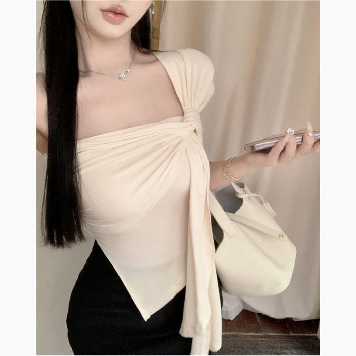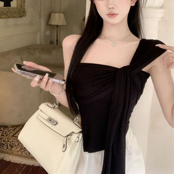 純欲辣妹短款不規則露肩吊帶背心女夏季新款修身褶皺小衆上衣
