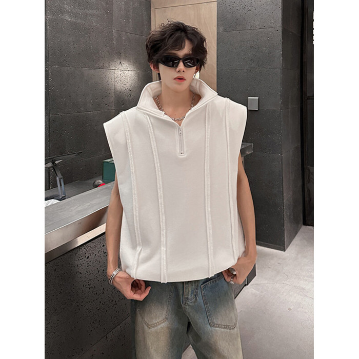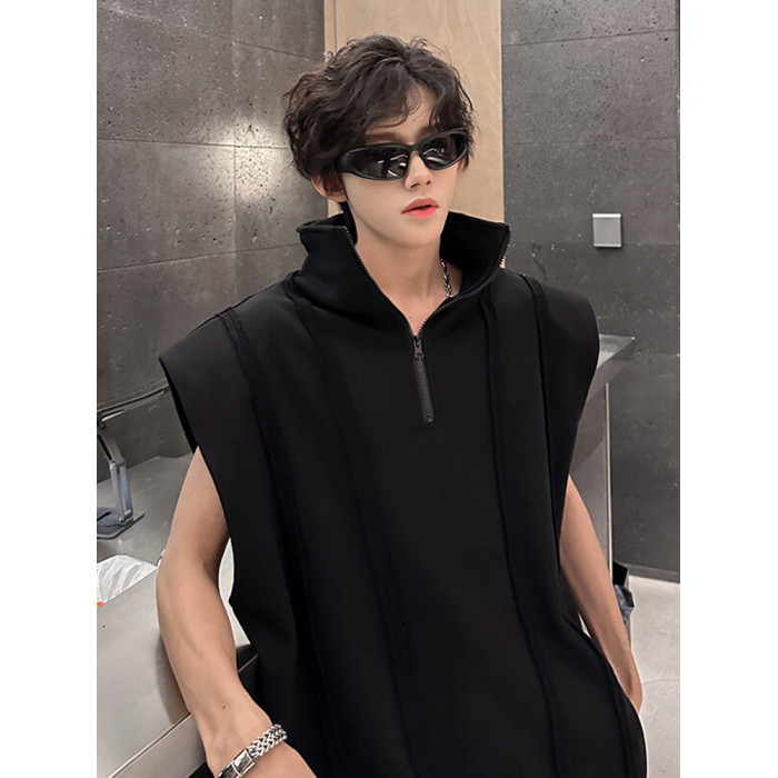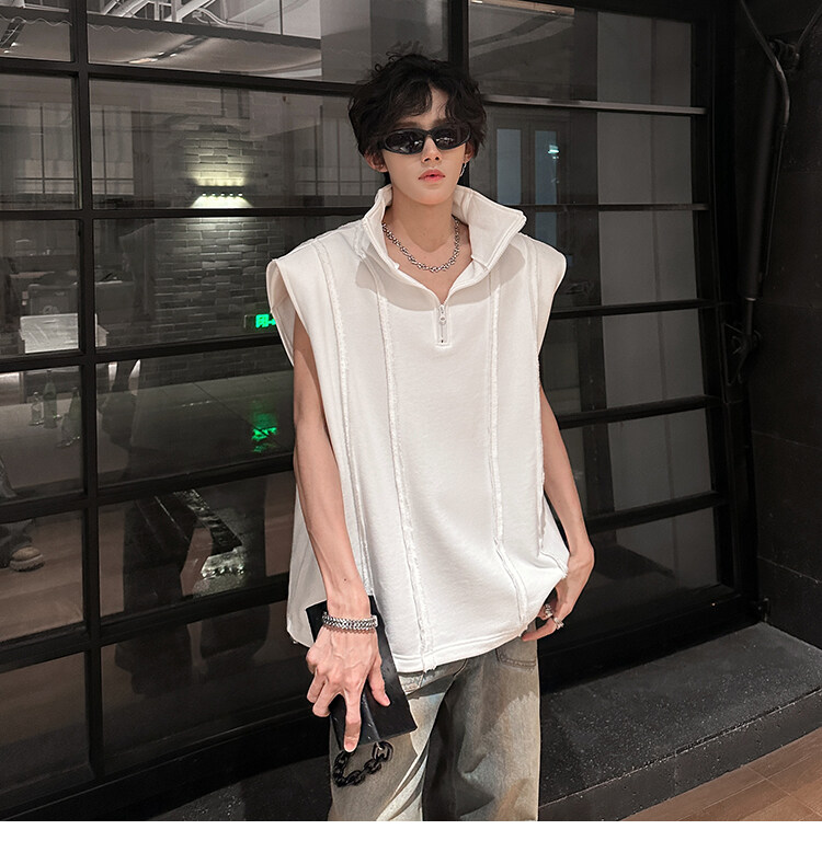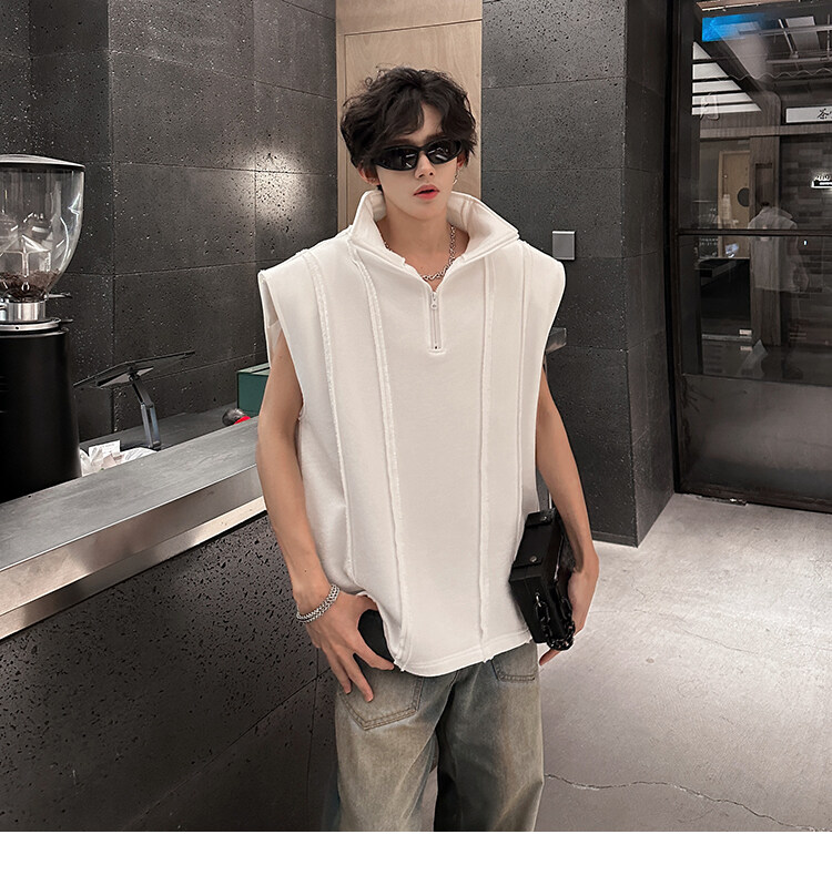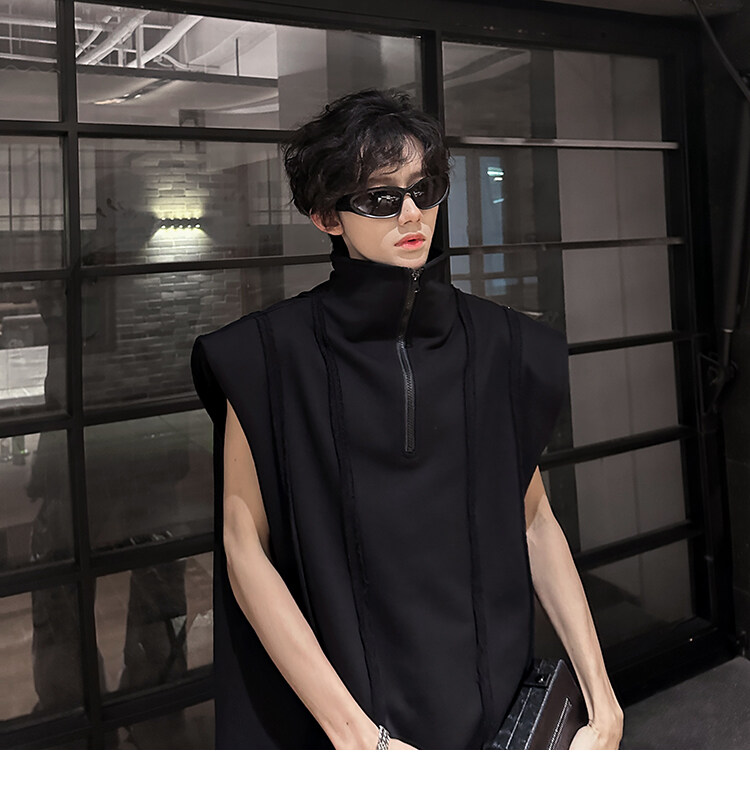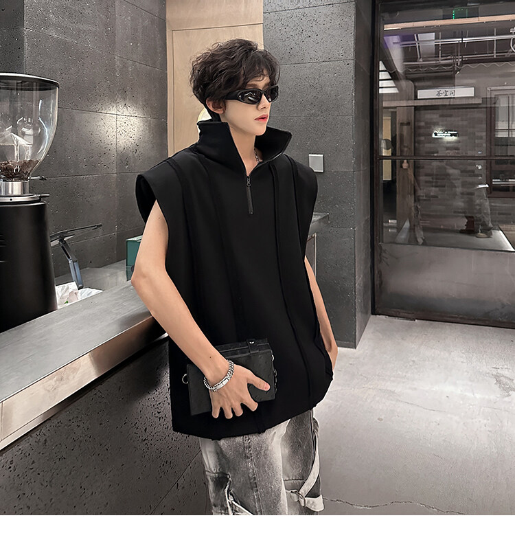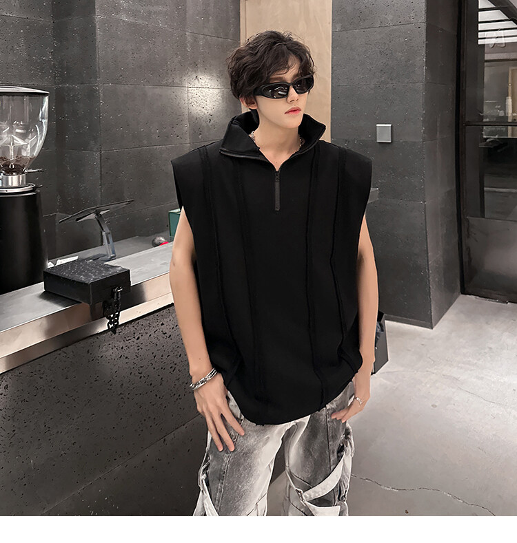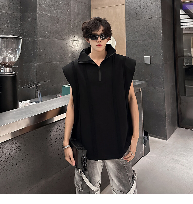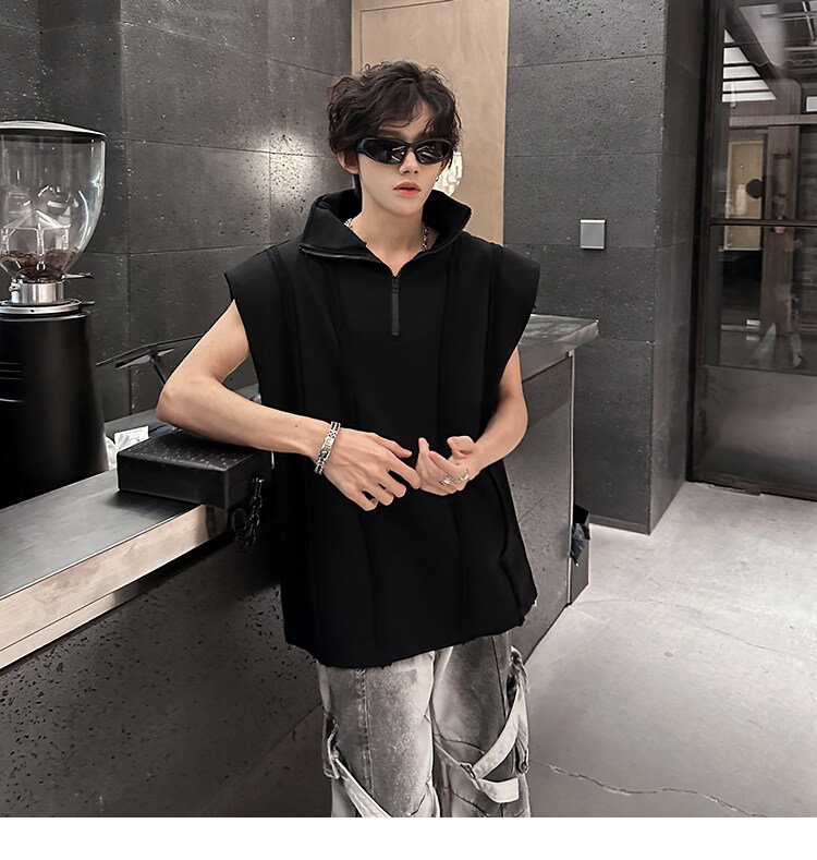 半拉鍊墊肩立領無袖t恤男夏季潮牌cleanfit痞帥寬松運動坎肩背心