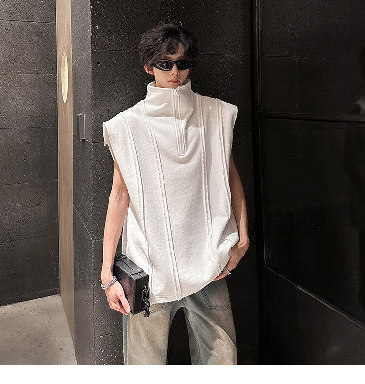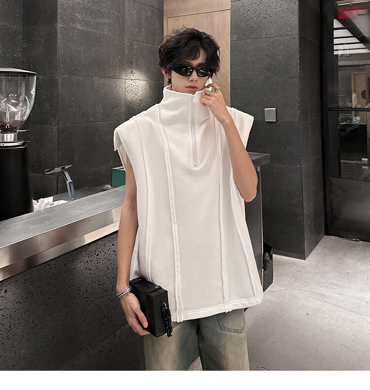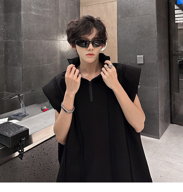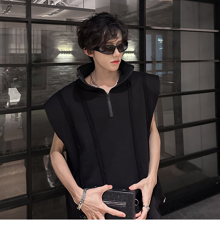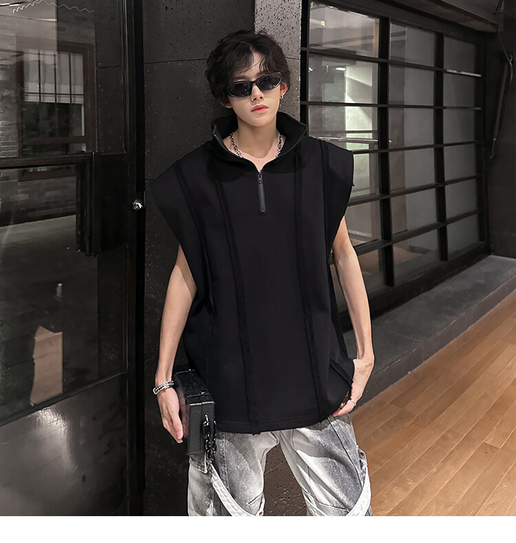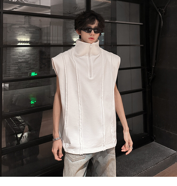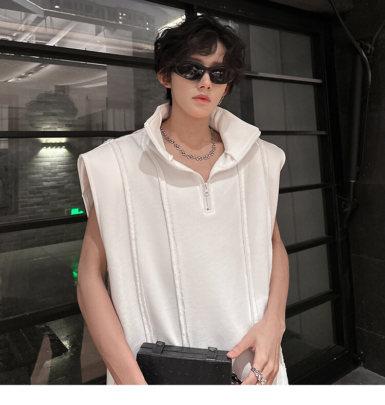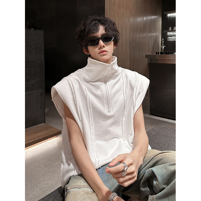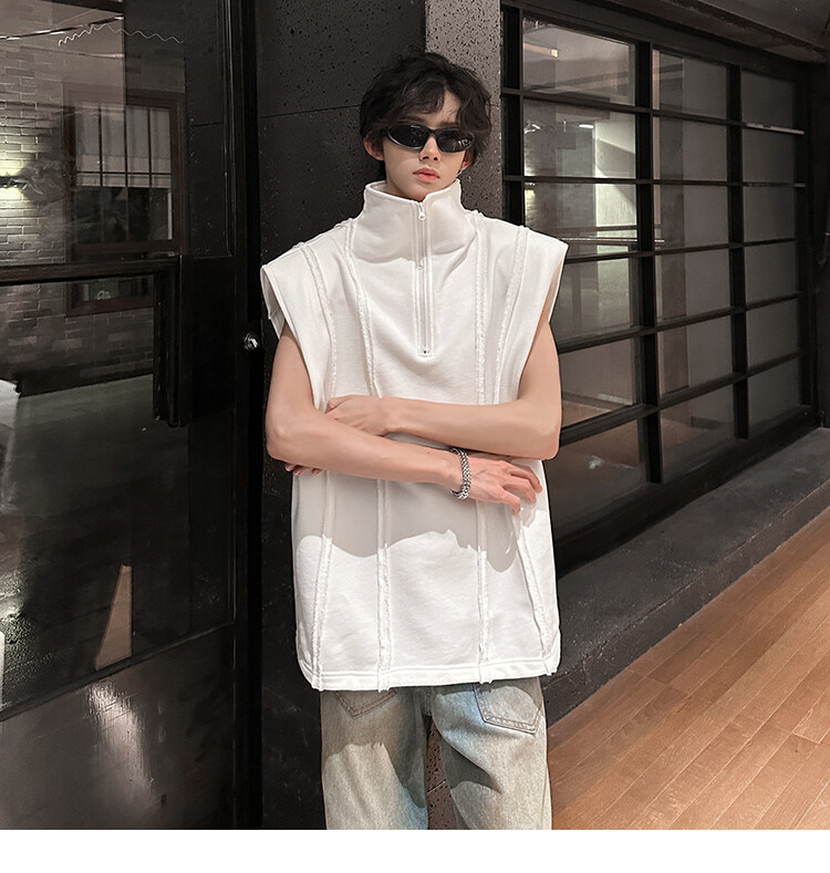 半拉鍊墊肩立領無袖t恤男夏季潮牌cleanfit痞帥寬松運動坎肩背心