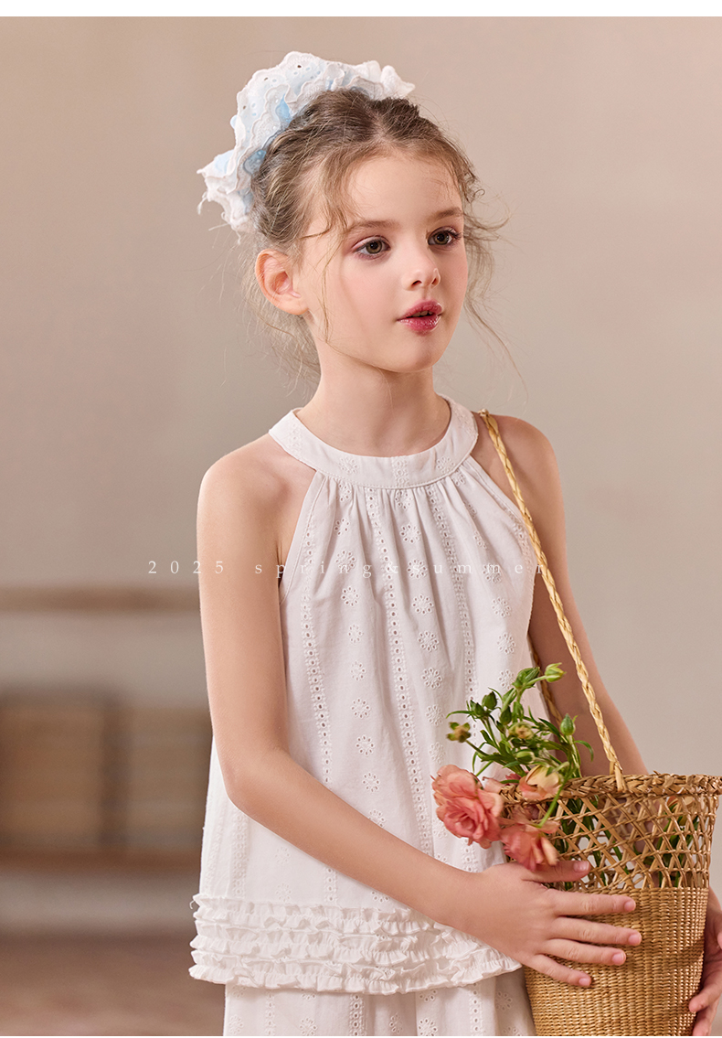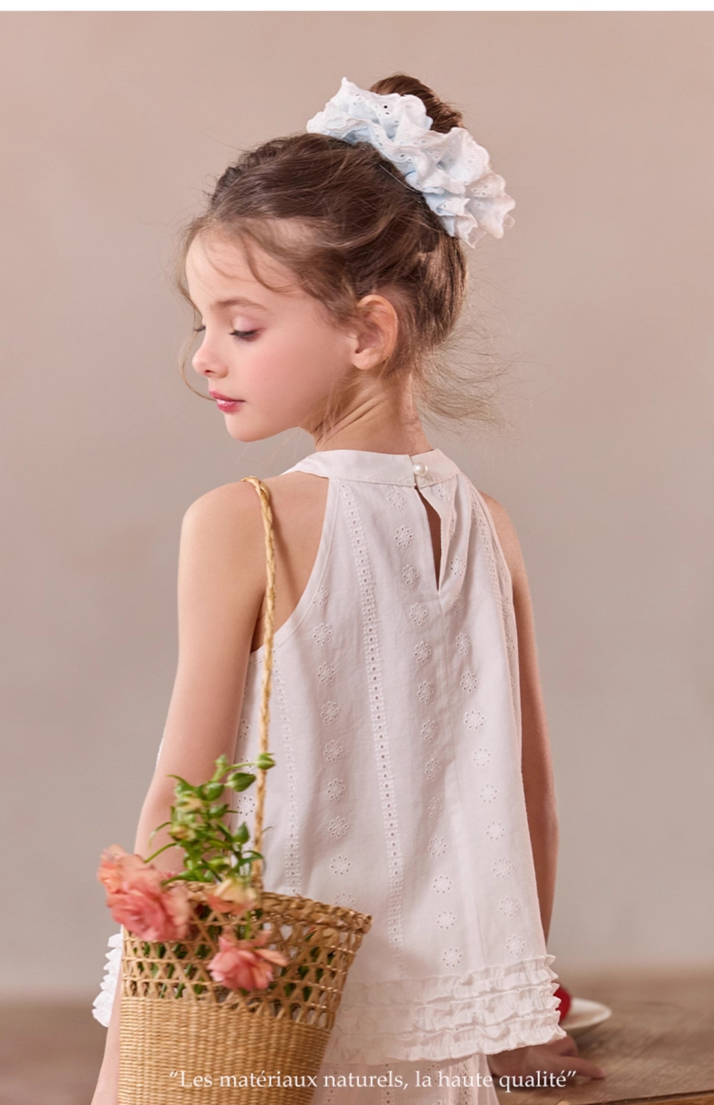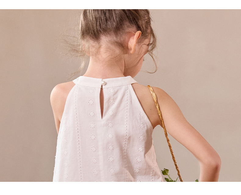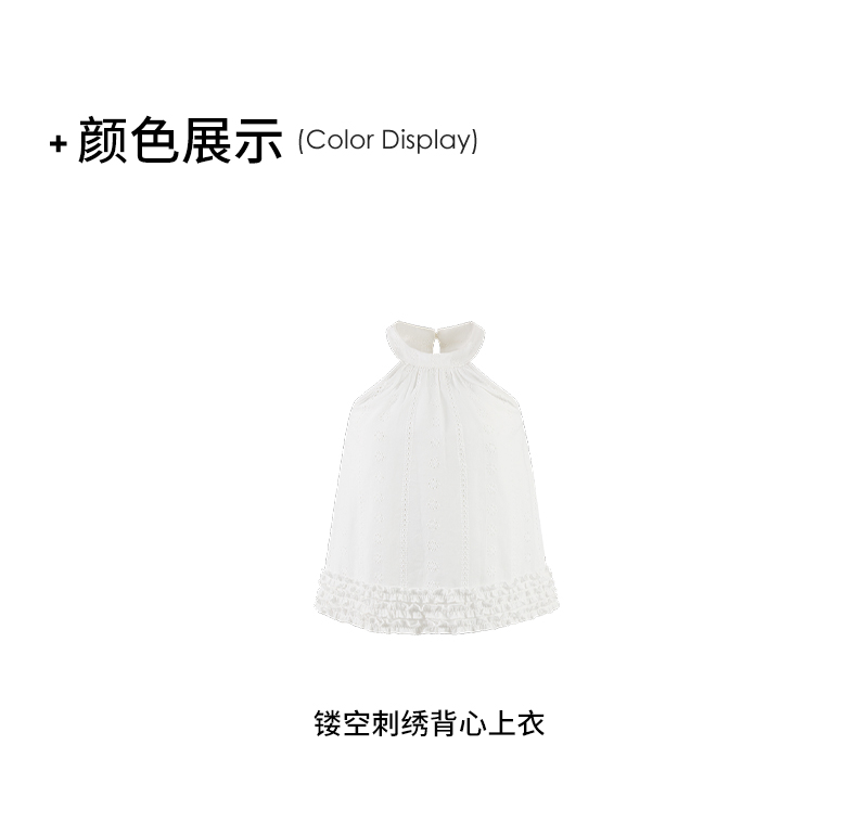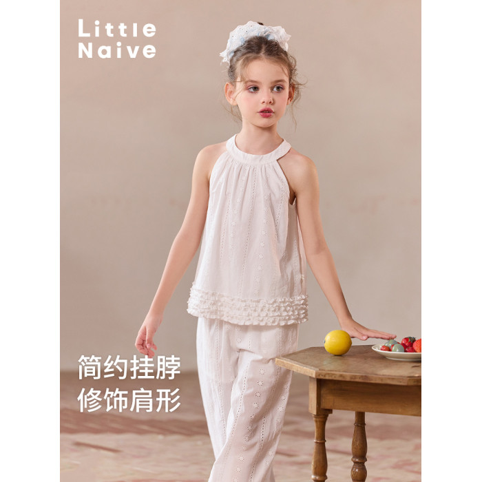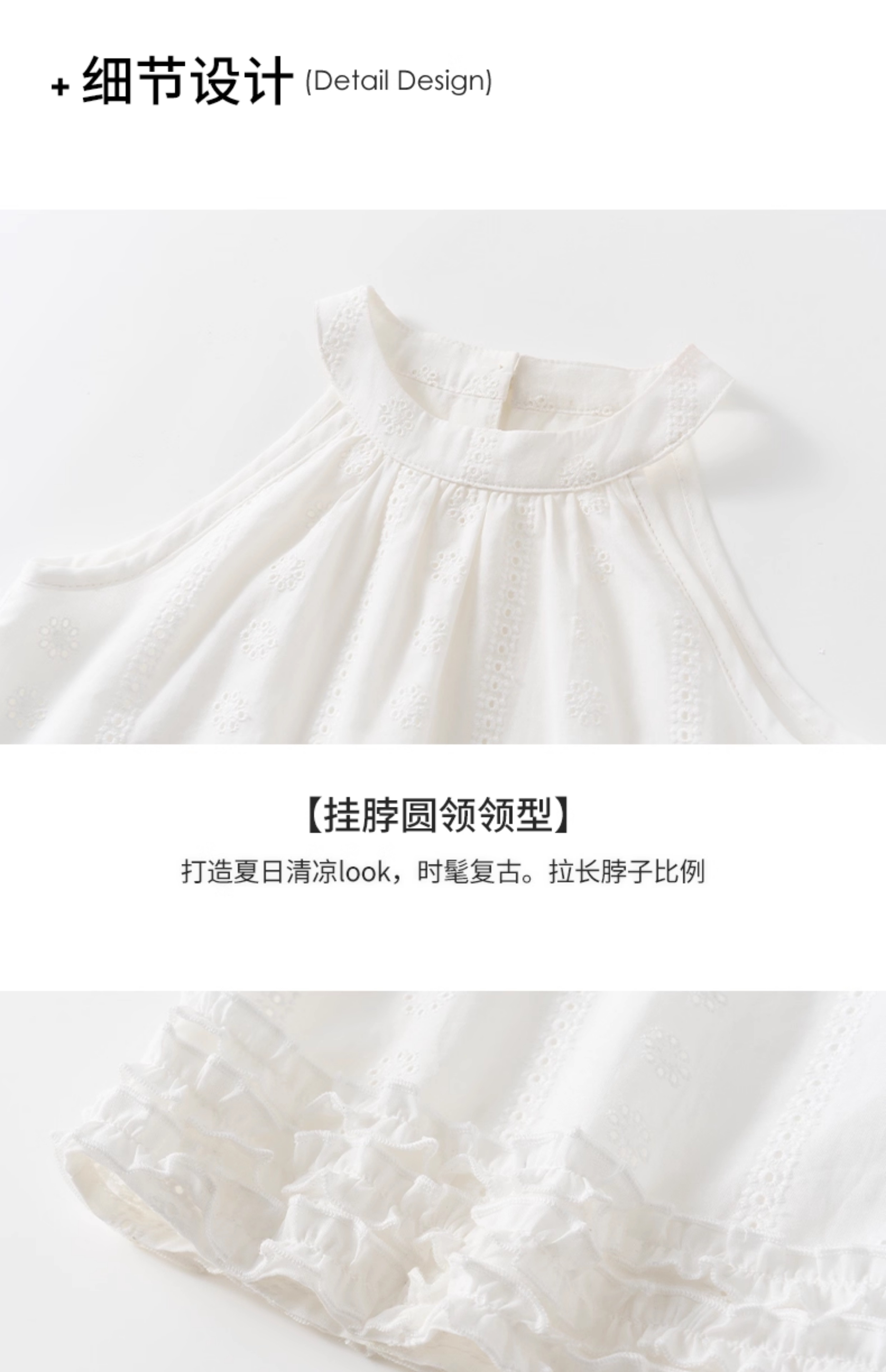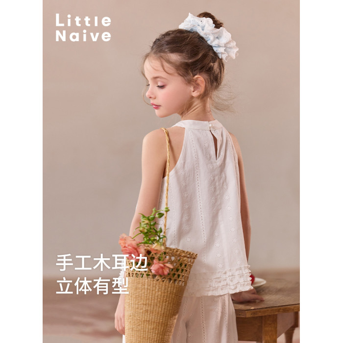 Little Naive兒童法式掛脖上衣夏款白色鏤空刺綉背心女童無袖T恤