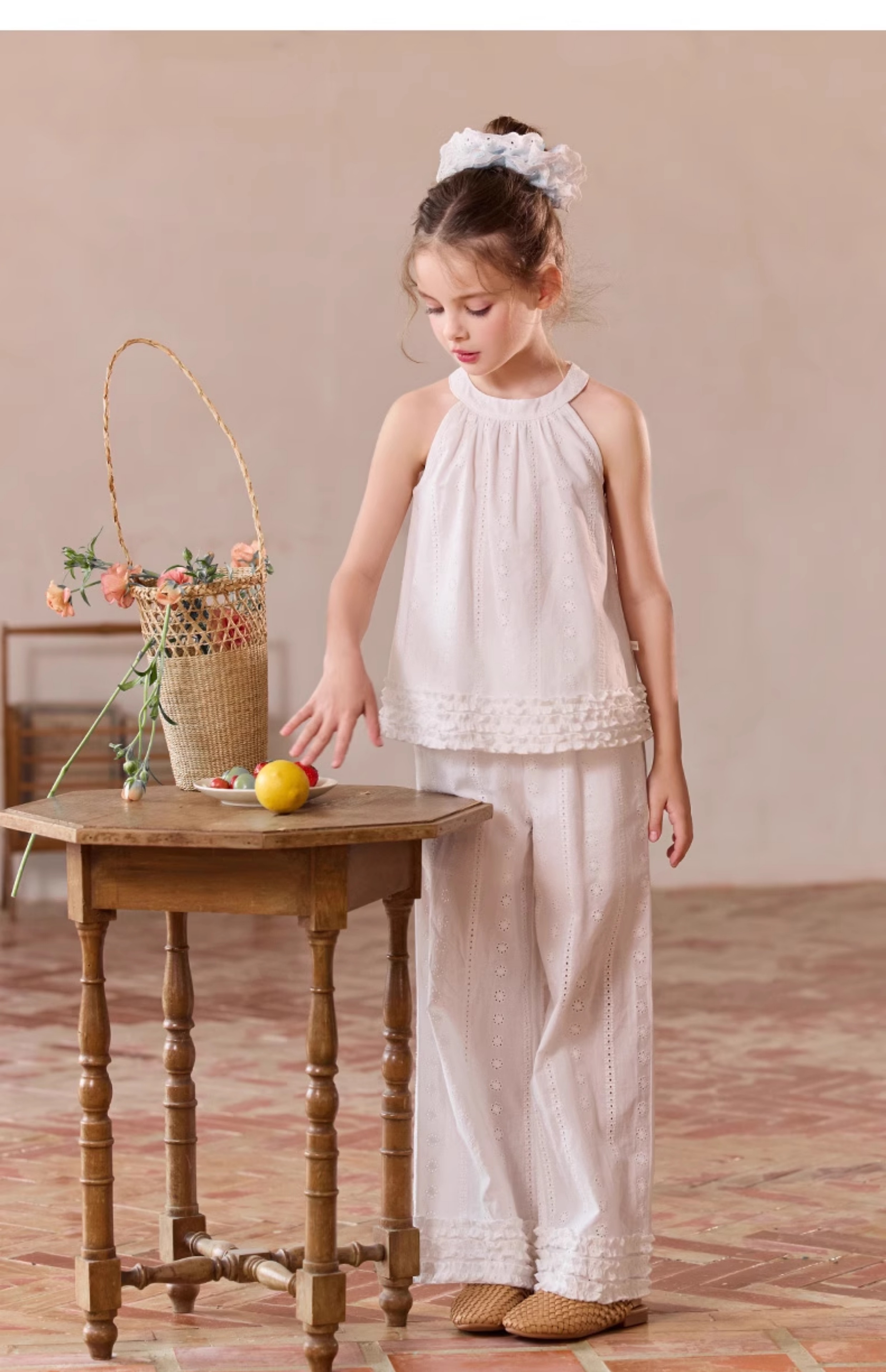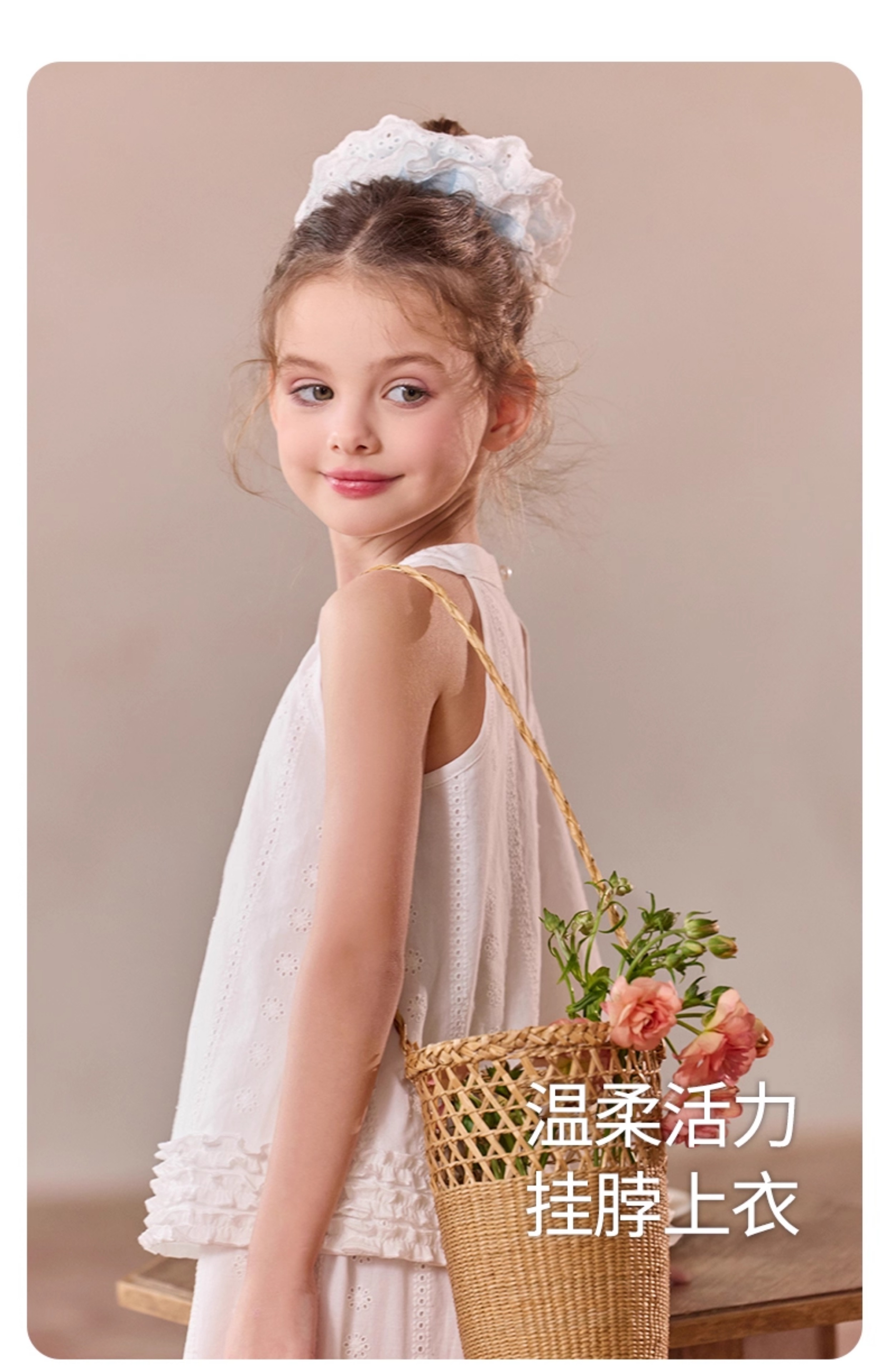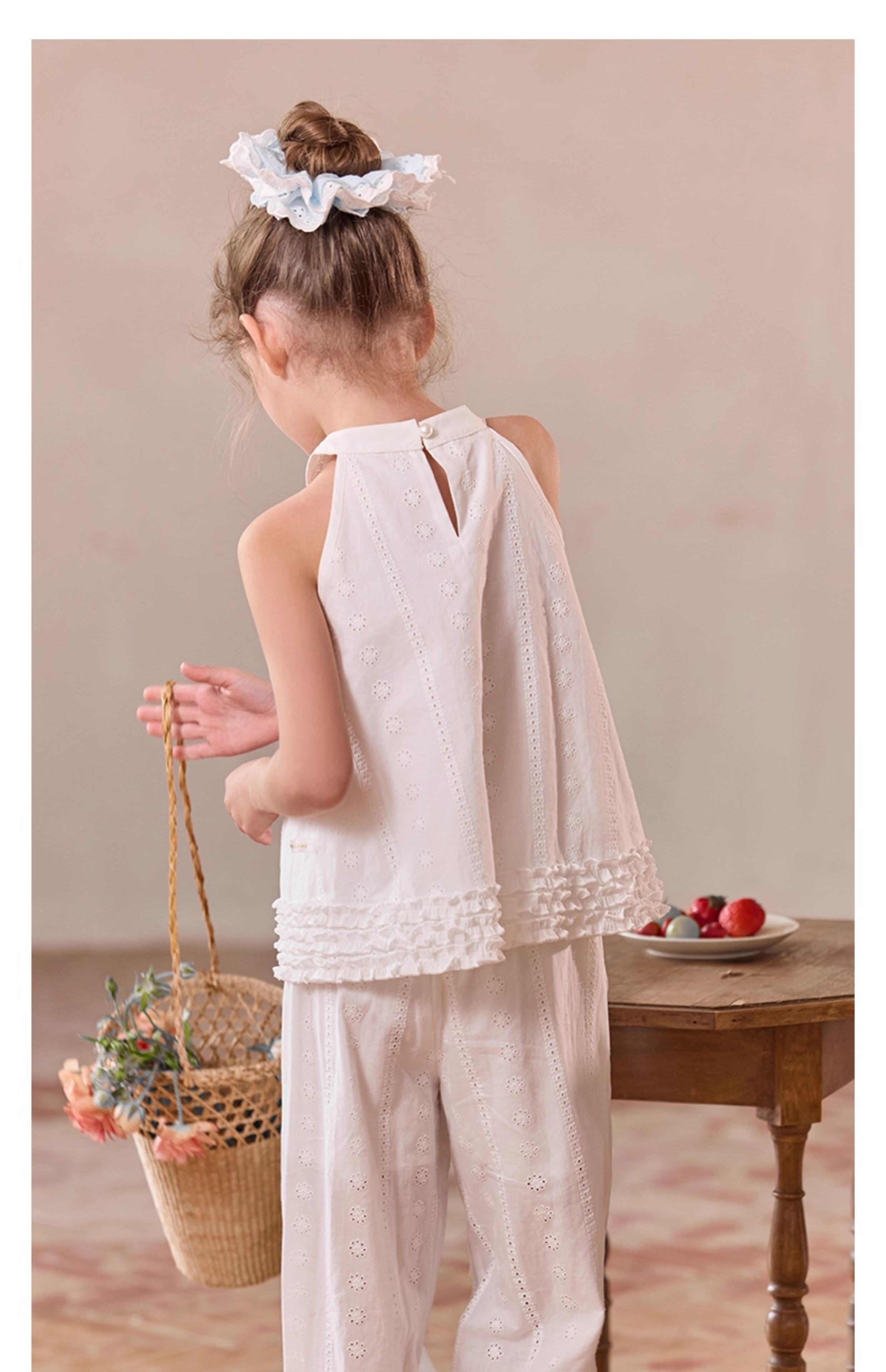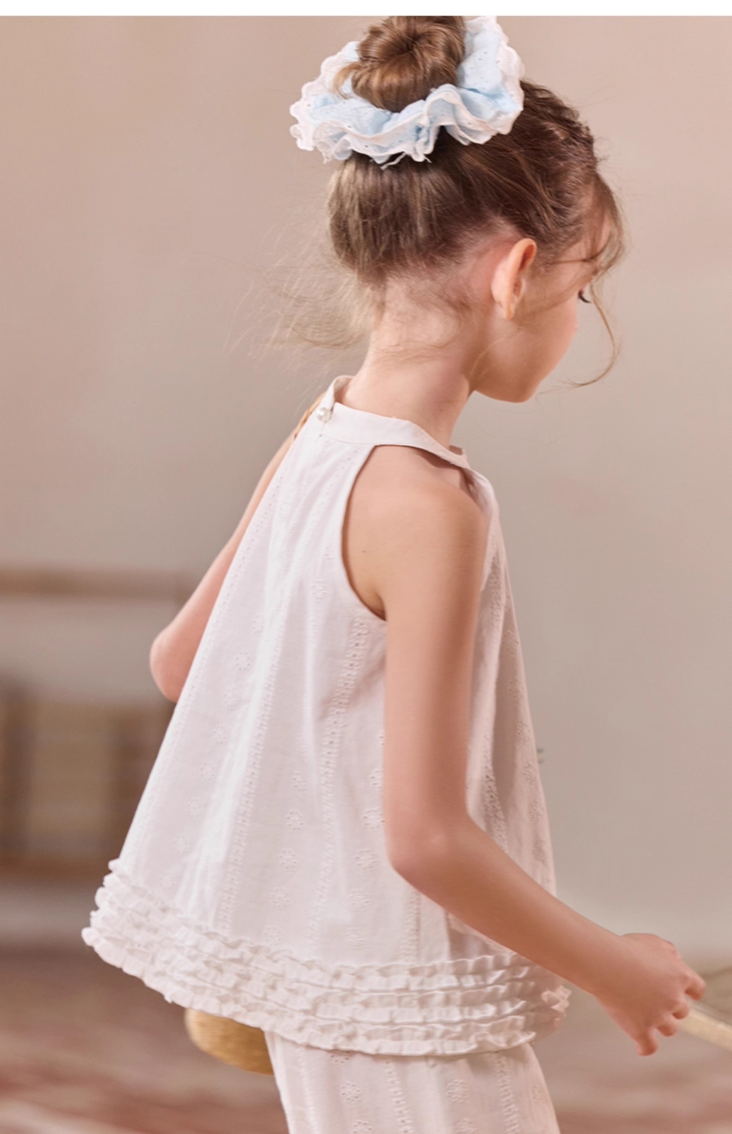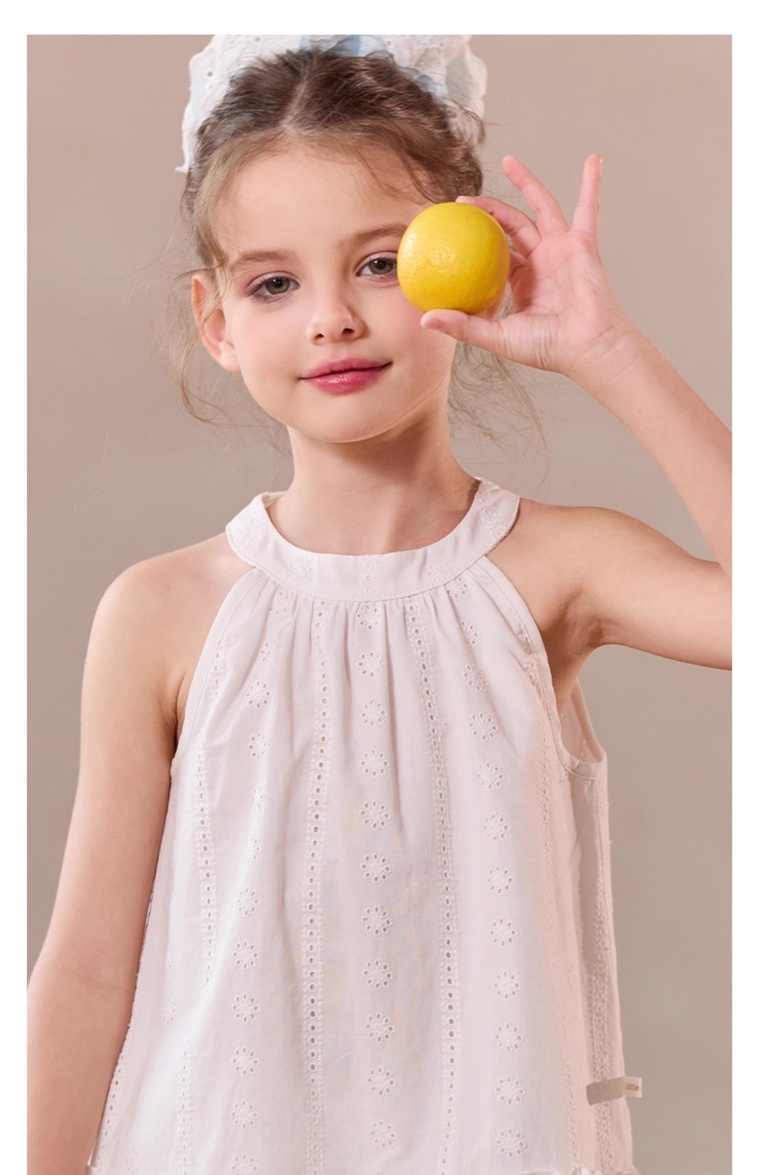Little Naive兒童法式掛脖上衣夏款白色鏤空刺綉背心女童無袖T恤