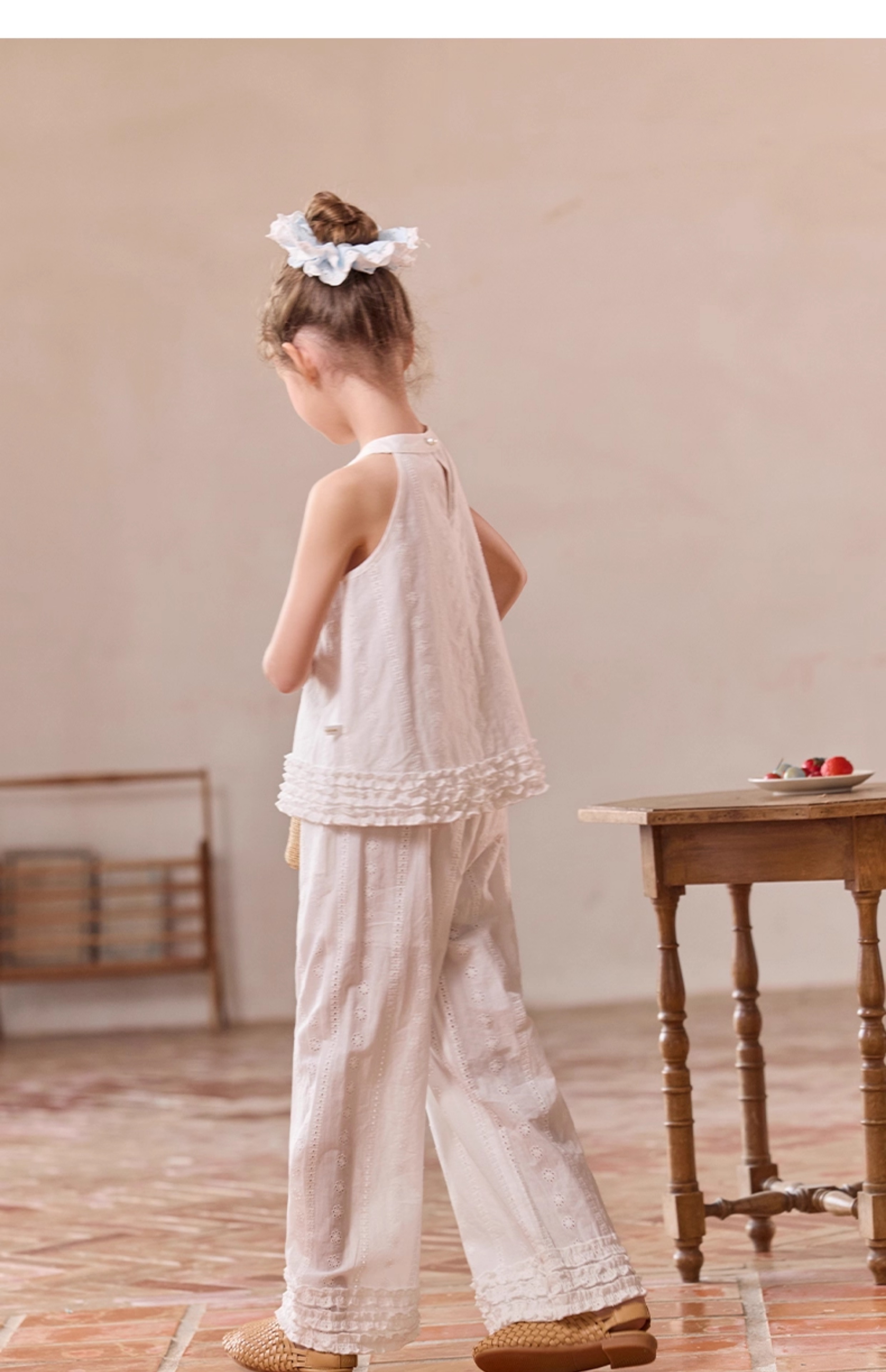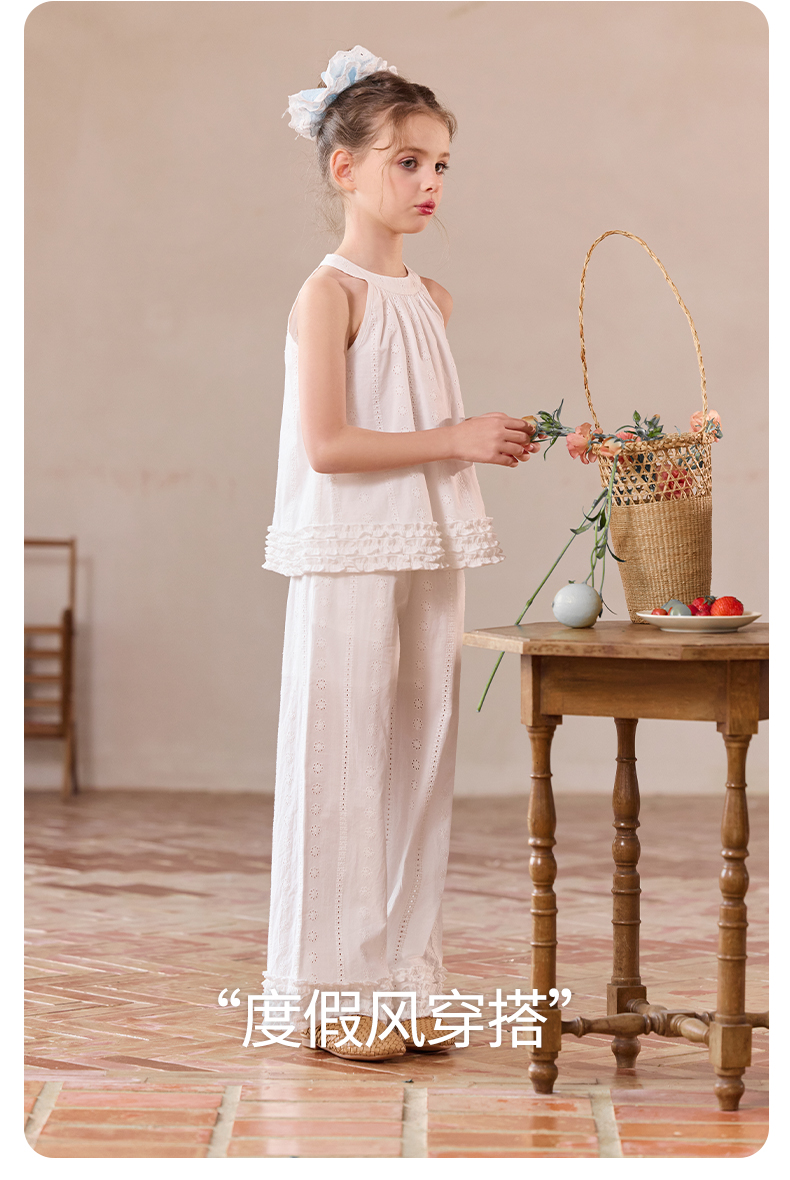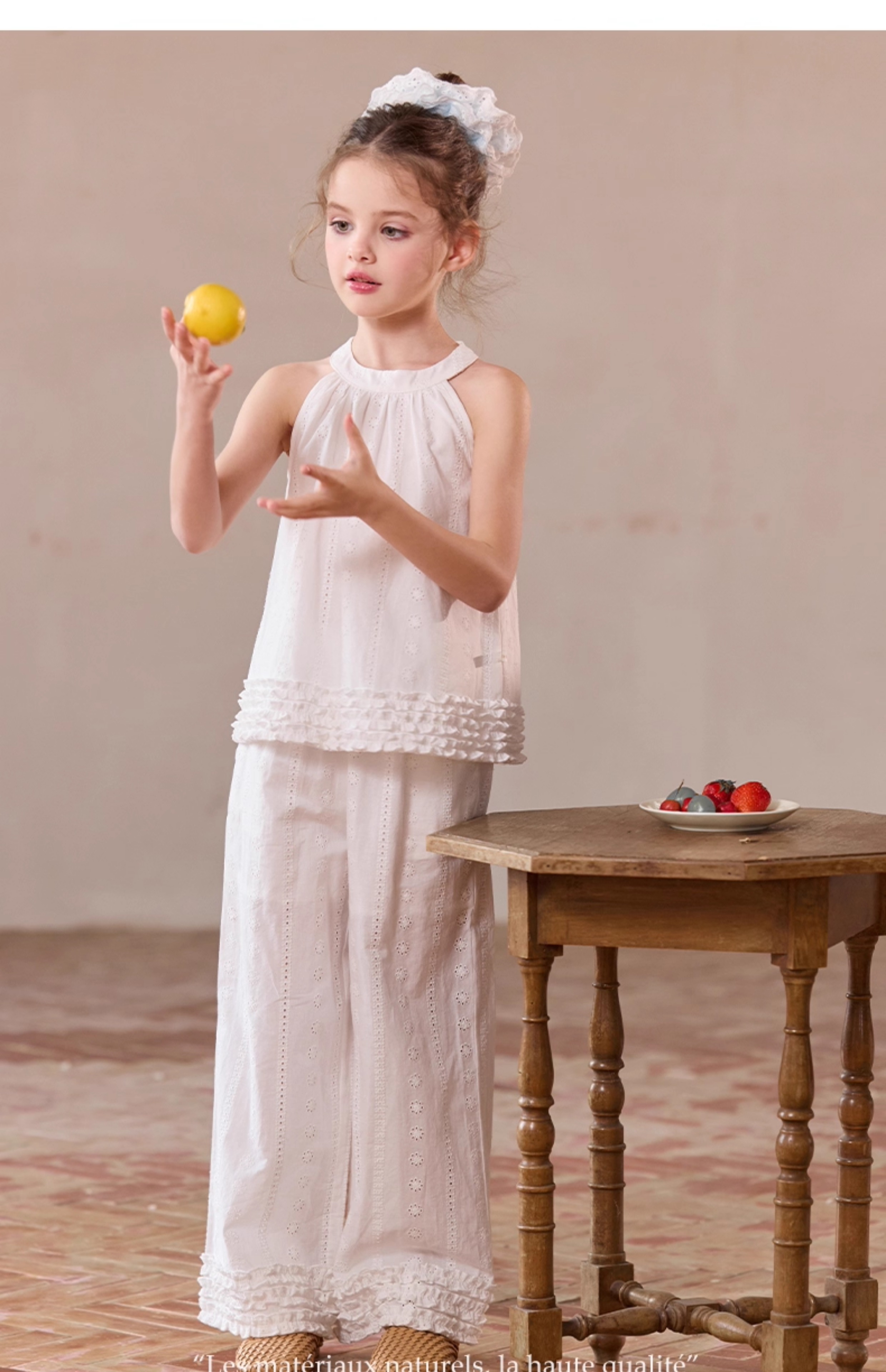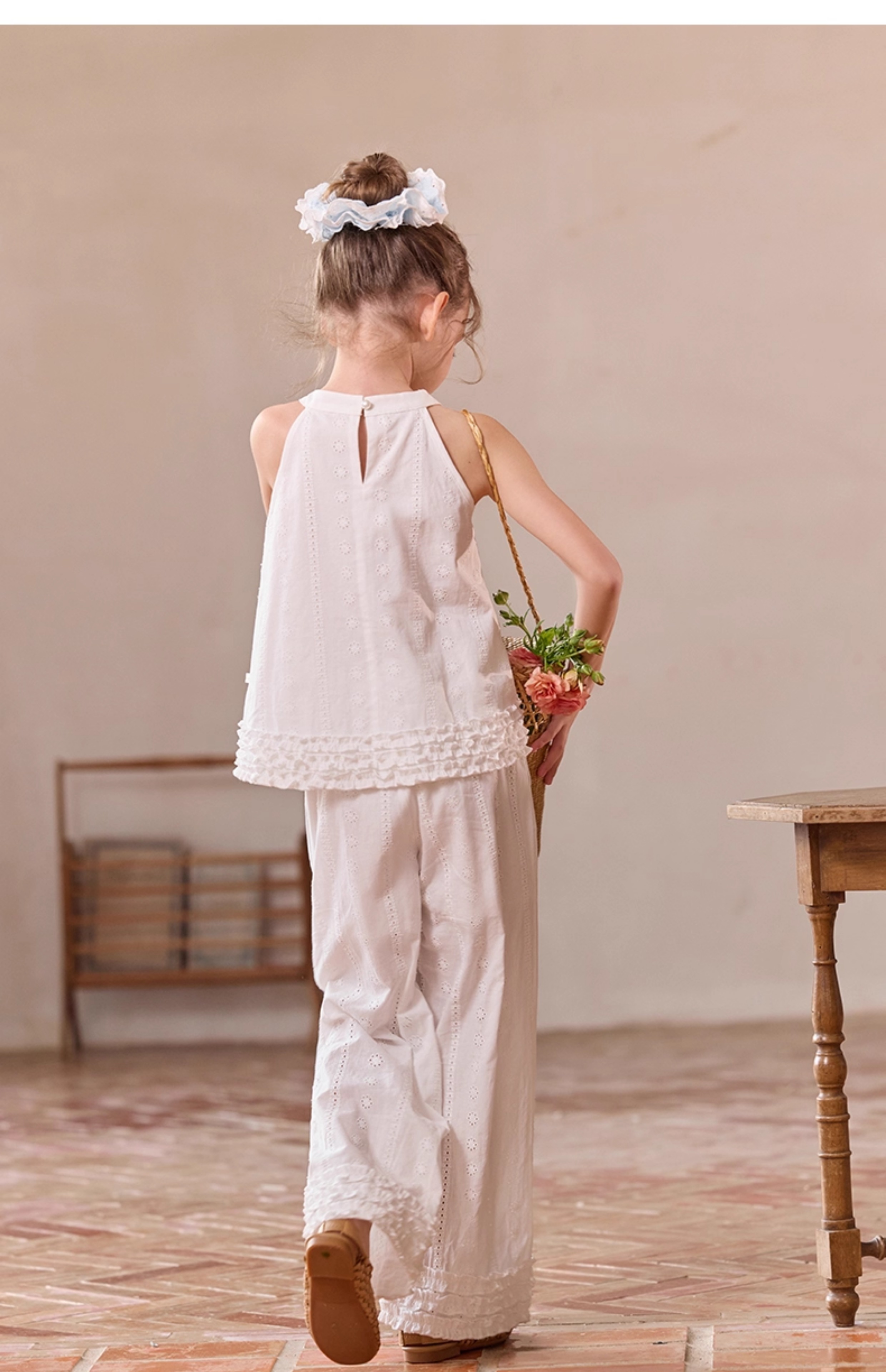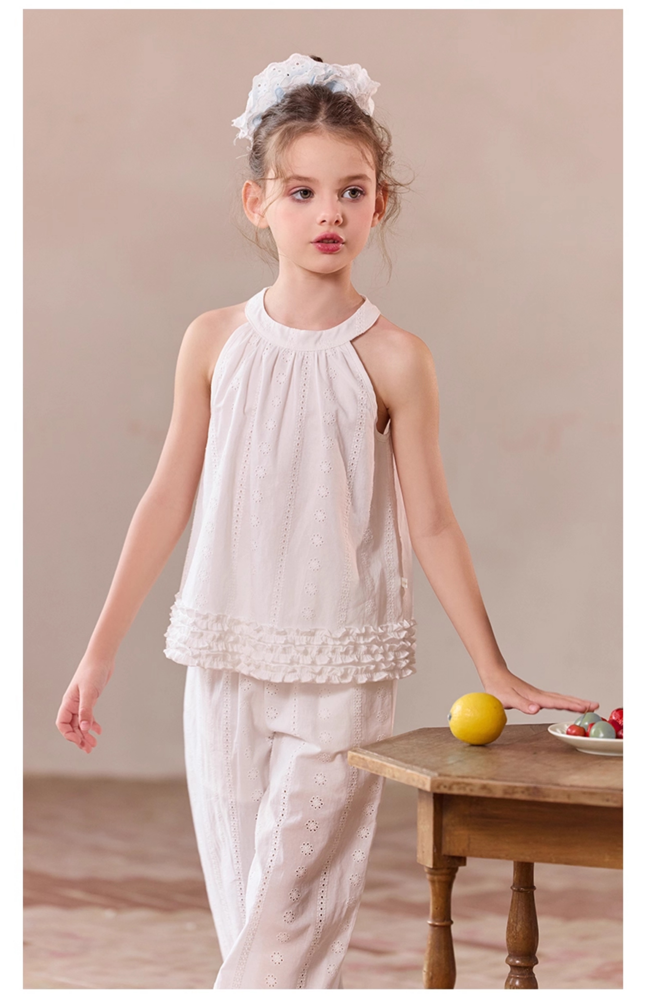 Little Naive兒童法式掛脖上衣夏款白色鏤空刺綉背心女童無袖T恤