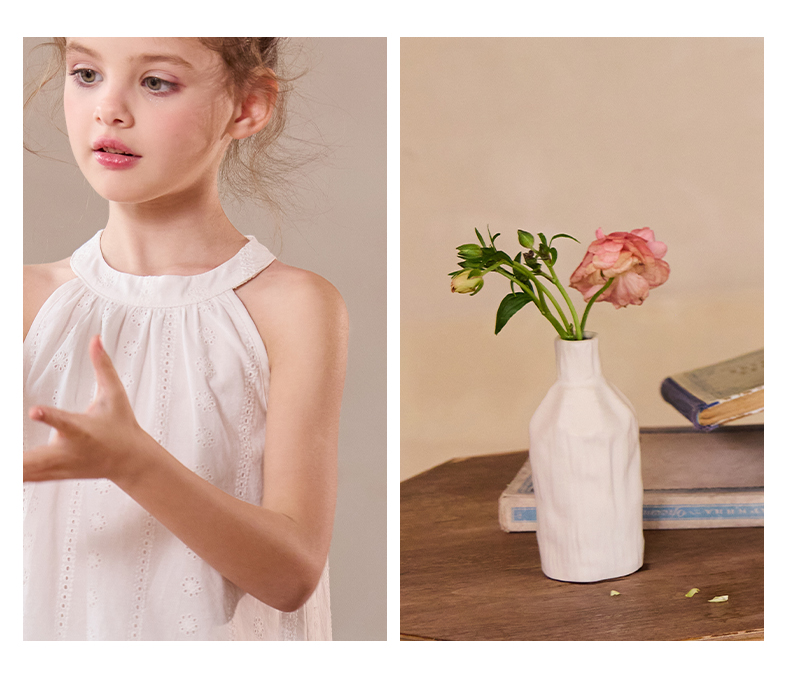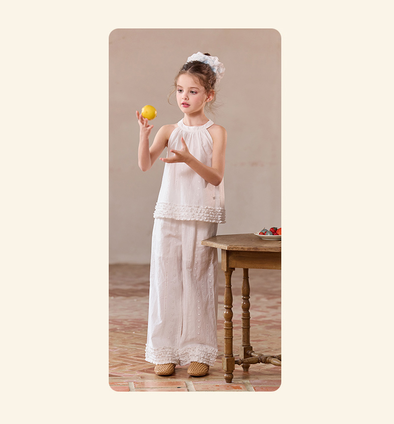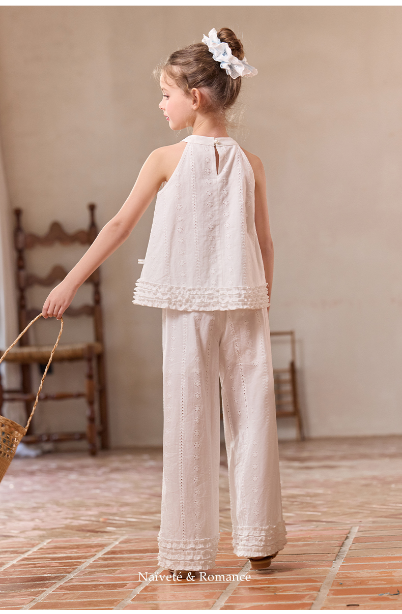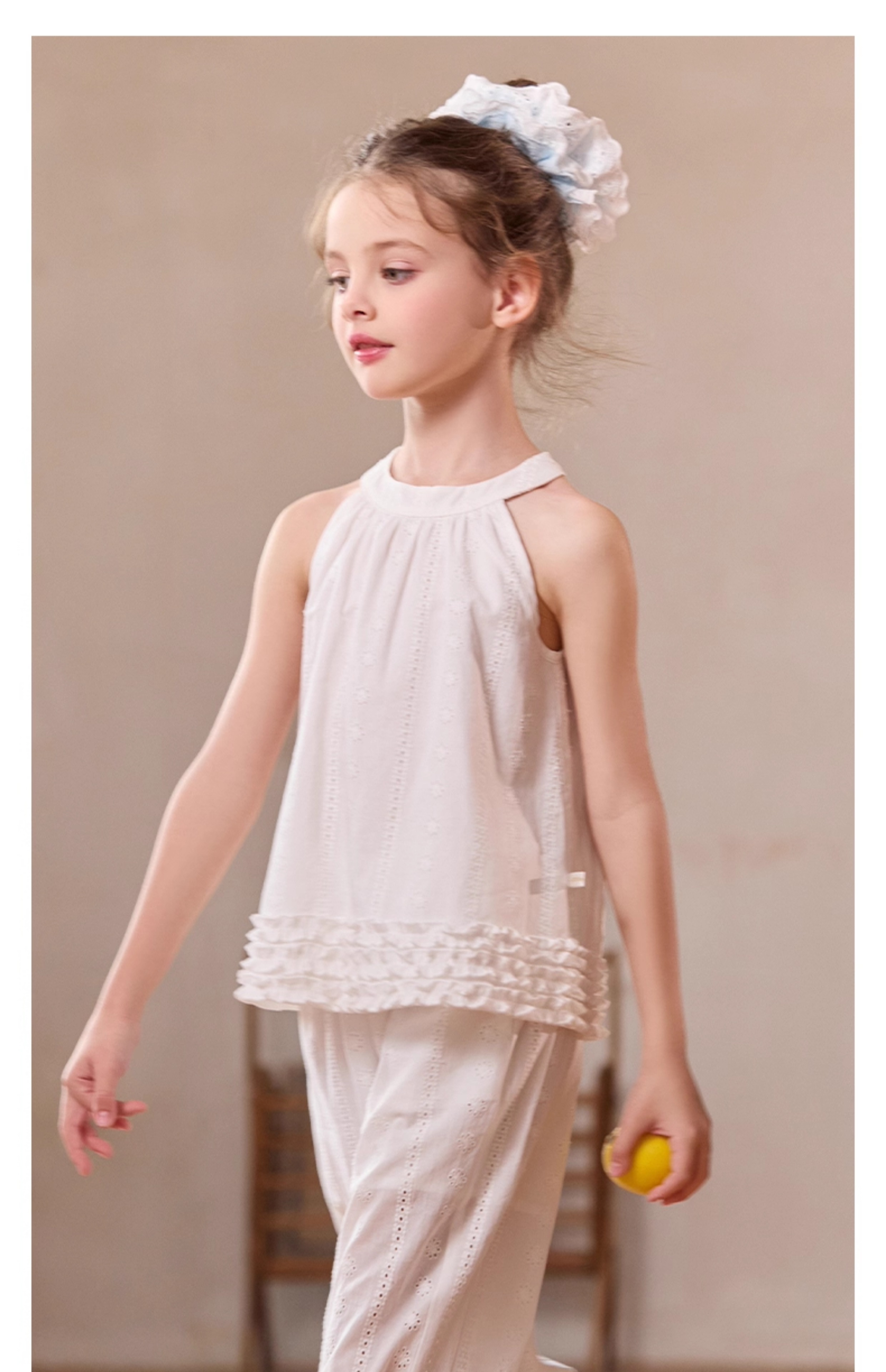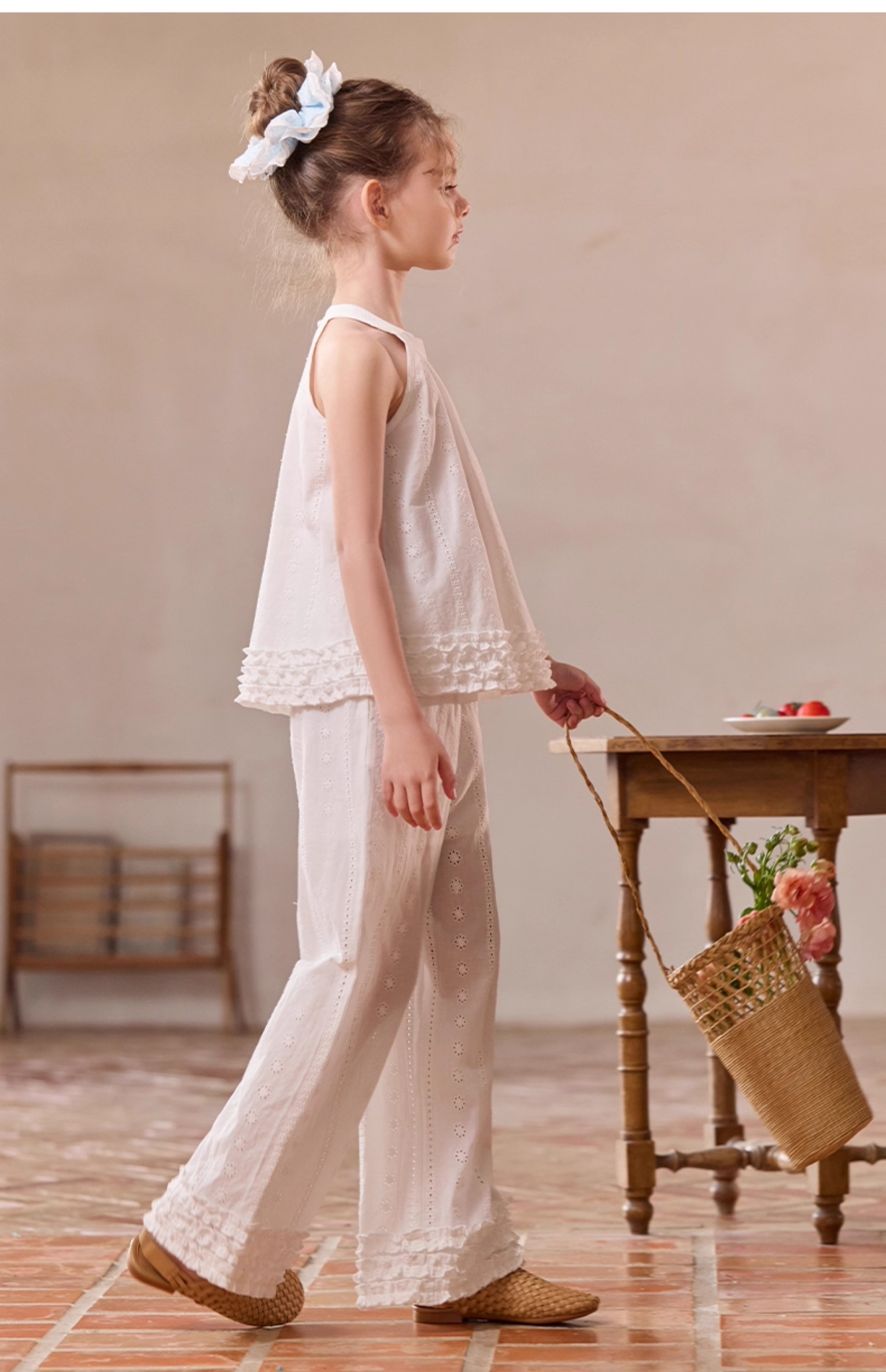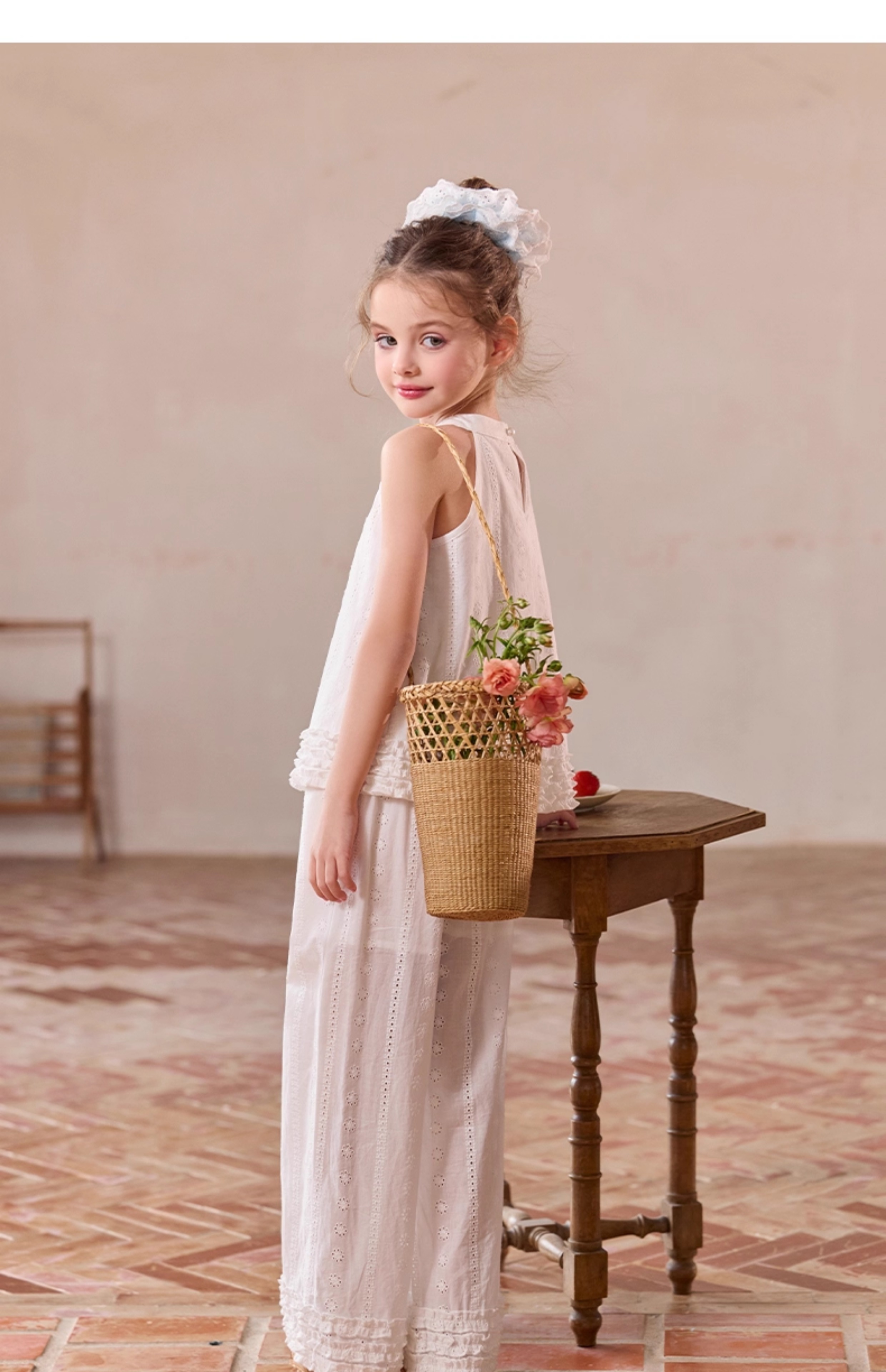 Little Naive兒童法式掛脖上衣夏款白色鏤空刺綉背心女童無袖T恤