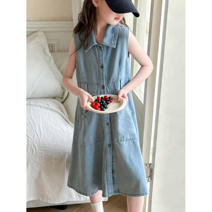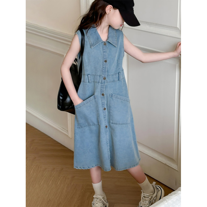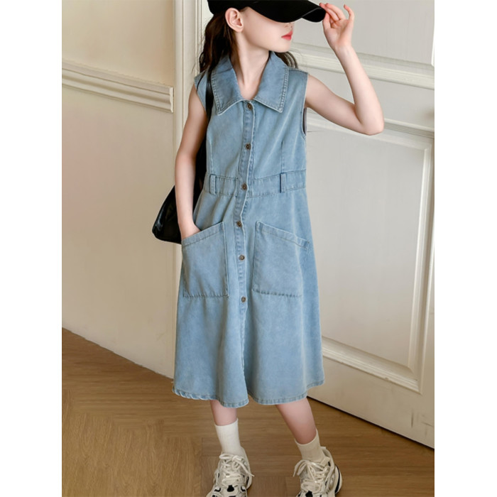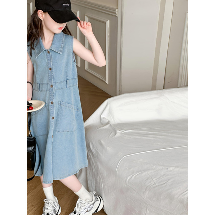 女童連衣裙夏裝2024新款中大童翻領牛仔裙休閒韓版收腰背心裙洋氣