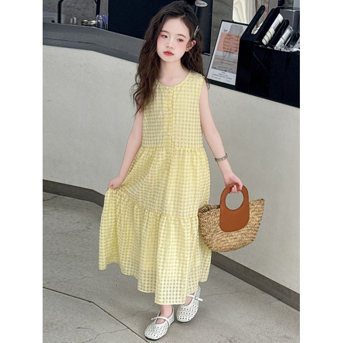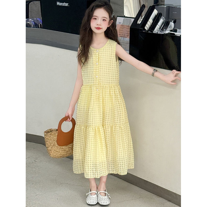 女童格子連衣裙夏季2025新款洋氣大童法式黃色氣質背心長裙沙灘裙