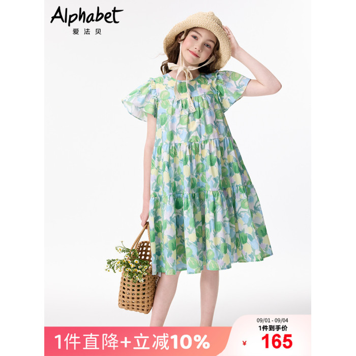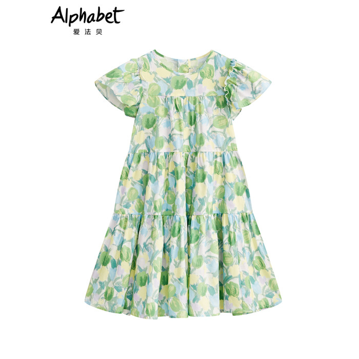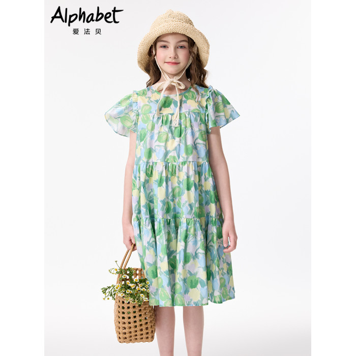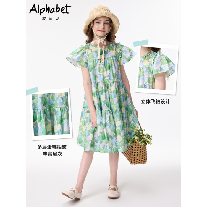 愛法貝2025夏季新款女童碎花連衣裙中大兒童裝小飛袖洋氣純棉裙子