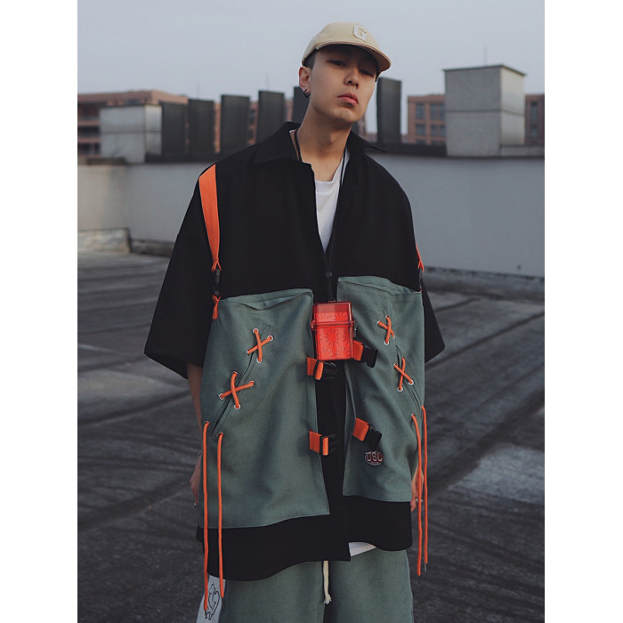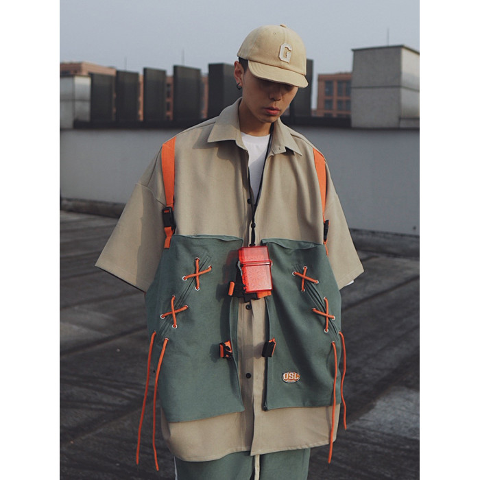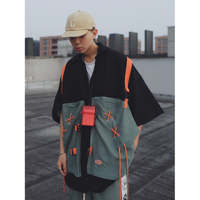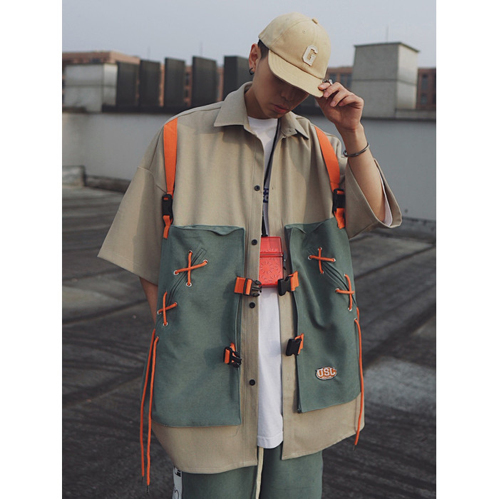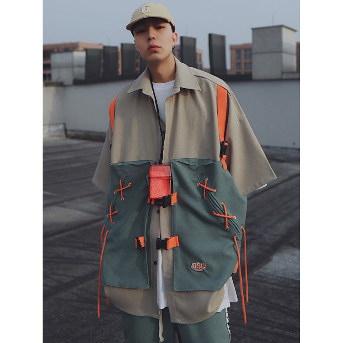 UUCSCC夏季美式休閒潮牌工裝短袖襯衫嘻哈寬松假兩件馬甲半袖T恤