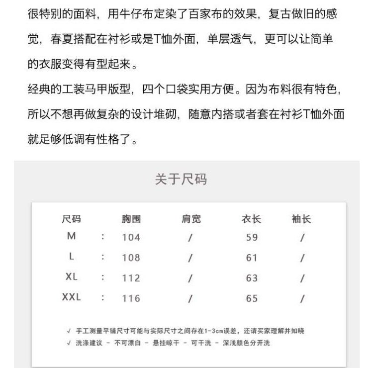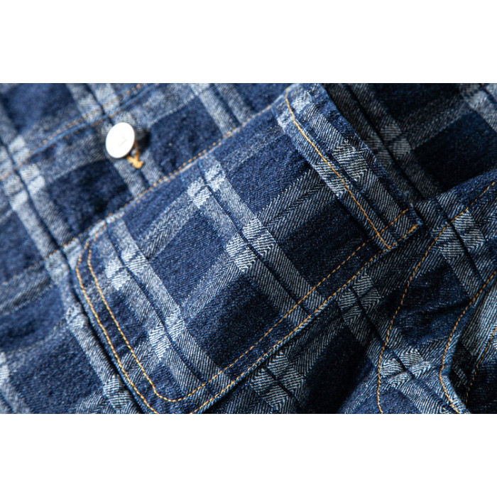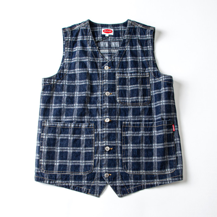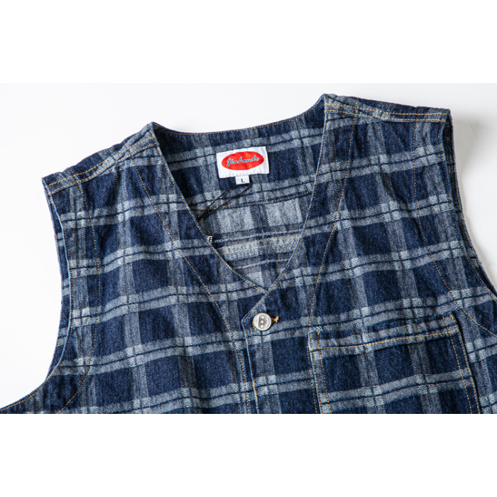 日系復古 美式休閒水洗阿美哢嘰重磅丹甯格子牛仔工裝情侶馬甲