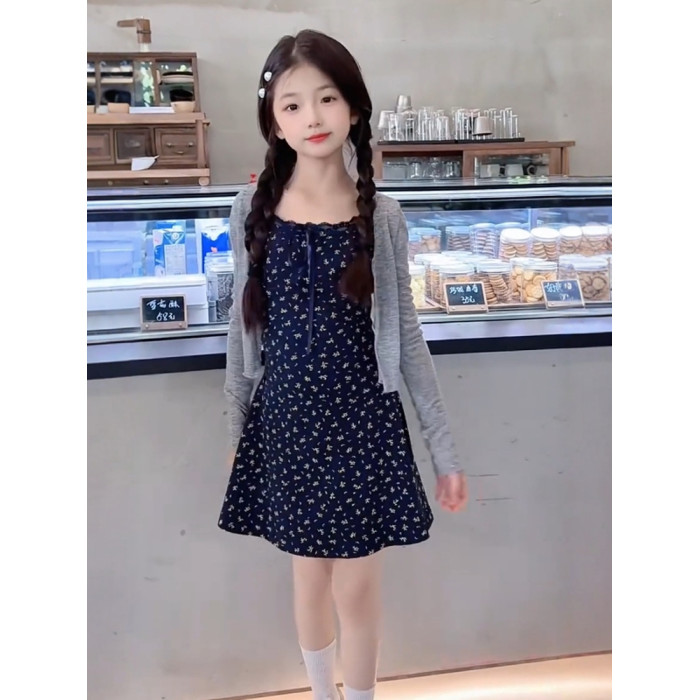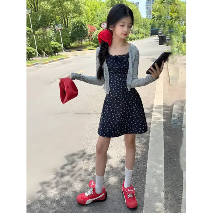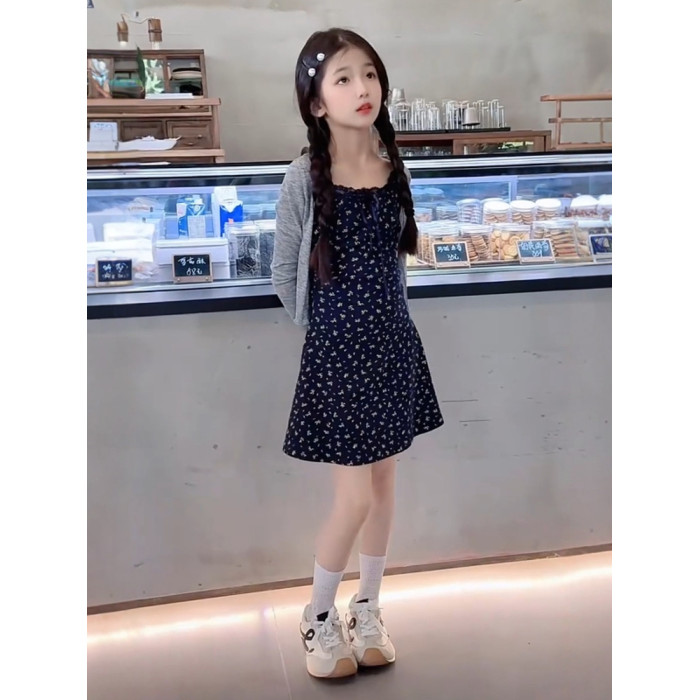女童夏季時尚甜美法式修身碎花吊帶連衣裙防曬針織開衫氣質套裝潮