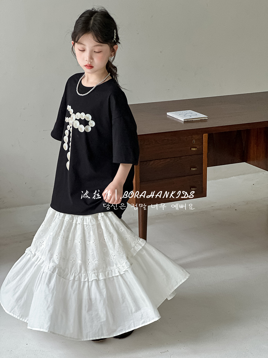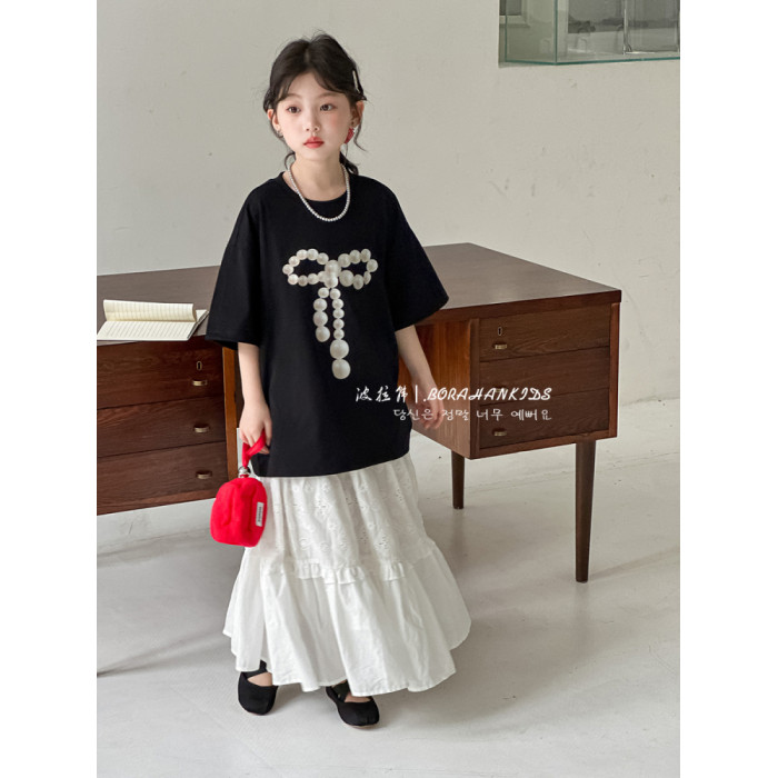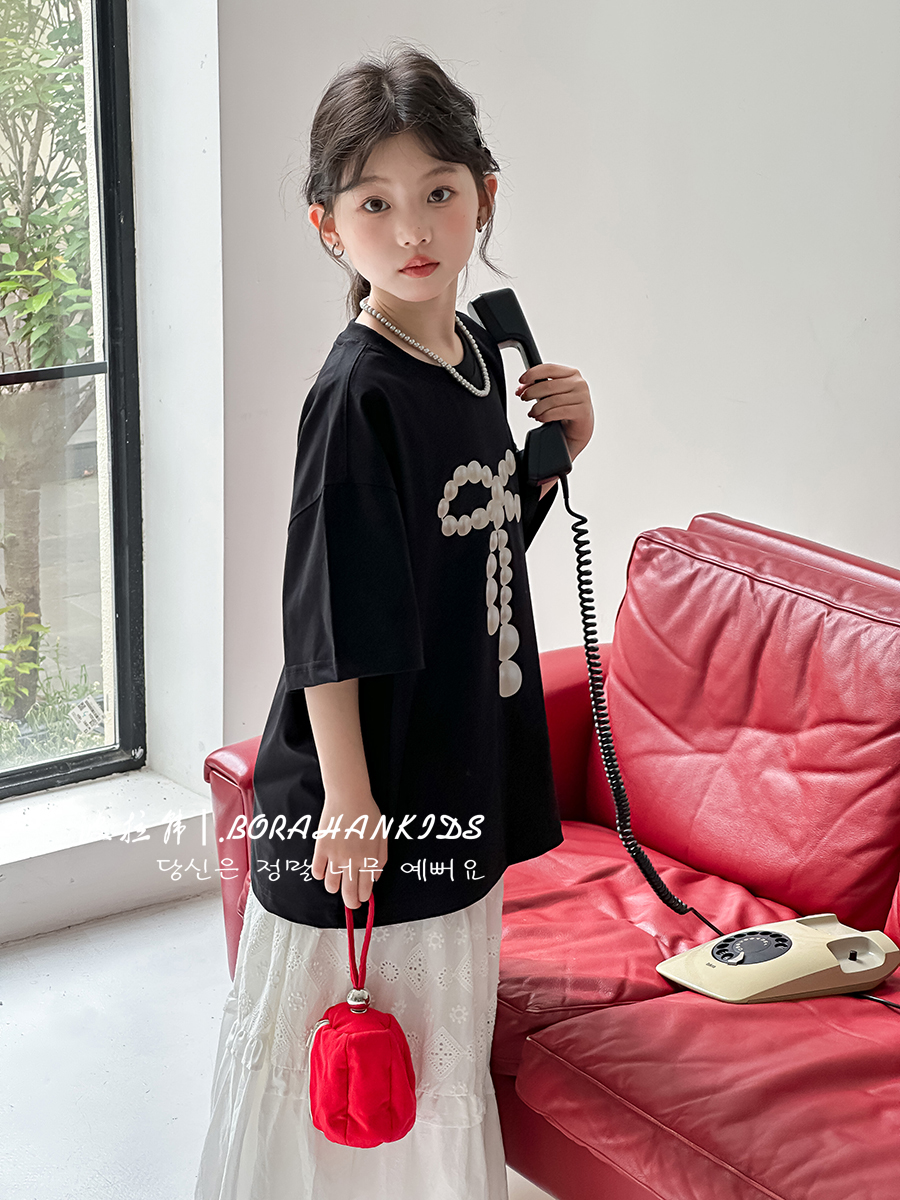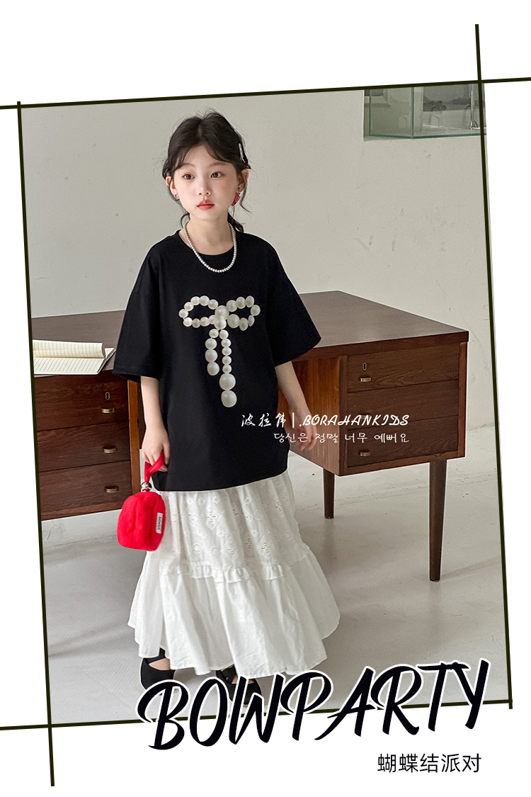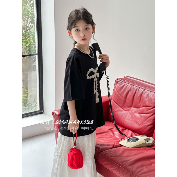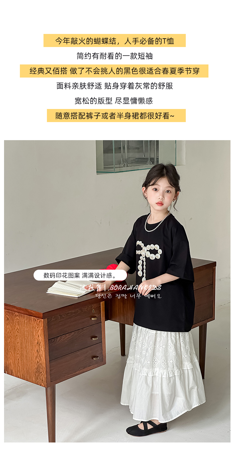 波拉韓女童短袖夏季兒童蝴蝶結T恤2025新款女孩半袖t中大童體恤