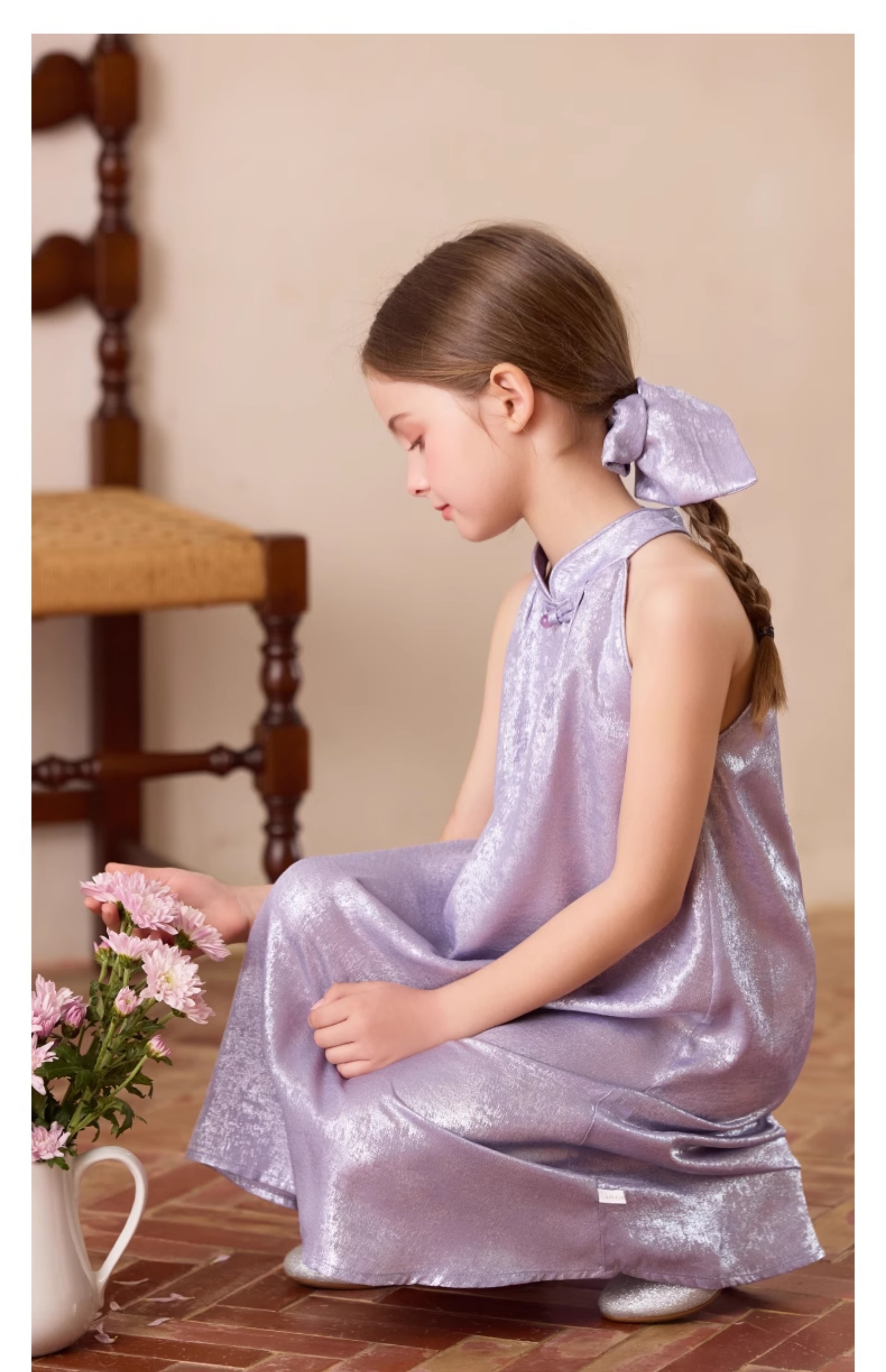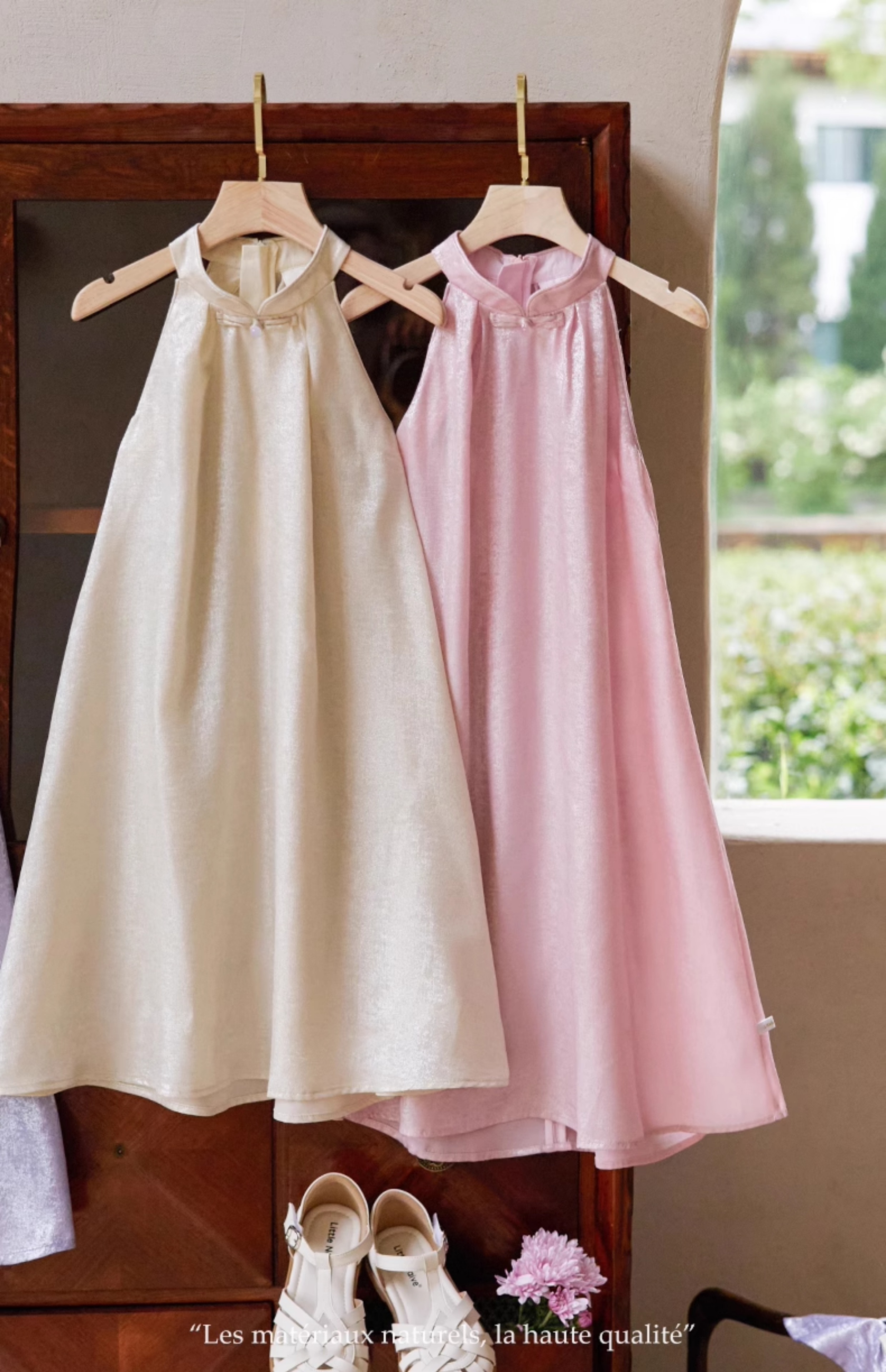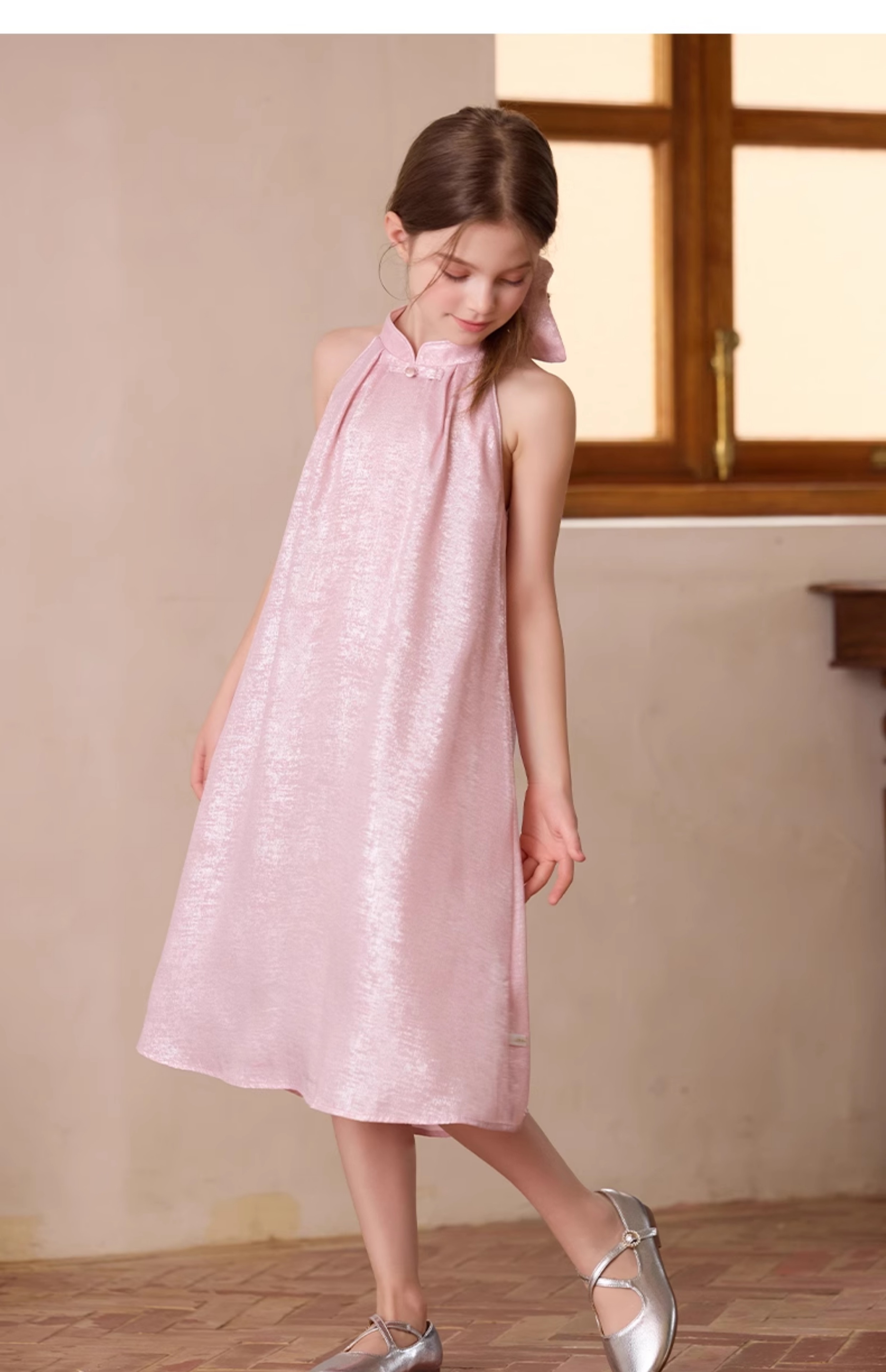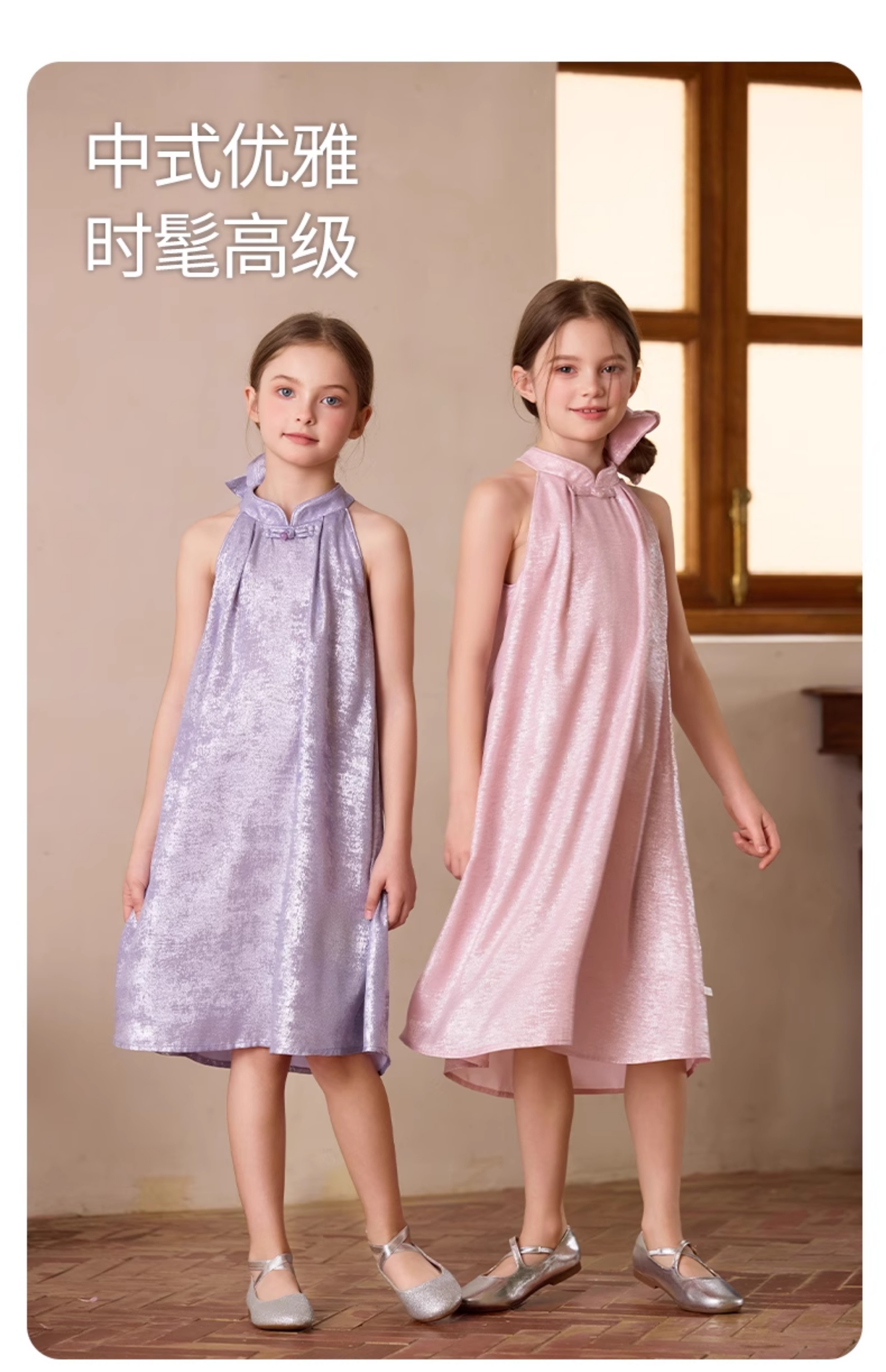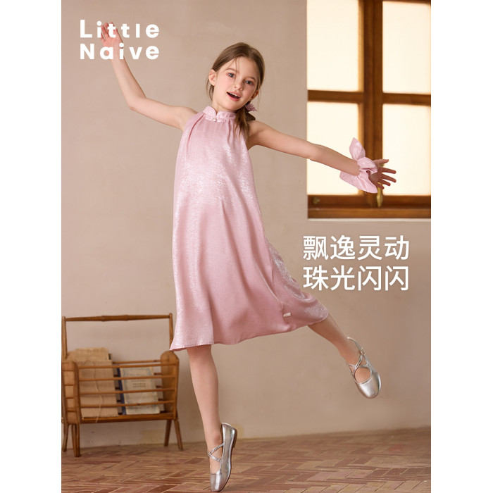 Little Naive兒童新中式連衣裙夏季新款掛脖旗袍裙女童閃閃裙子