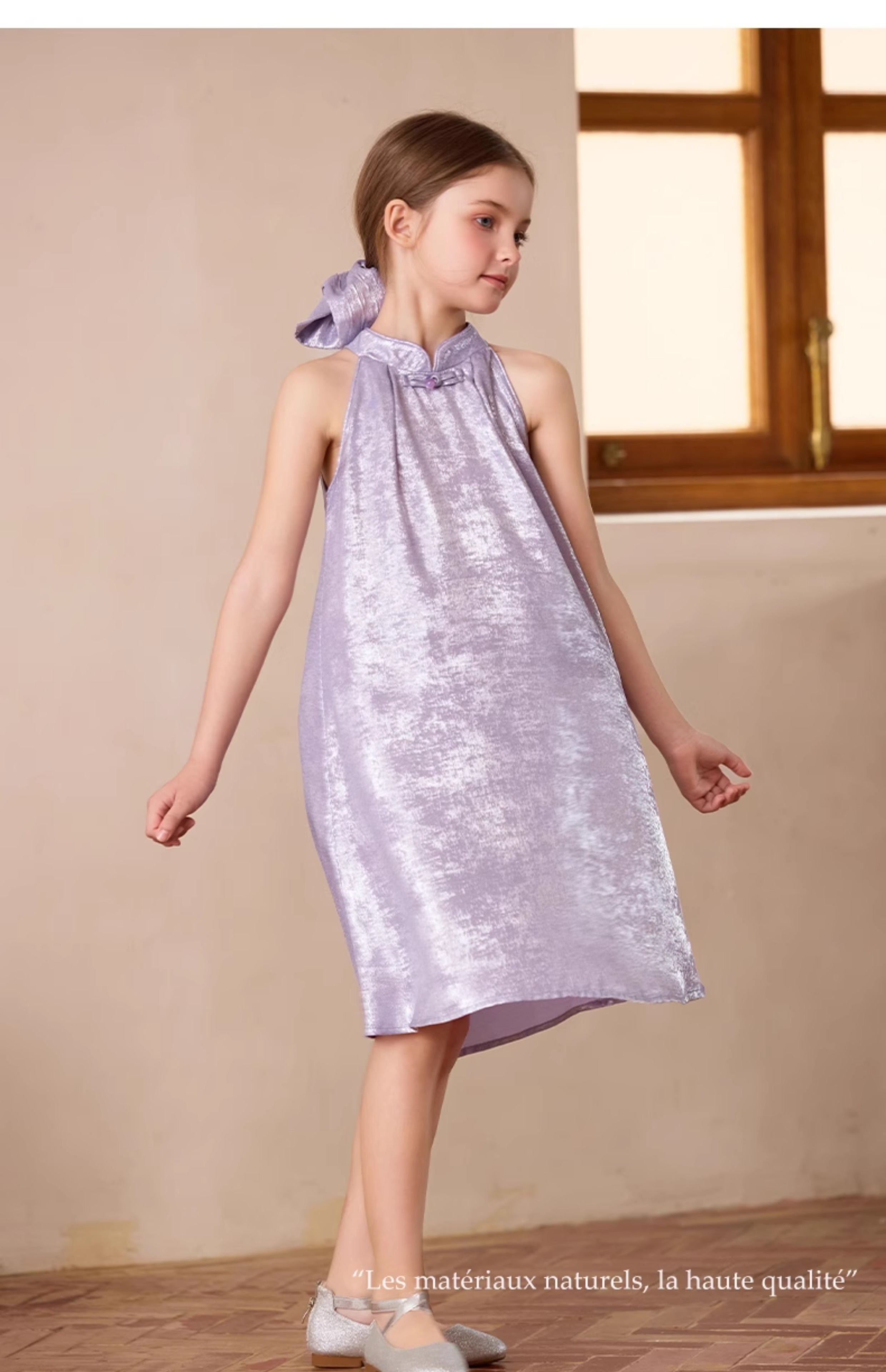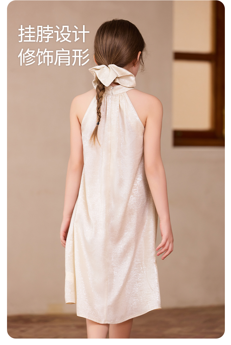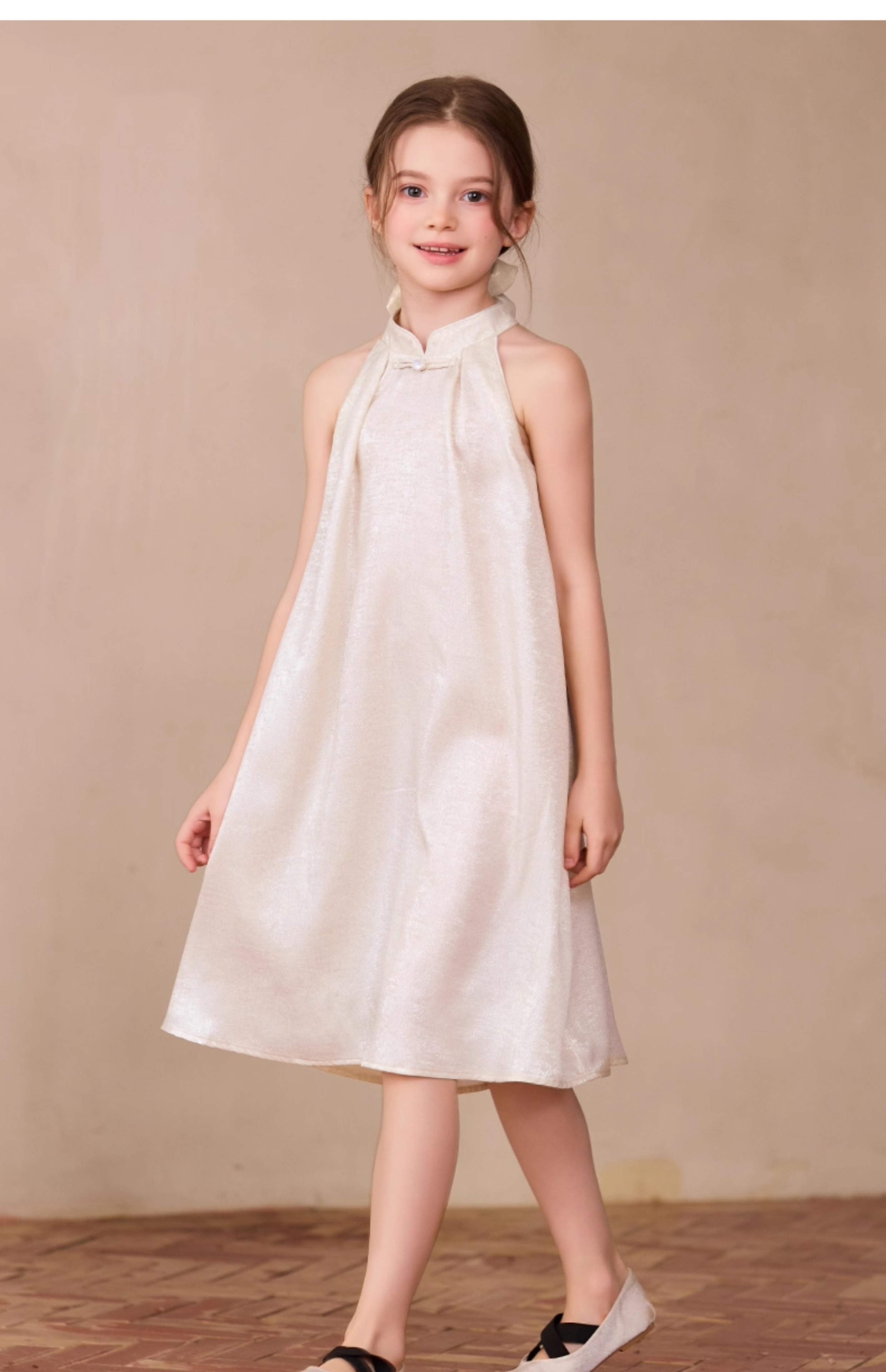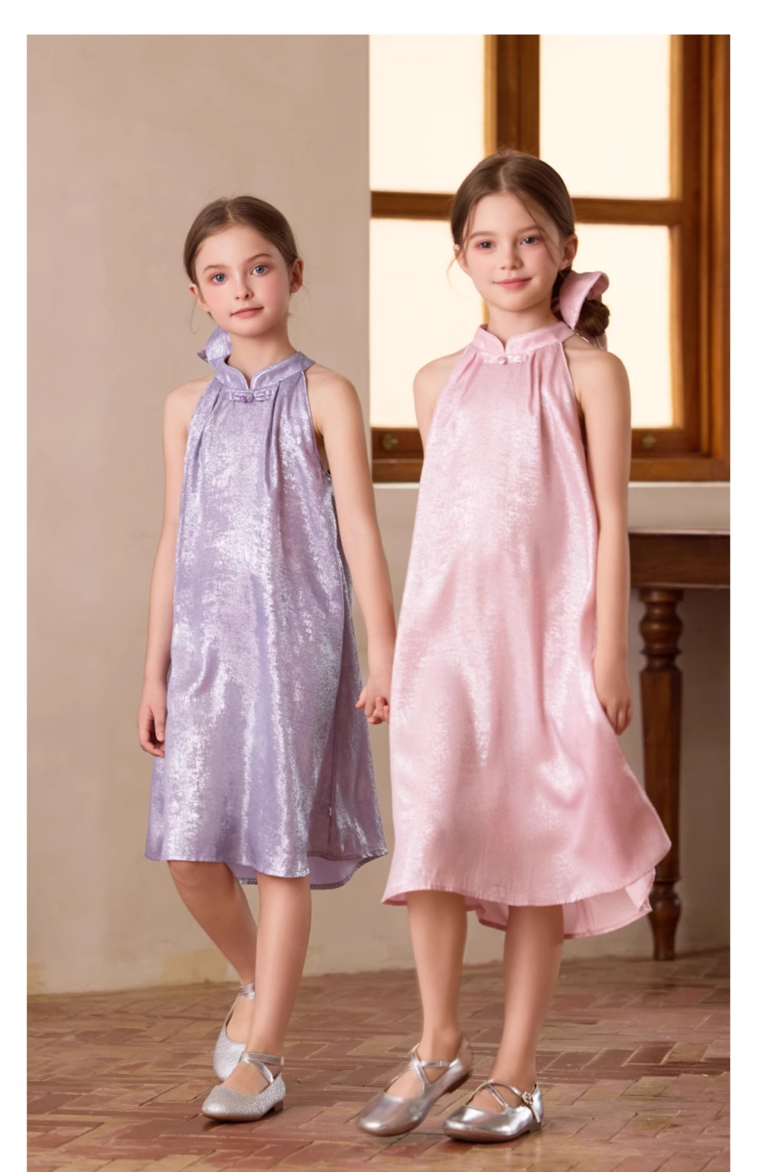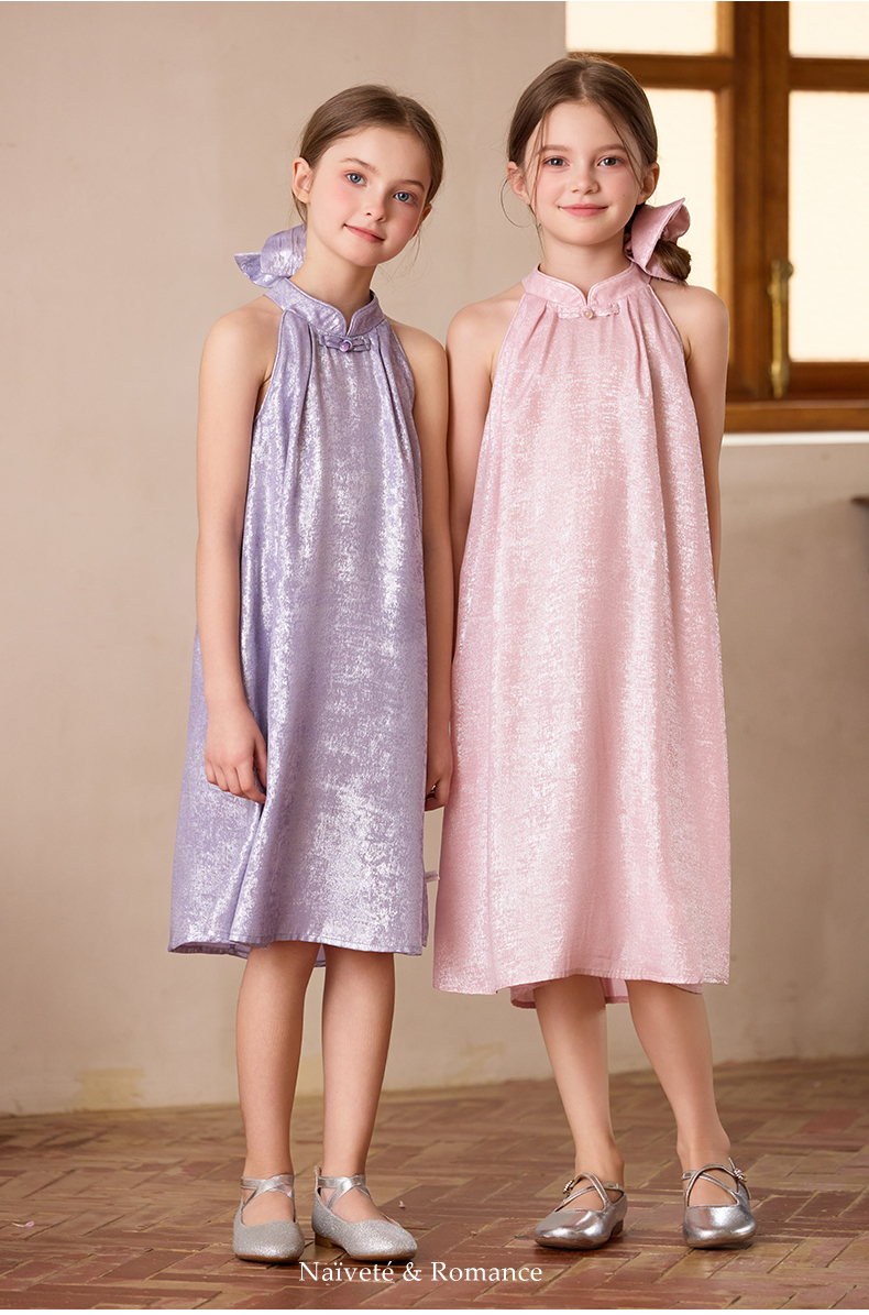 Little Naive兒童新中式連衣裙夏季新款掛脖旗袍裙女童閃閃裙子