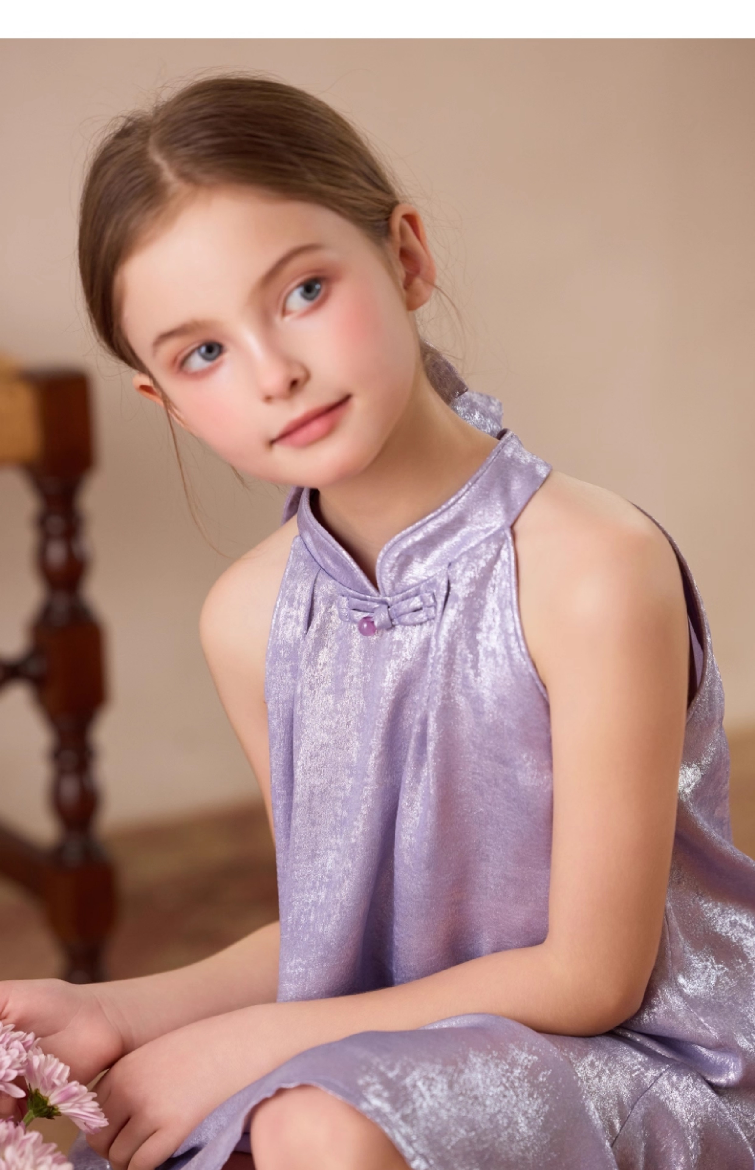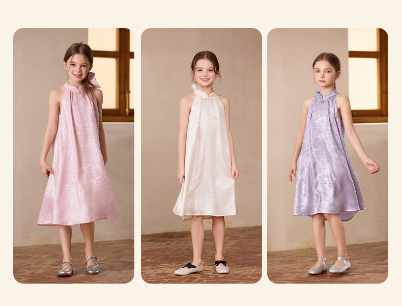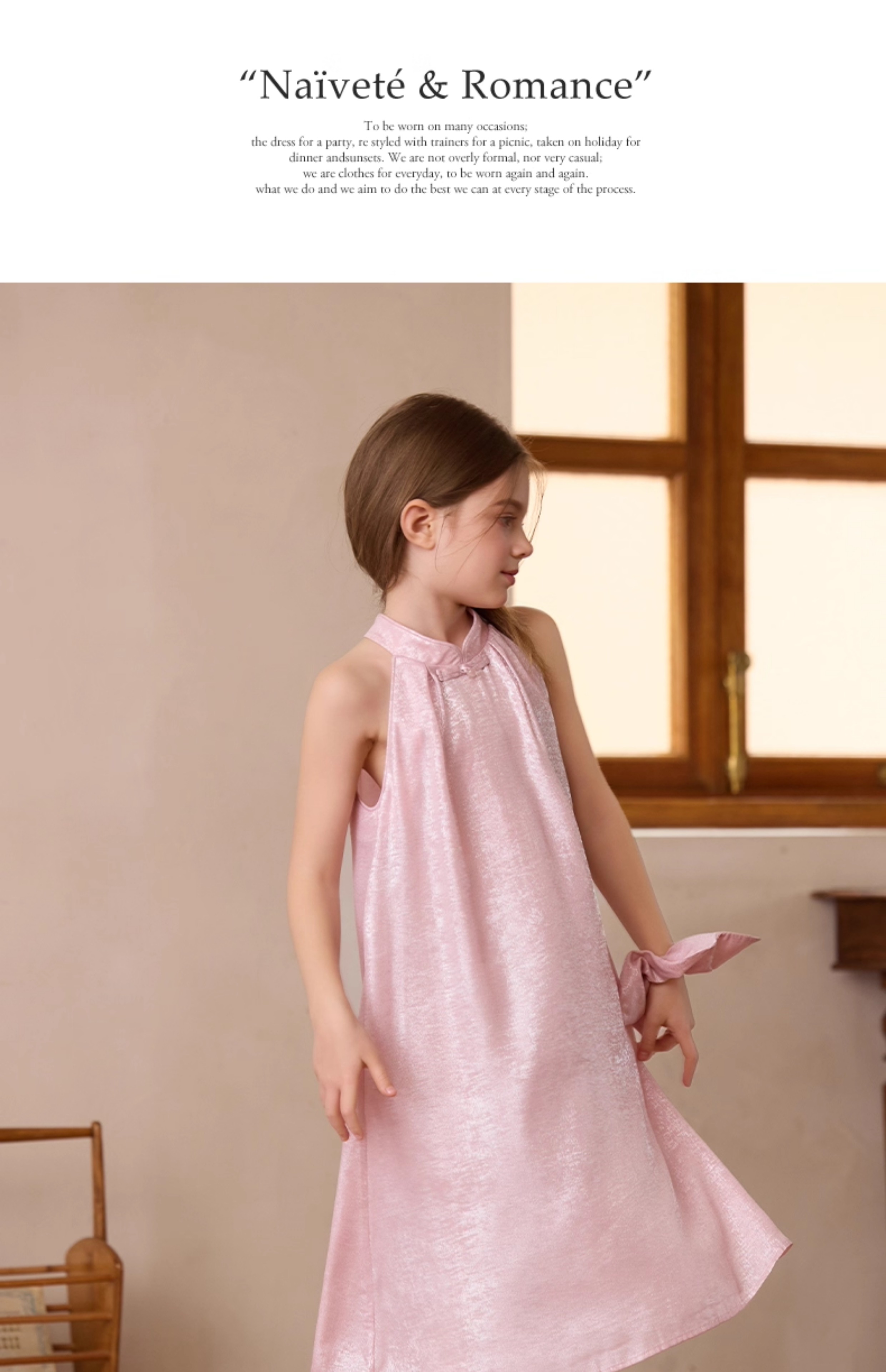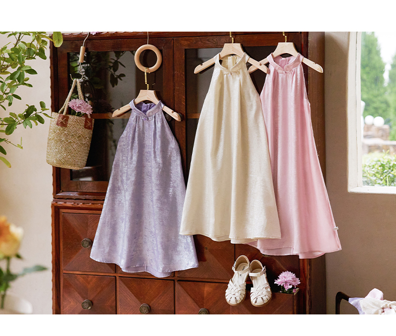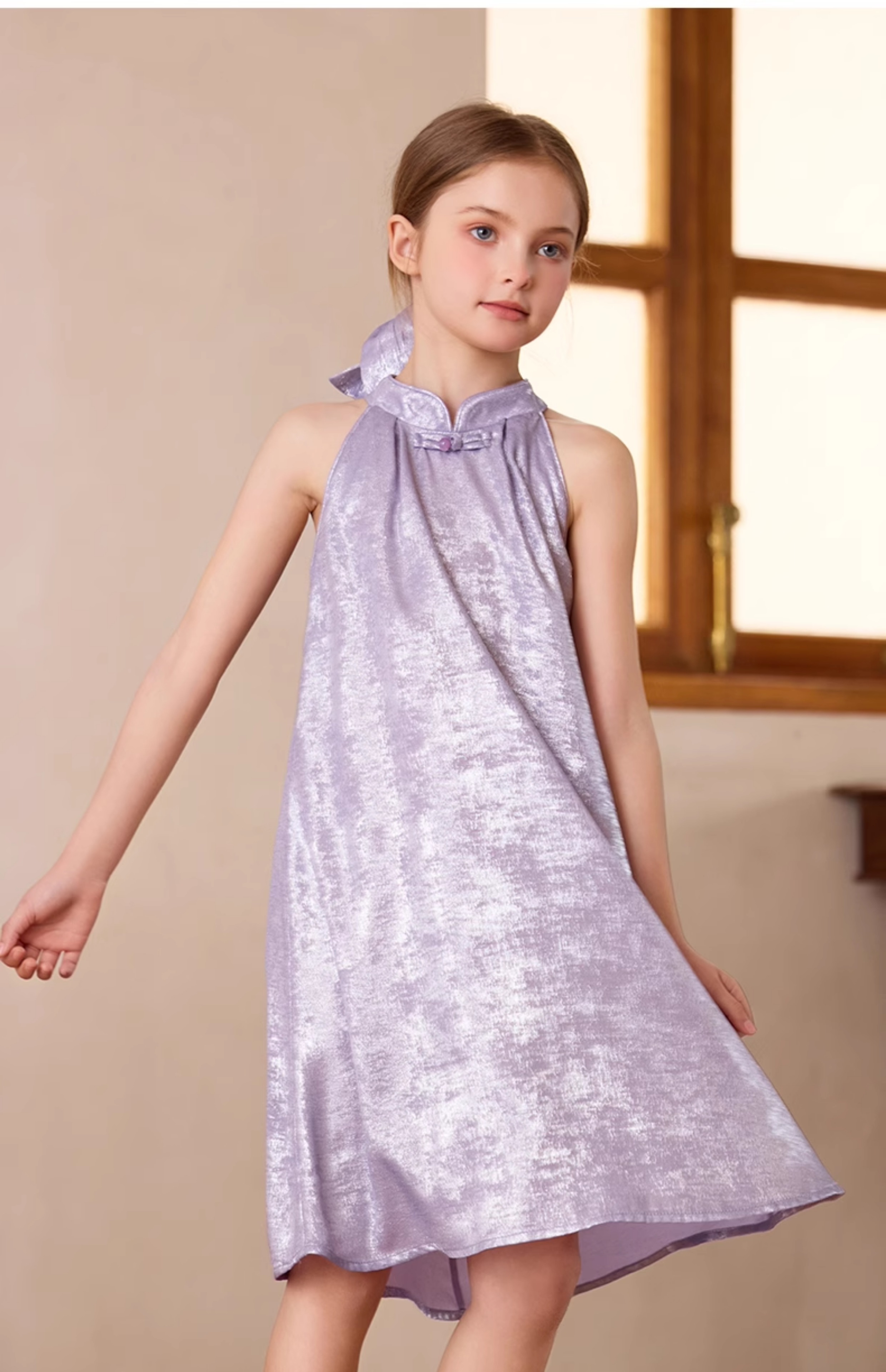 Little Naive兒童新中式連衣裙夏季新款掛脖旗袍裙女童閃閃裙子