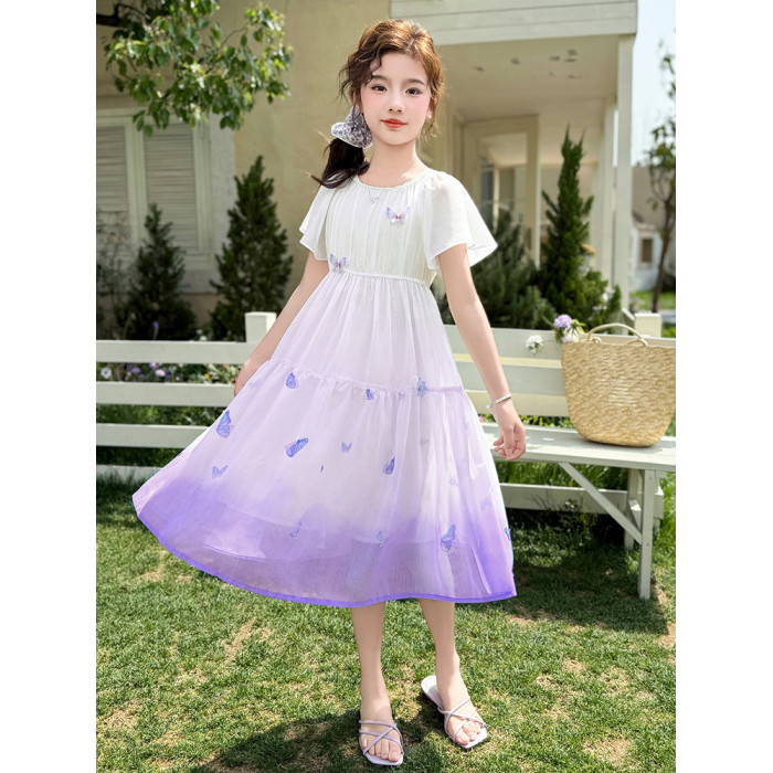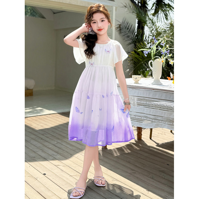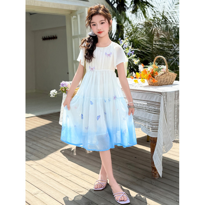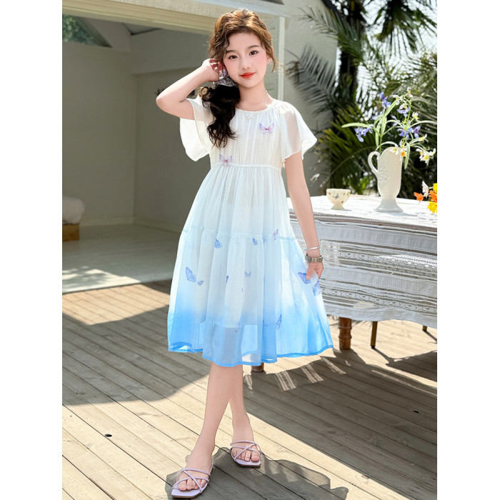 女童連衣裙2025新款夏裝中大女孩蝴蝶漸變色雪紡長裙超仙兒童裙子