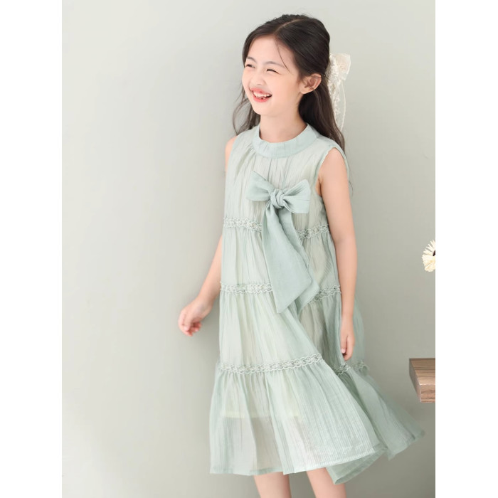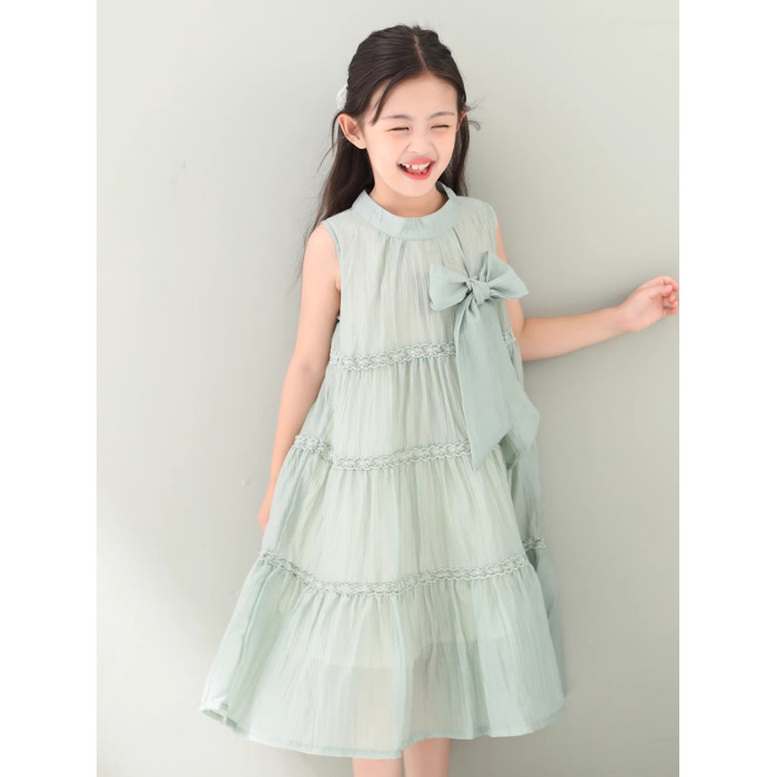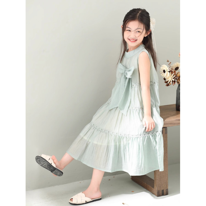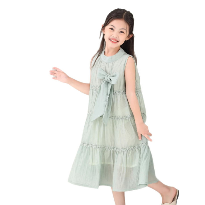 女童連衣裙2025夏季兒童蝴蝶結系帶壓皺雪紡韓版甜美掛脖連衣裙
