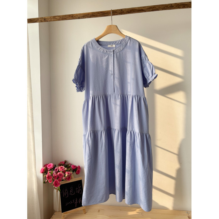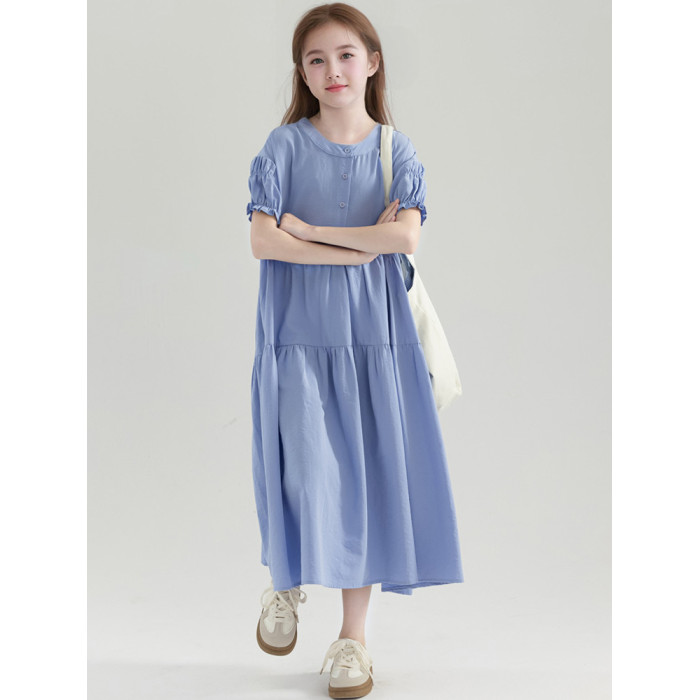 夏季女童藍色長款文藝簡約冰絲薄款連衣裙 童裝新品裙子 中大兒童