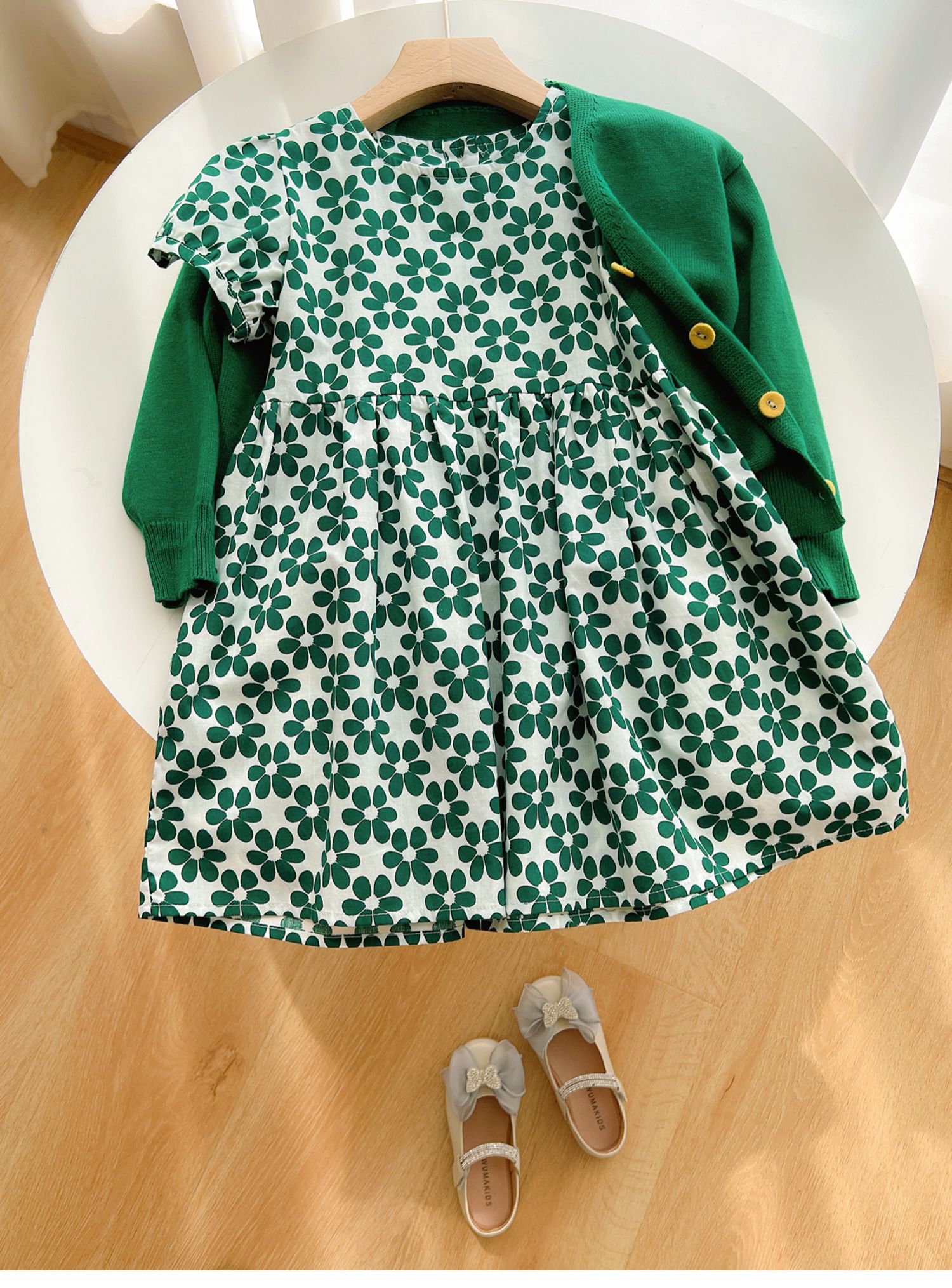 綠六瓣花連衣裙