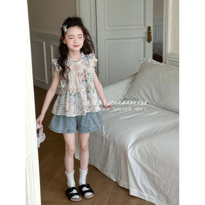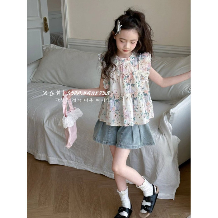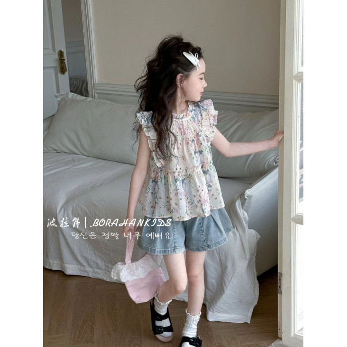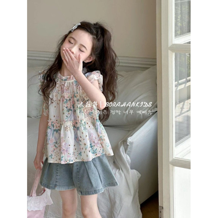 女童法式小飛袖襯衫夏季童裝2025小女孩碎花娃娃衫中大童甜美短袖